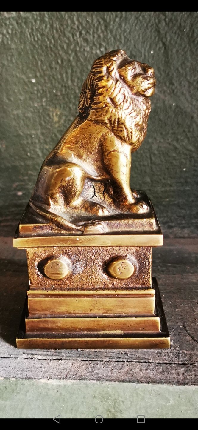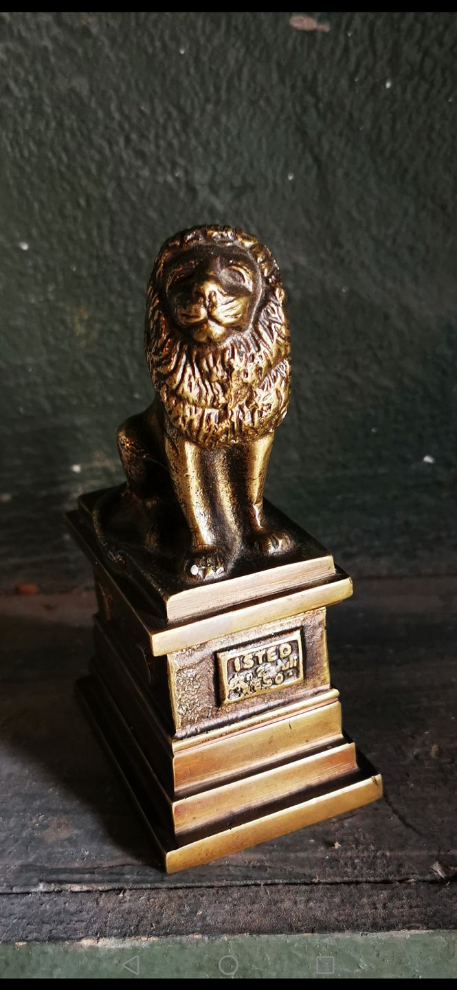 Mindre (tung) figur af Istedløven i broze. Udført af billedhugeren H. W. Bisssen 1859-60 til minde om slaget ved Isted Hede i 1850. Fremstår i god stand. Formodes produceret omkring 1900. Mål: H. 13½ cm basen mål er 5½ x 7½ cm,