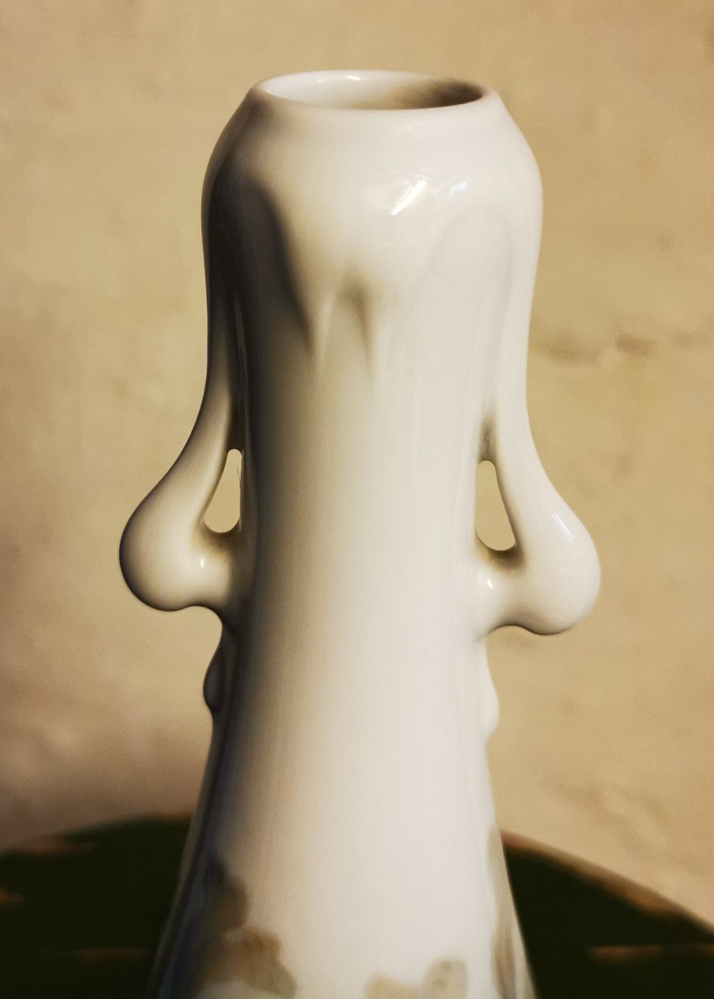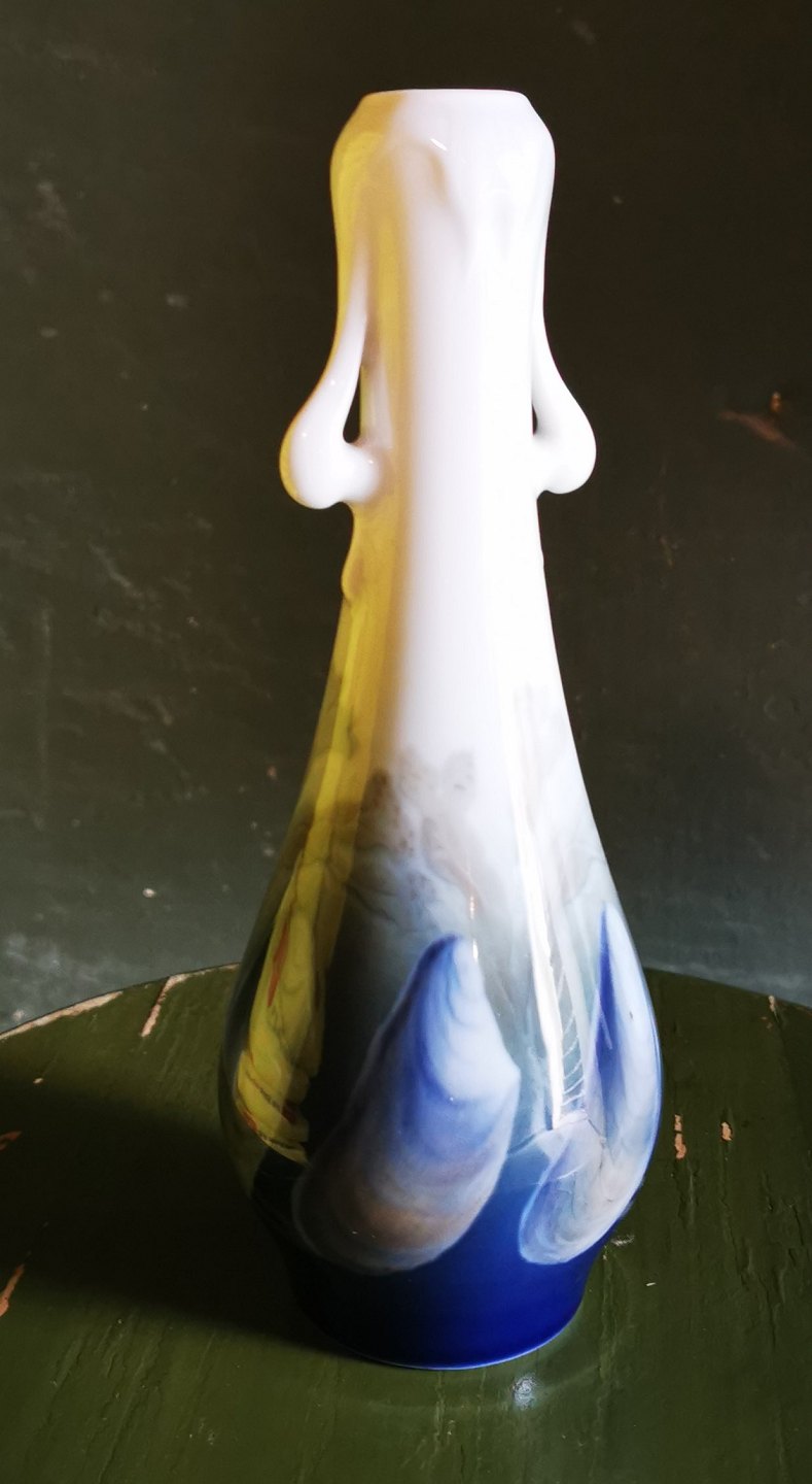Høj Slank dråbeformet vase i porcelæn med par hanke. Dekoreret med muslingeskaller rundt om vasen. Fremstillet omkring 1910. Fremstår i perfekt stand. Fabriksmærket på bunden med PORSGRUND NORGE. H. 22 cm.