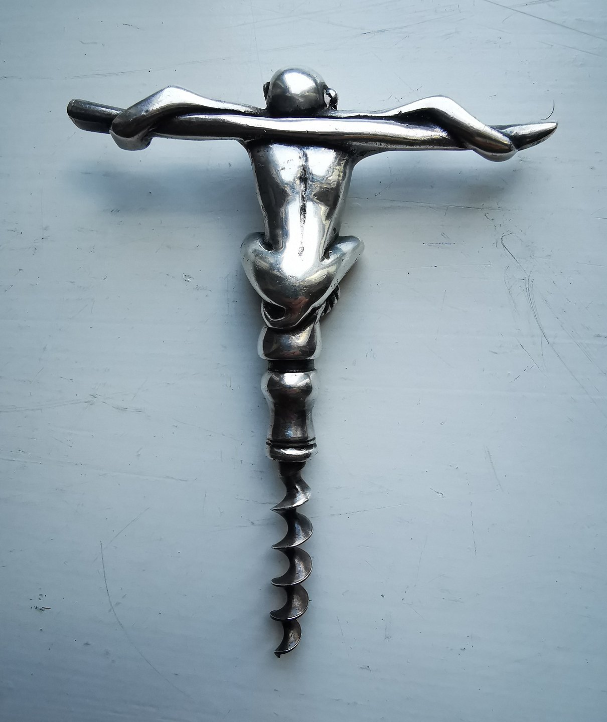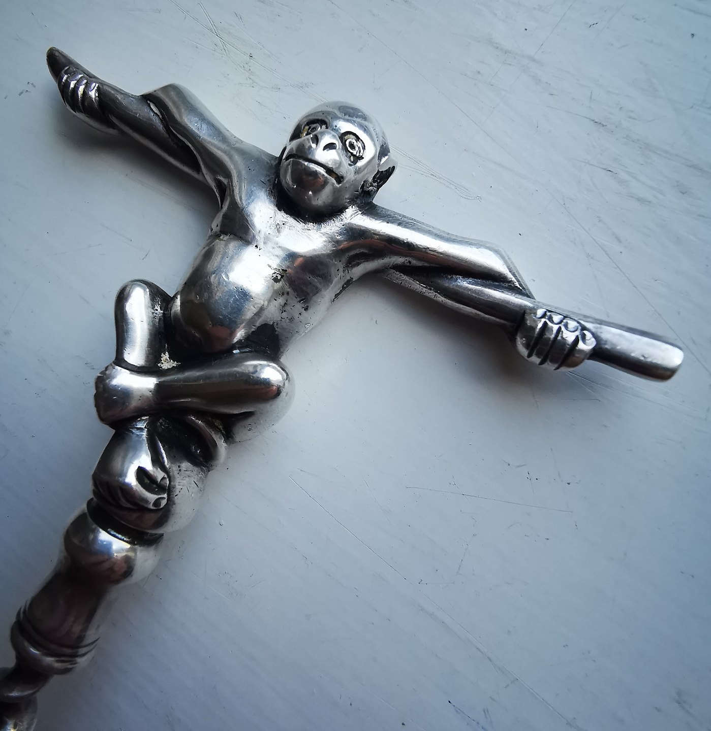 Figurativ proptrækker med abe, der sidder afslappende på en kugle. Flot kvalitet. Kraftig sølv-belægning. Ingen steder slidt igennem. I virkelig flot stand. Ikke fabriksmærket, men forventes at være fremstillet i Danmark i 1930´erne. Lignende proptrækker findes i bronze. Mål: H. 12½ cm, 9½ cm bred.