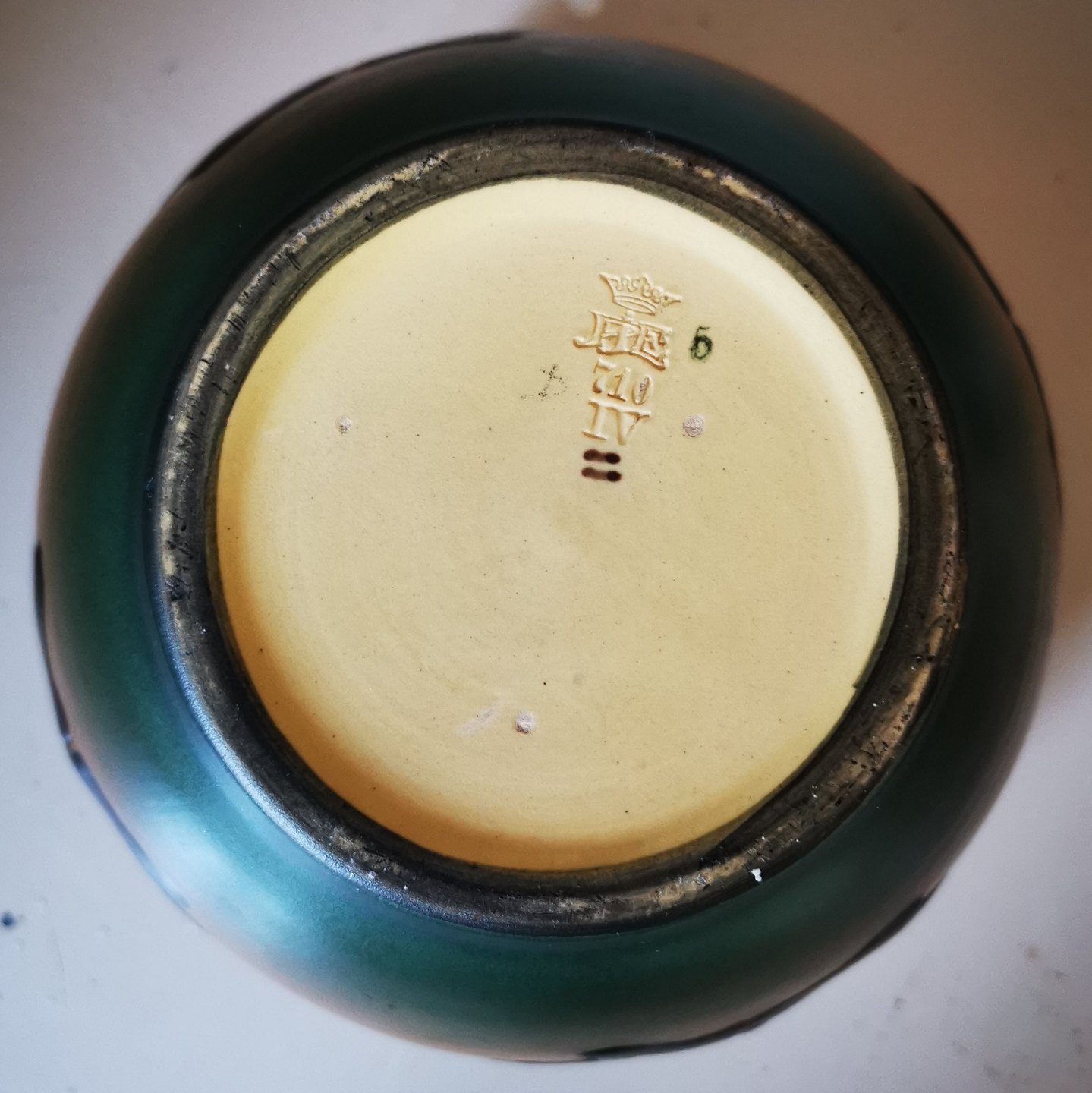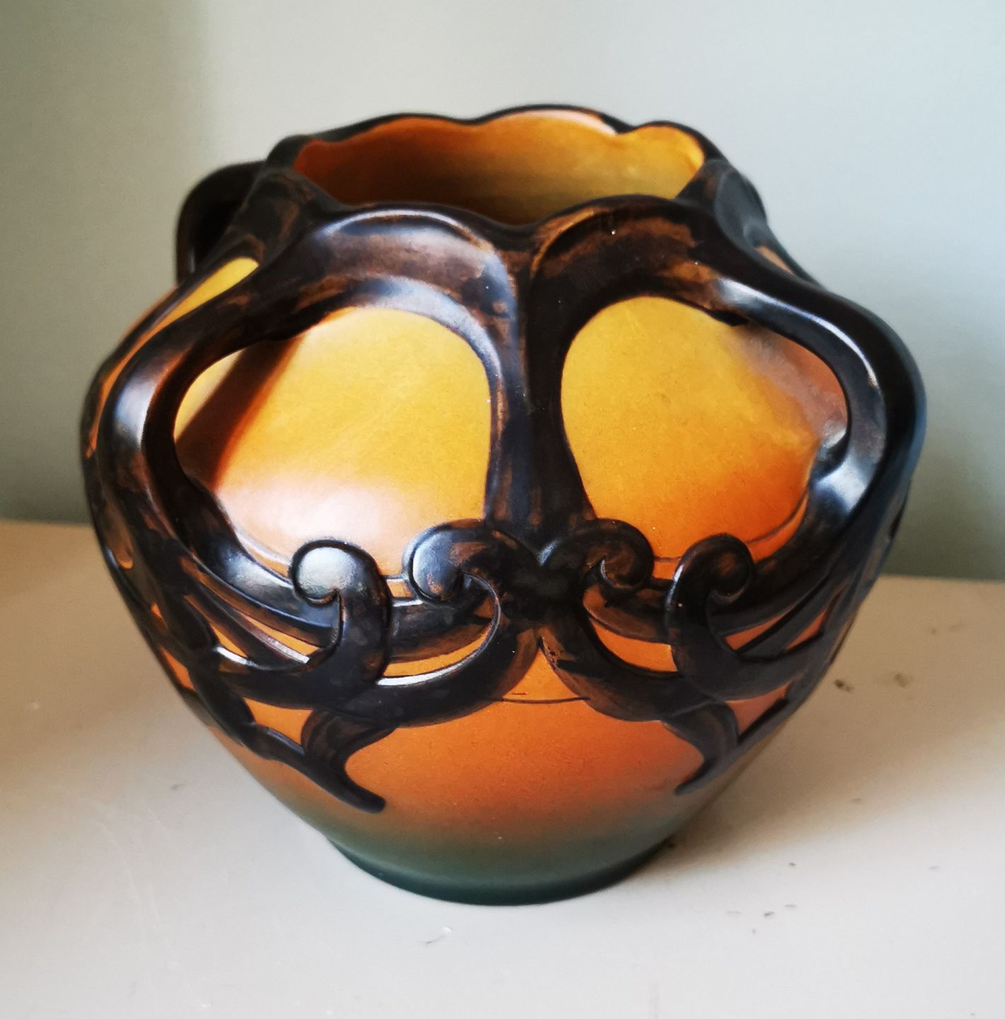 SKØNVIRKESTIL: Krukke i keramik fra den københavnske lervarefabrik Peter Ipsens Enke. Formgivet af Karen Hagen i 1909. Orange med sort ornamentik i relief samt dekorative hanke. Fremstår i absolut perfekt stand. Fabriksmærket på bunden med bl.a modelnummer 710. Mål: H. 16½ cm.