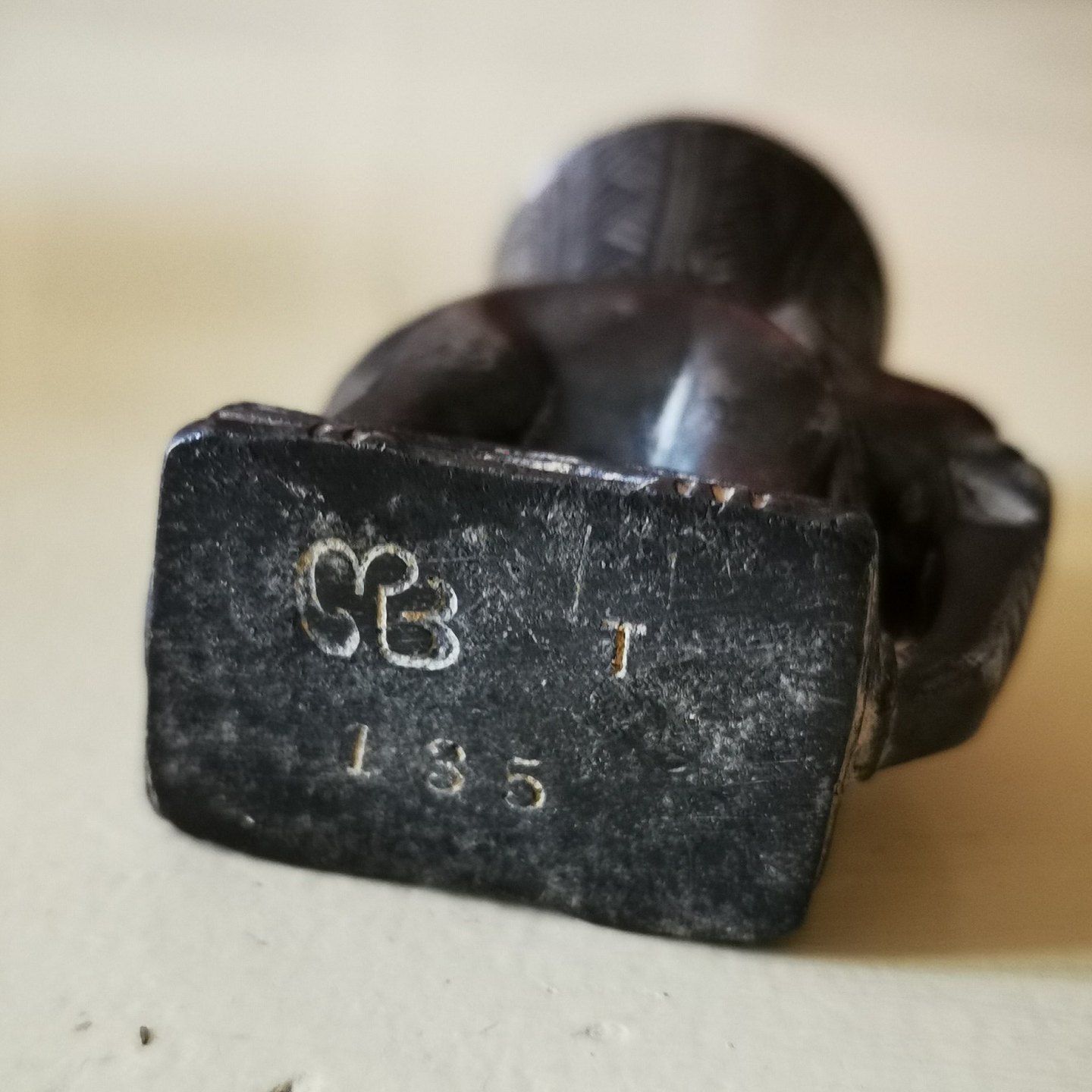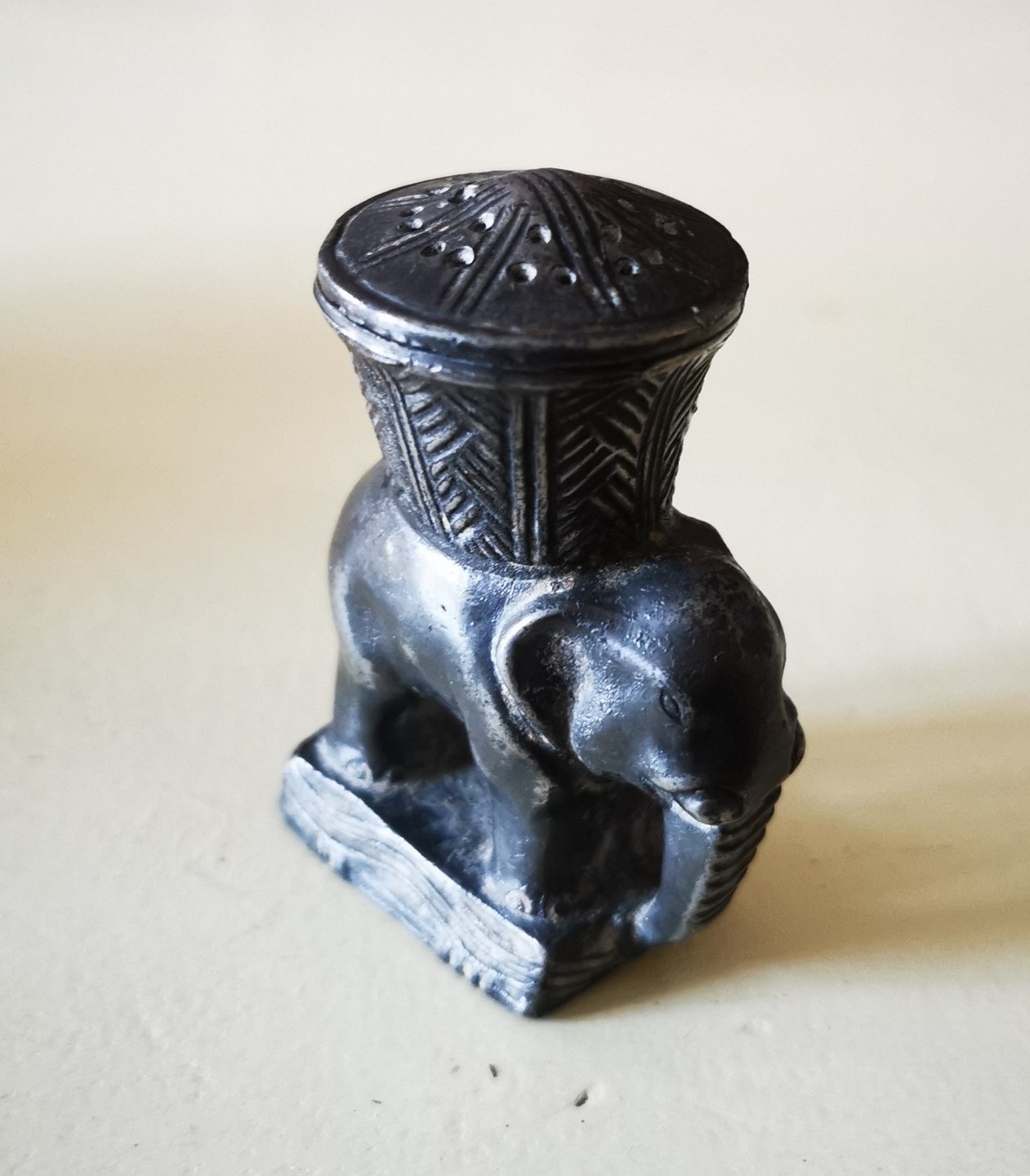Mogens Ballin (1871-1914): Strøbøsse ovenpå figur af elefant. Støbt i ét. Toppen kan skrues af. I god stand. Fabriksmærket på bunden med MB for Mogens Ballin samt modelnummer T135. H. 7 cm.