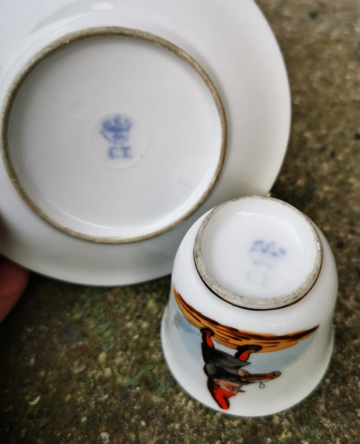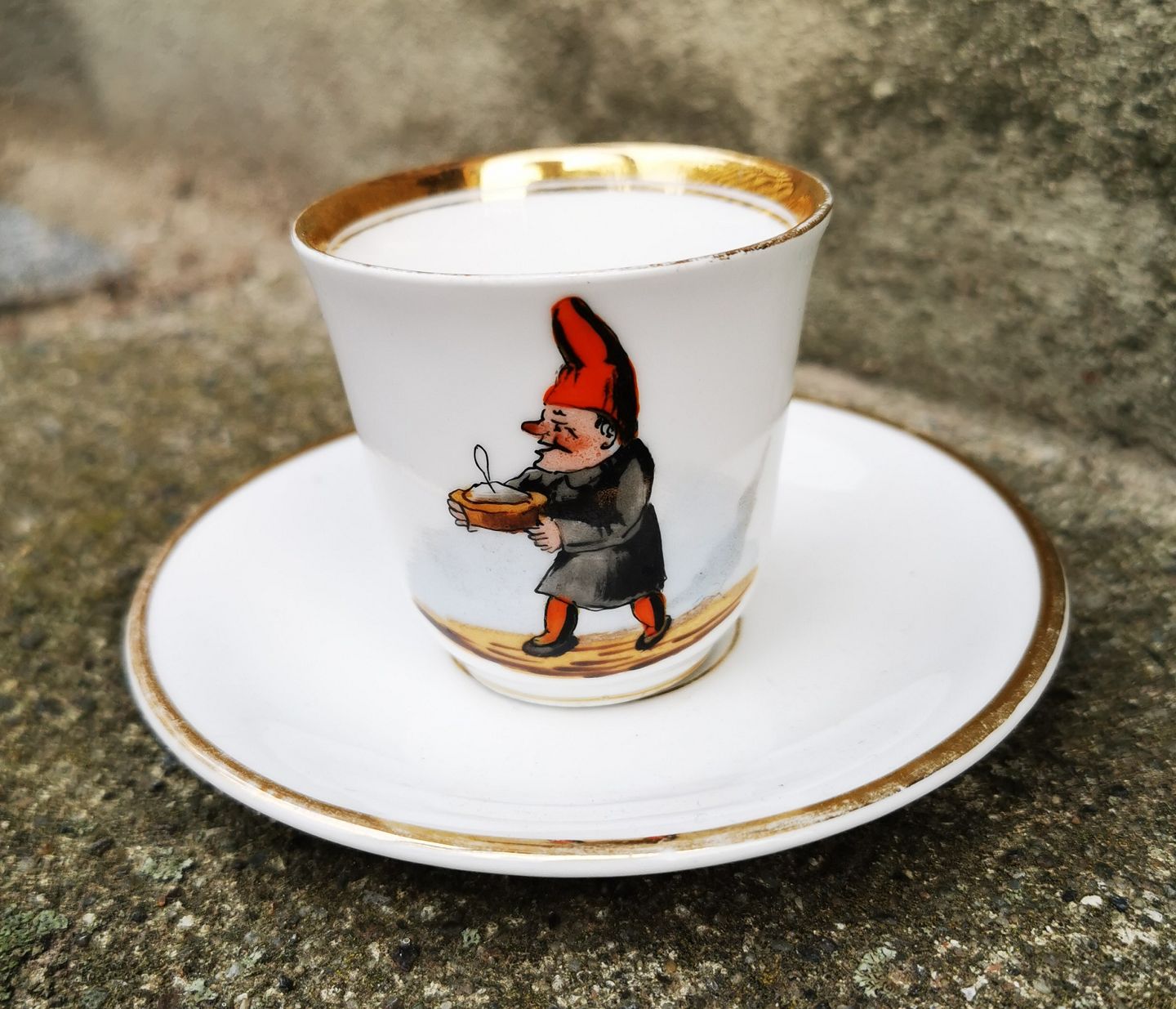 Lille moccakop i porcelæn fra C.T. Dekoreret med nisse gående med sin rissengrød ! I god stand. Ingen skader eller reparationer. Fremstillet omkring 1900. Koppen er 5½-6 cm høj og underkoppen 11½ cm i diameter.