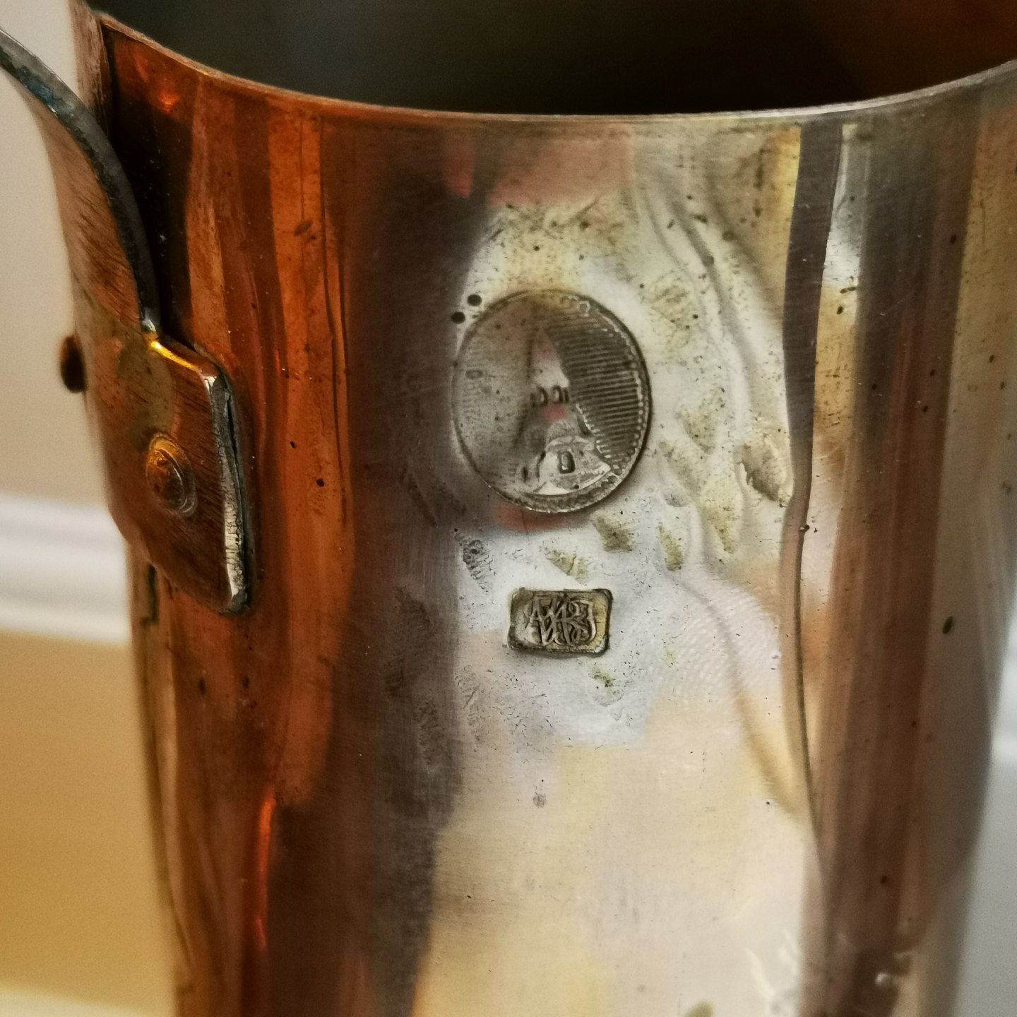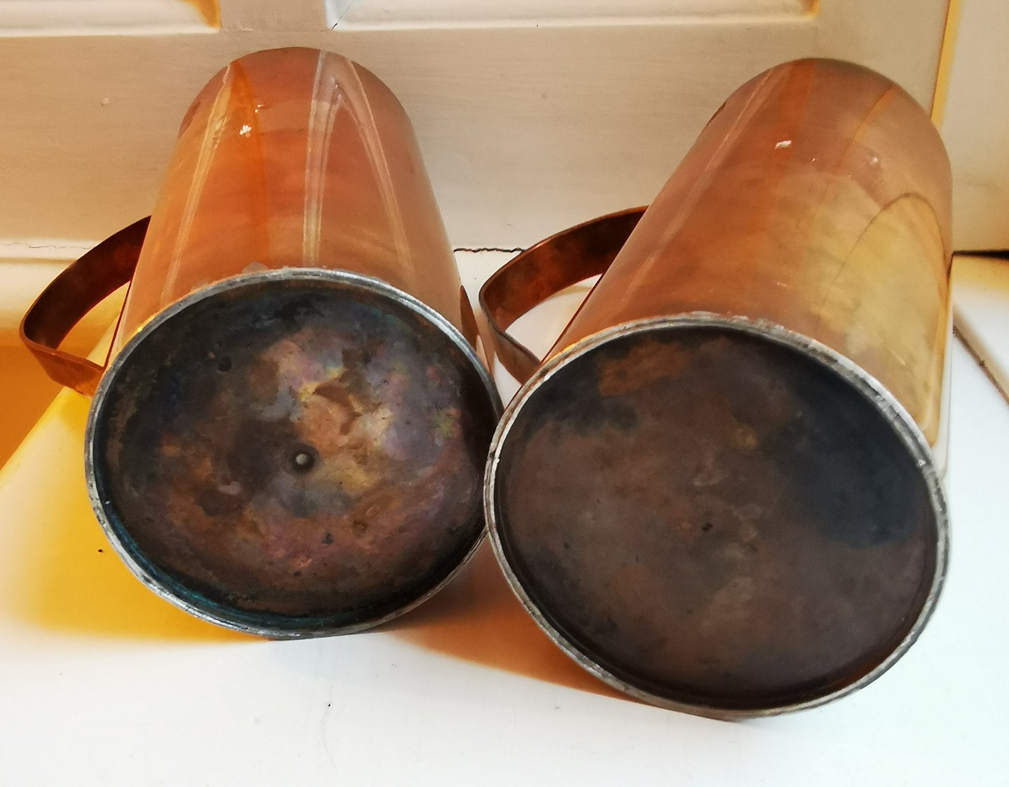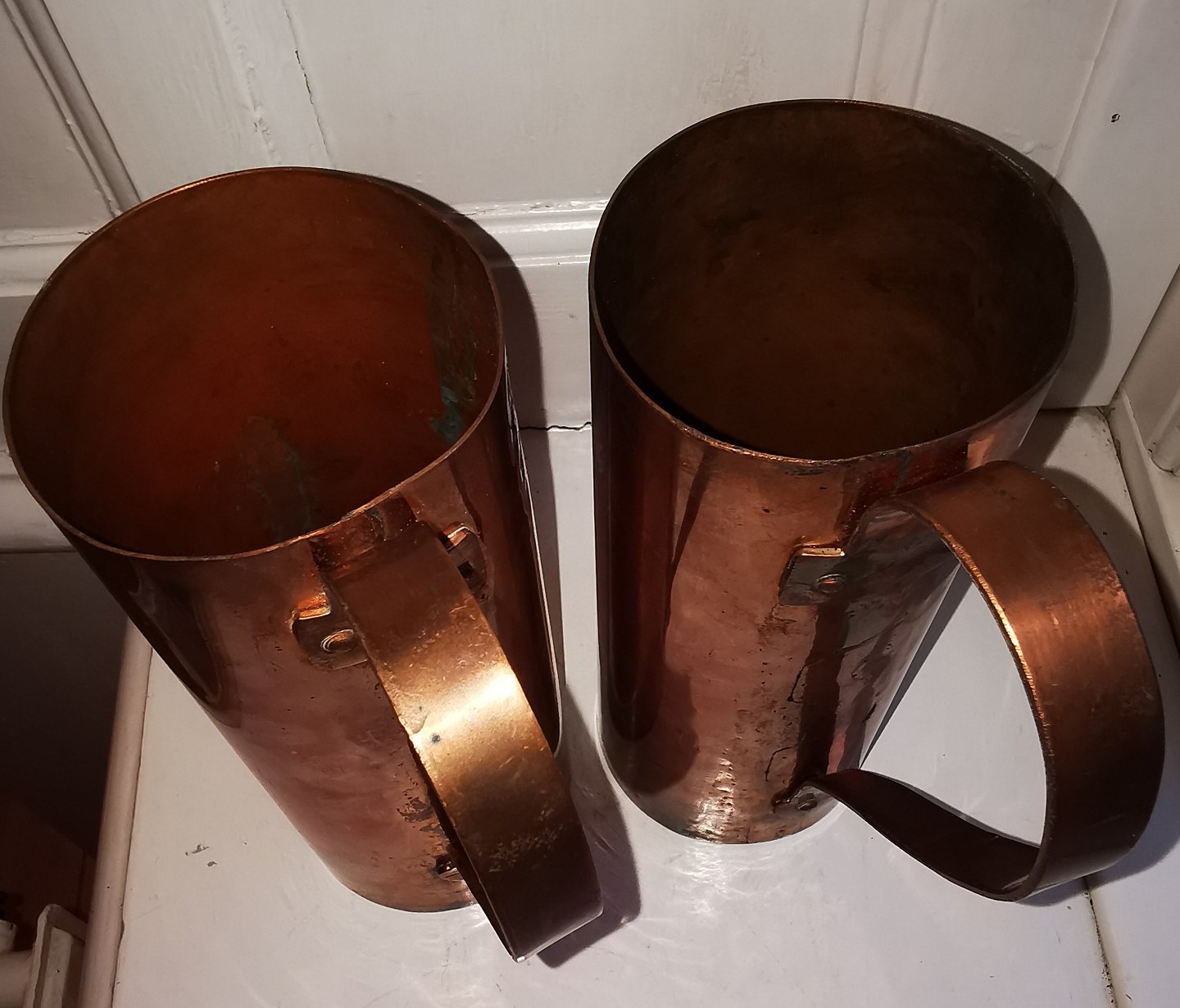 Par høje slanke cylinderiske målebægere med hanke. Fremstillet i 19. århundrede. Begge i god stand. Fine stempler. H. 20-20½ cm.