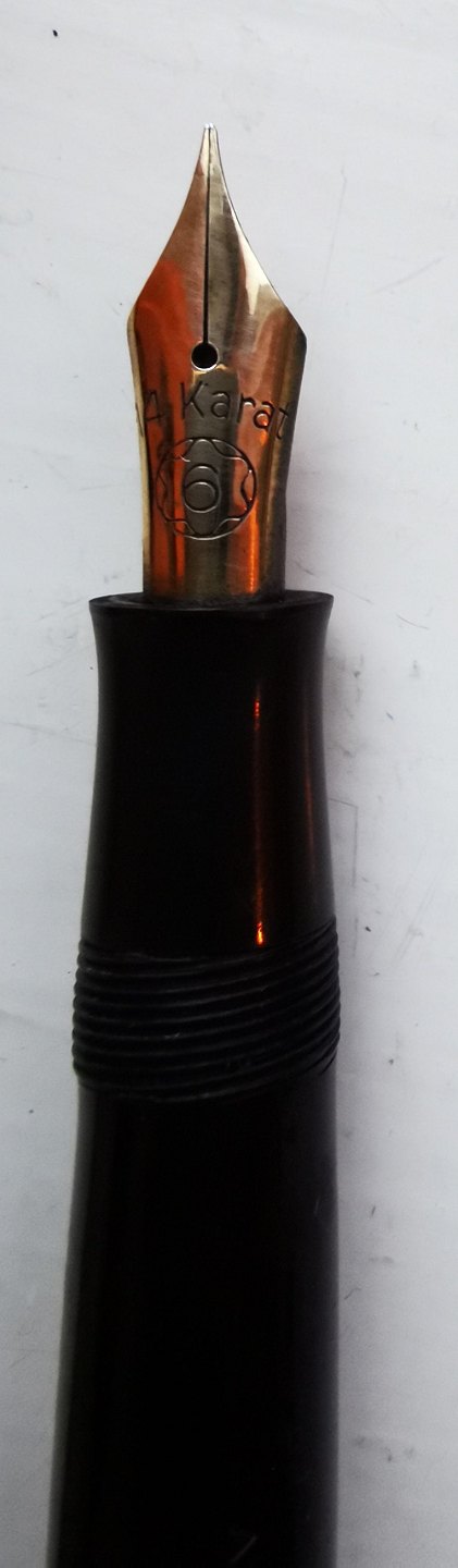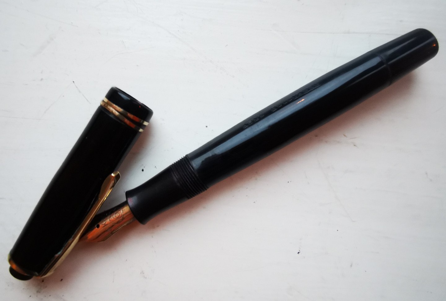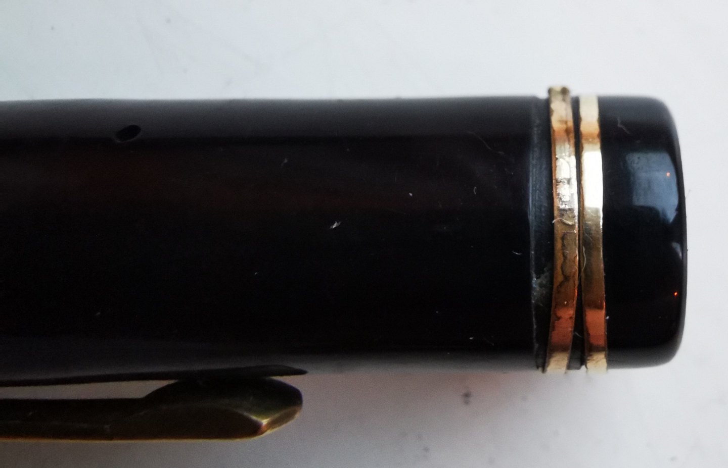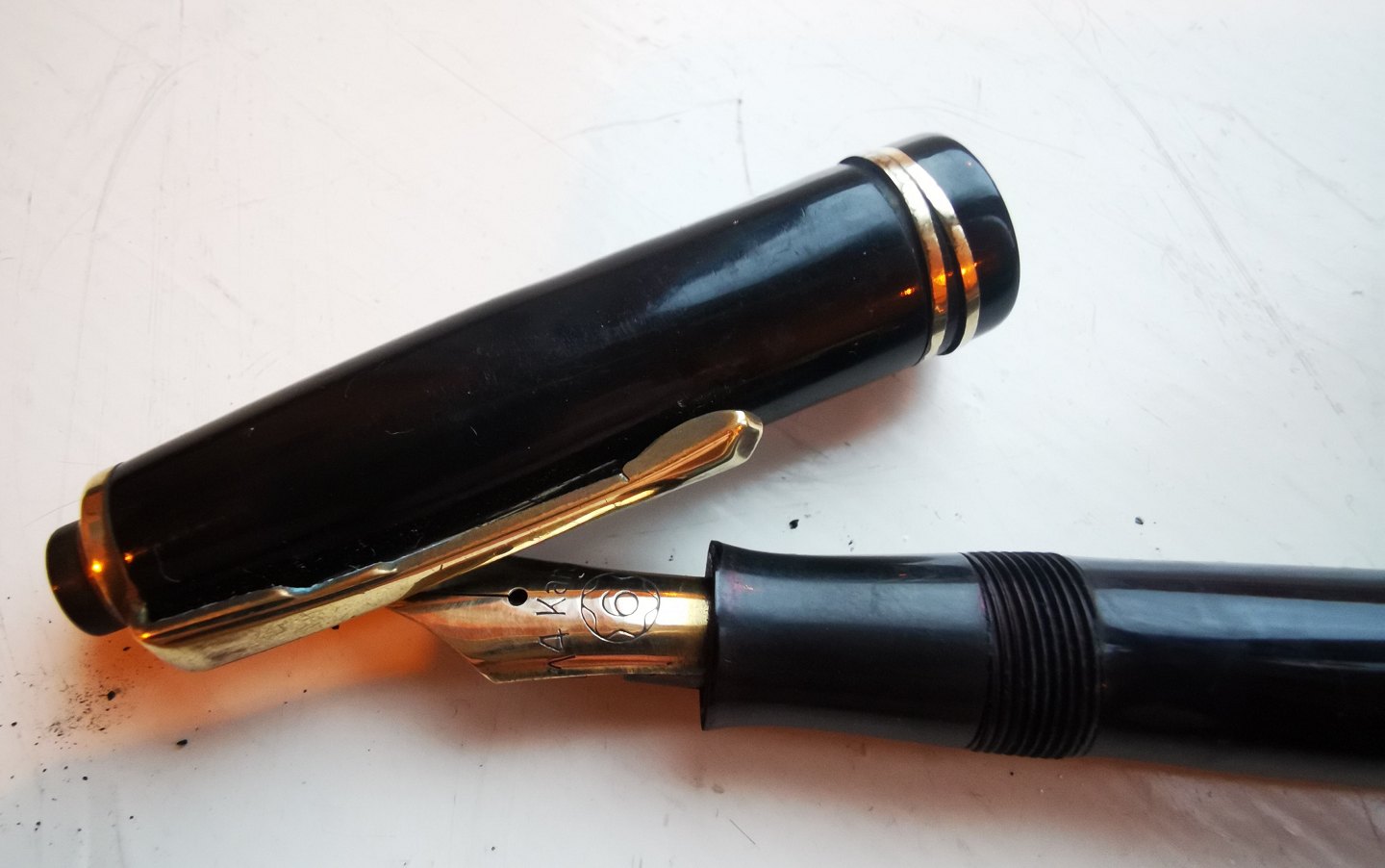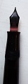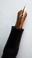 Sort Montblanc # 226 fyldepen. Fremstillet i Danmark i 1940´erne. Fremstår i god stand uden skader eller reparationer. Bemærkninger: Det ene mavebælte sidder løst. Indgraveret personligt navn: Arne Hollnagel. Der skal isættes ny gummisæk før fyldepennen fungerer igen. L.: 12½-13 cm. Koster kr. 325,- såfremt der skal isættes ny gummisæk.