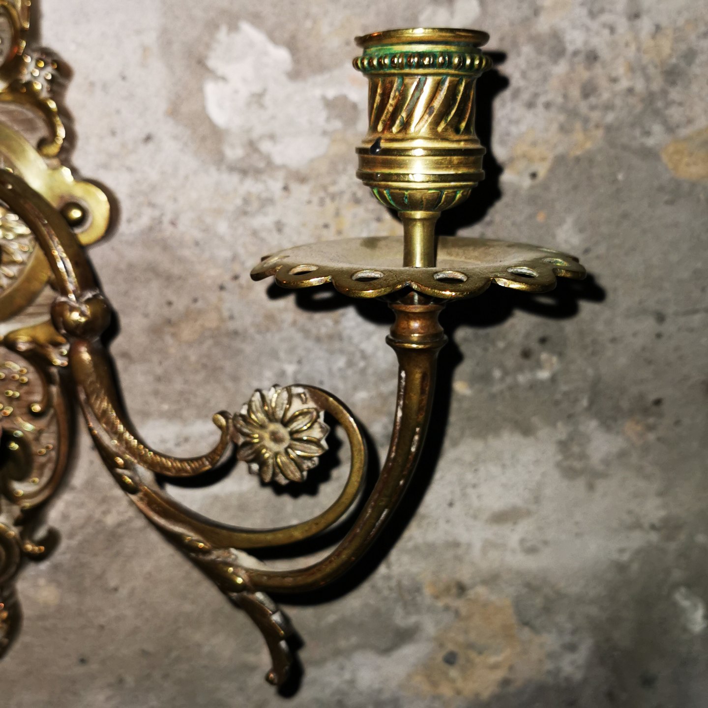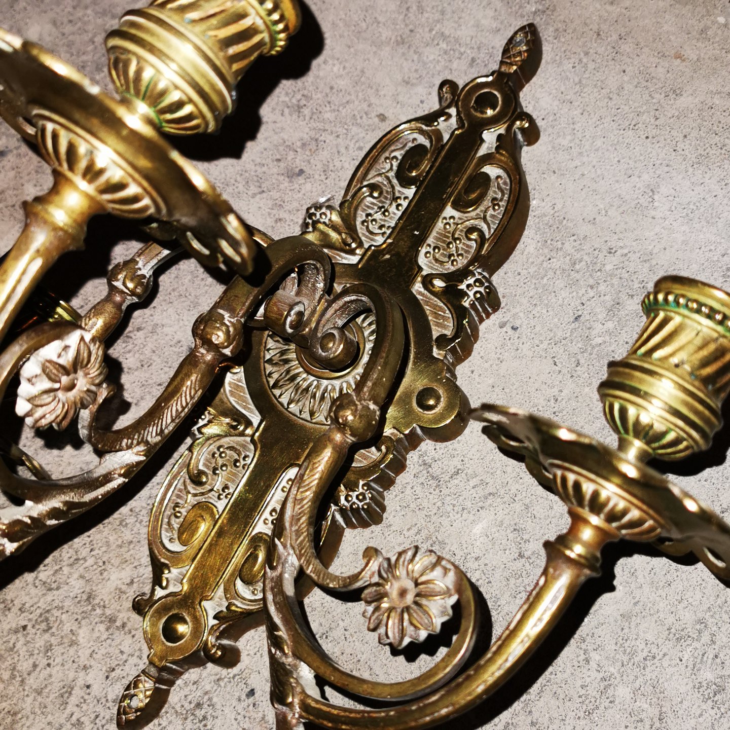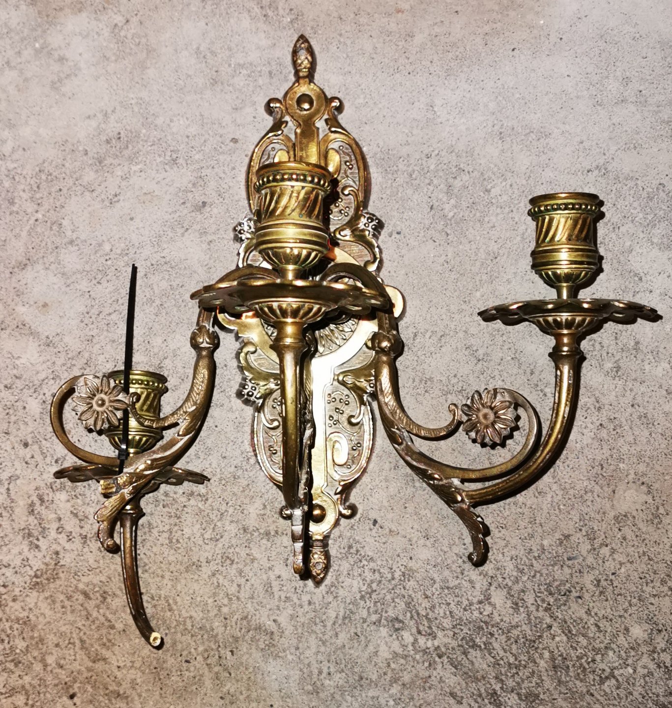 Pair of wall bronze candelabra for three candles. Made in France in the second half of the 19th Century. One light arm broken off, as can be seen from the photos. Otherwise in good condition. Measurements: The back piece is 31� cm. From the wall and out to the front candleholder there are 25 cm.