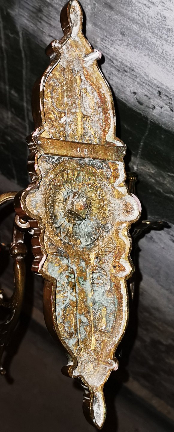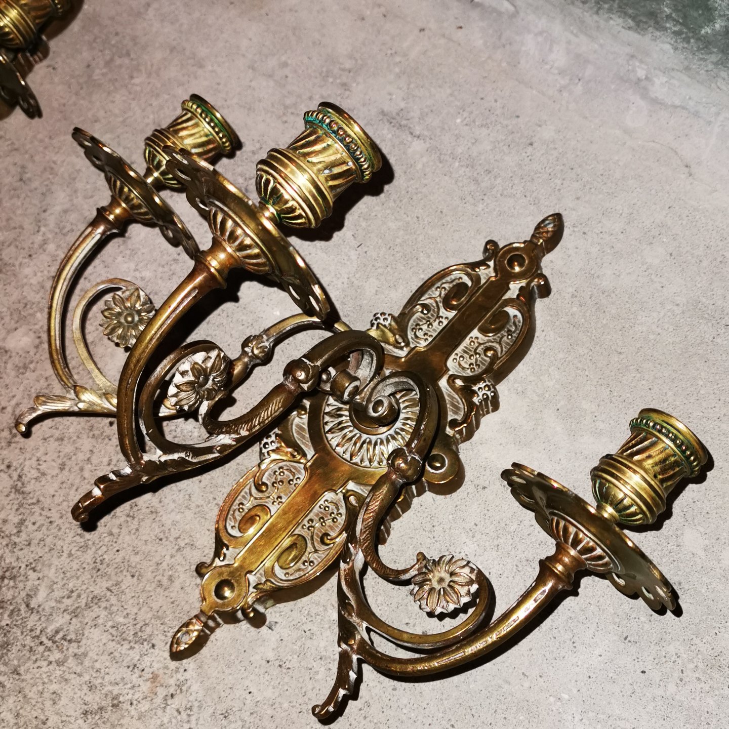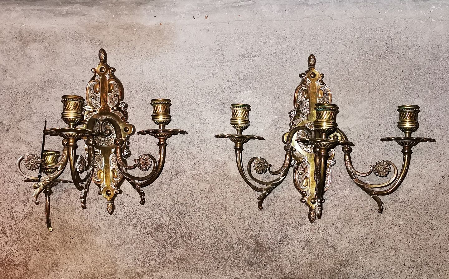 Pair of wall bronze candelabra for three candles. Made in France in the second half of the 19th Century. One light arm broken off, as can be seen from the photos. Otherwise in good condition. Measurements: The back piece is 31� cm. From the wall and out to the front candleholder there are 25 cm.