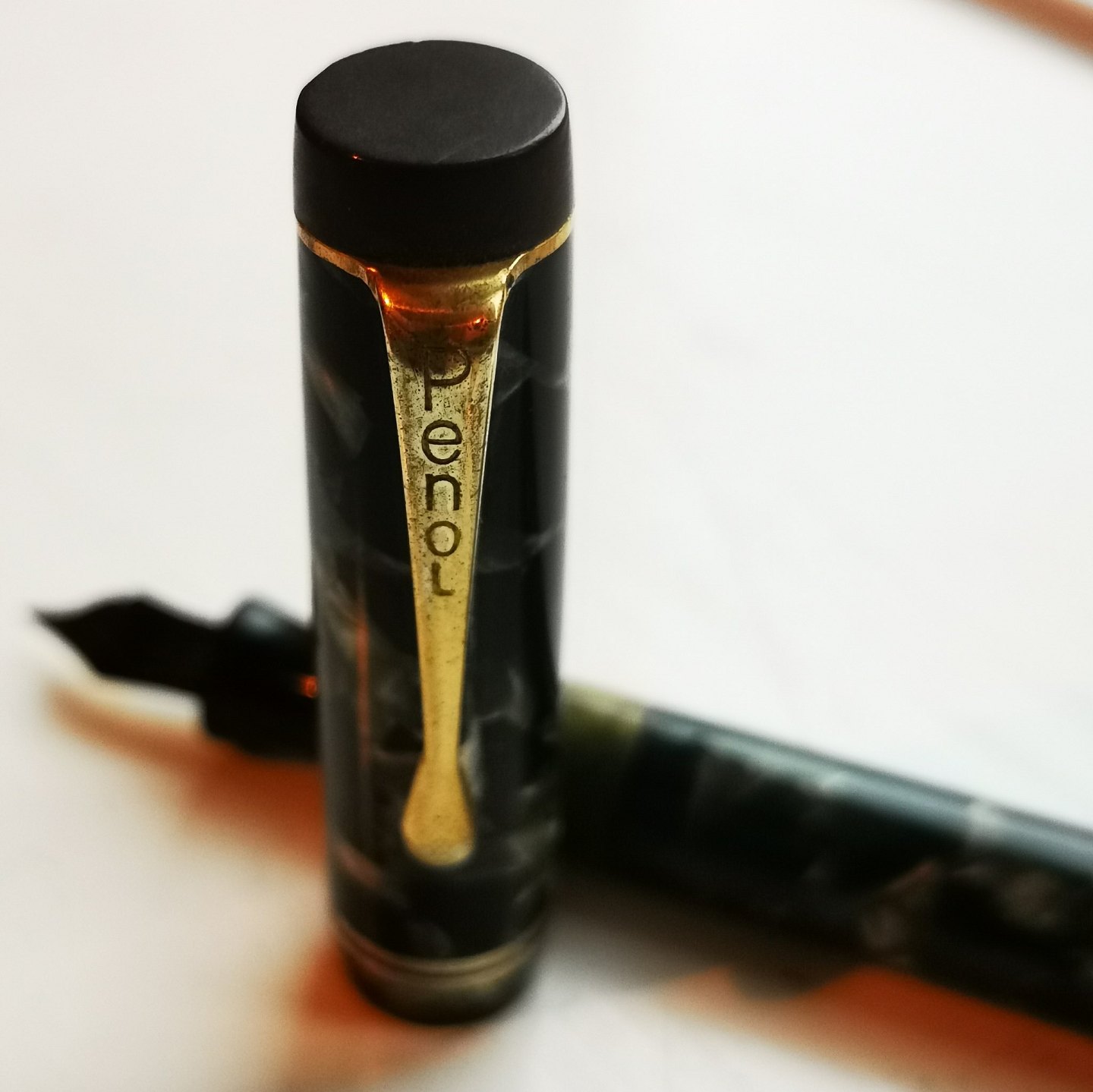 Grøn marmoreret Penol no. 3 fyldepen. Tekst på fyldepennen: PENOL NO. 3. CHR. OLSENS FABRIKKER. KØBENHAVN. PAT. APPLIED. Fremstillet i 1940´erne. Fremstår i god stand uden skader eller reparationer. Ny gummisæk skal indsættes før brug. Ved tillæg på kr. 325,00 kan fyldepennen leveres med ny gummisæk. Alle dele original Skribent inclusive 14 karat guld spids. 13,5 cm lang.
