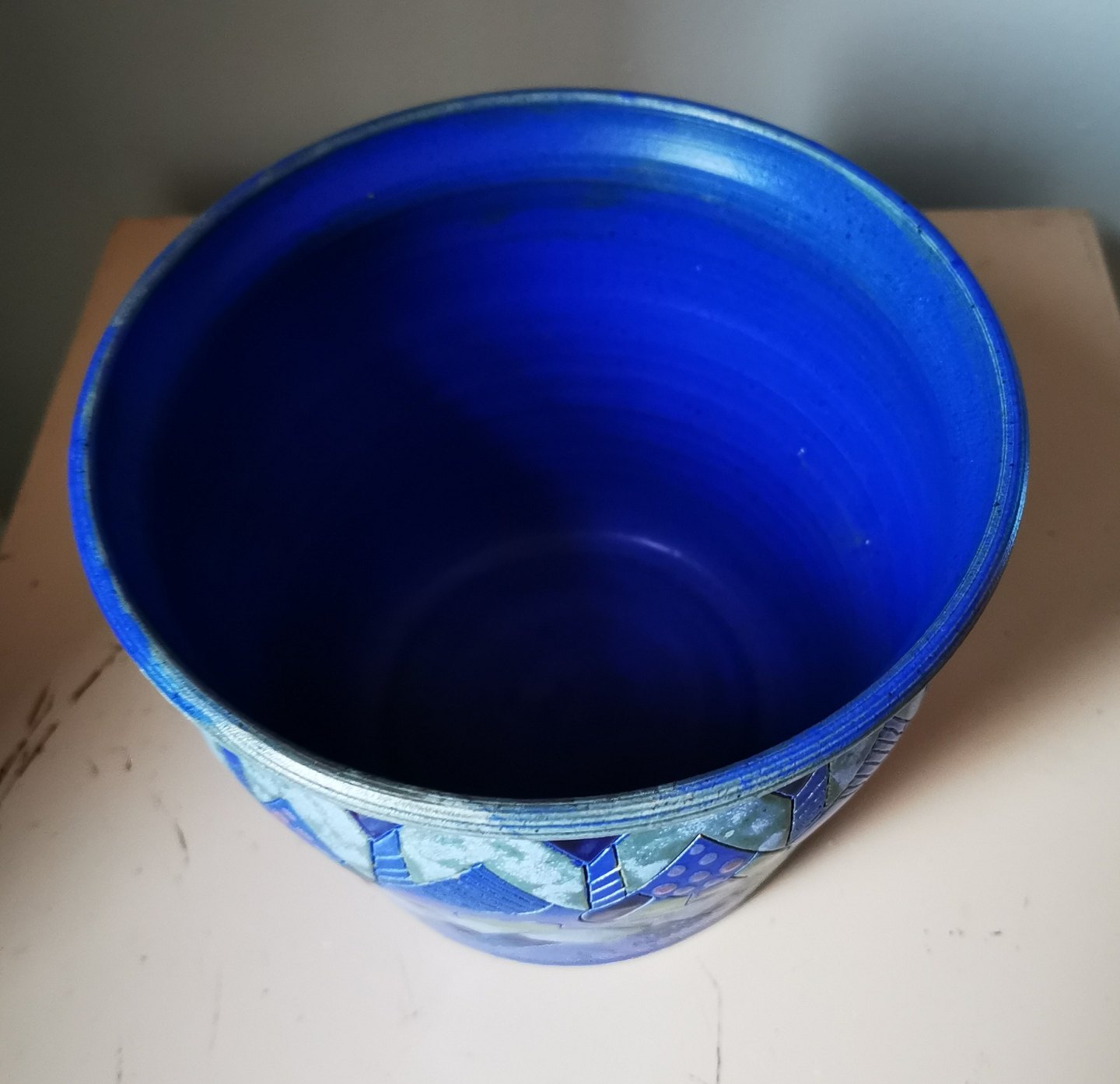 Urtepotteskjuler i keramik af Evelyn Noval. Fremstillet i 1990´erne på Bornholm. Fremstår i god stand. Signeret af kunstneren på bunden. Mål: H.