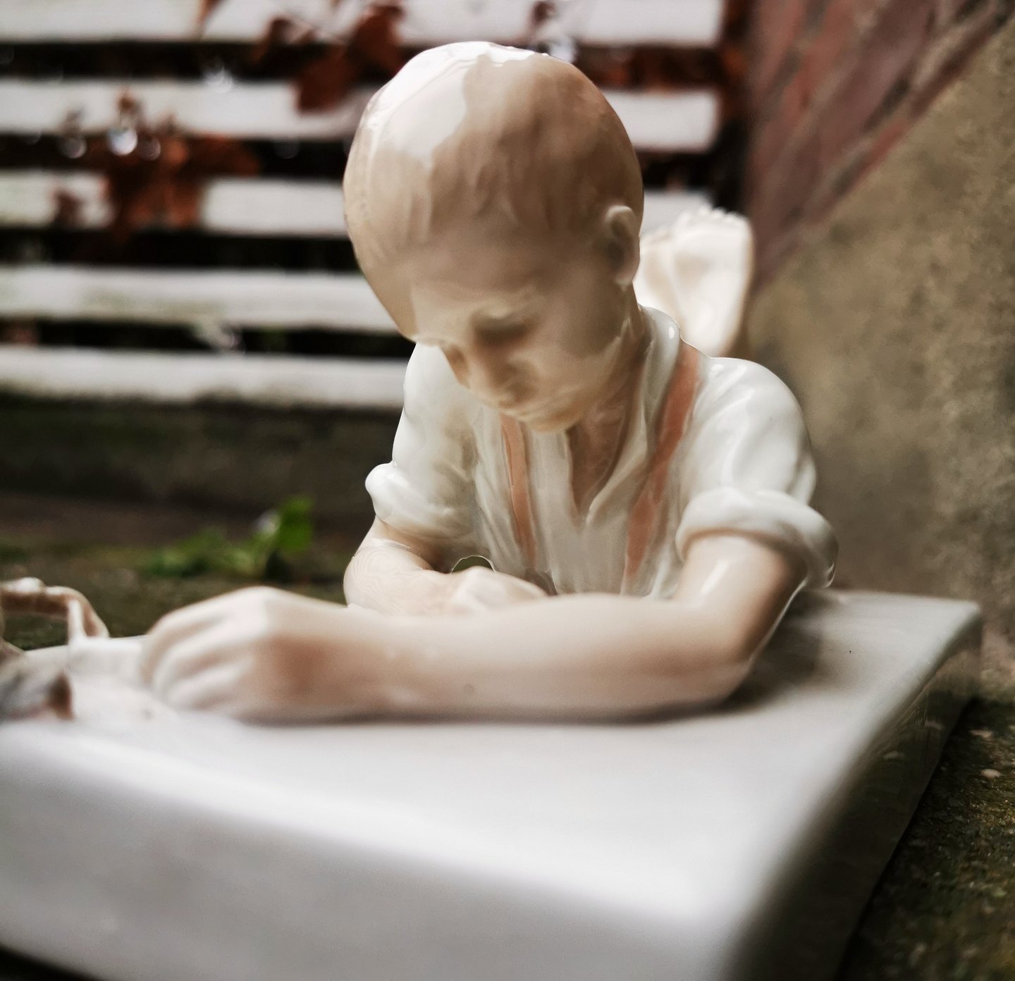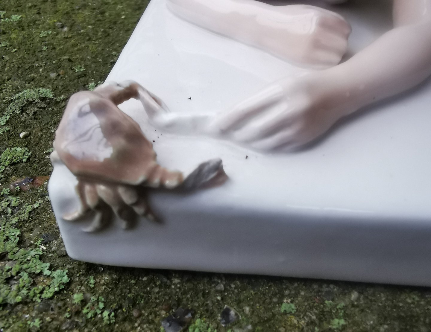 Brevpresser eller brevvægt i porcelæn fra Bing & Grøndahl. Dreng leger med krabbe. Produceret 1914-1915. Fremstår med lille skade. Skår på krabbens højre klo. Ellers i god stand. 1. sortering. Modelnummer 1836. Stemplet bl.a. COPENHAGEN samt B&G i blåt. Mål: 9½ cm høj. Basen måler 8 x 18½ cm.
