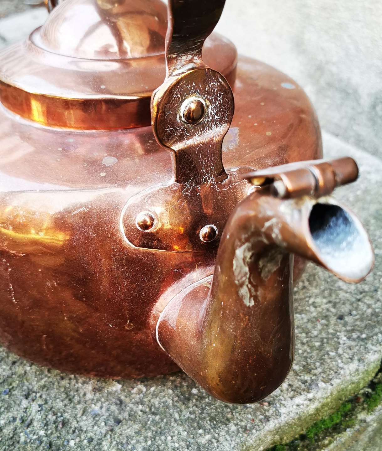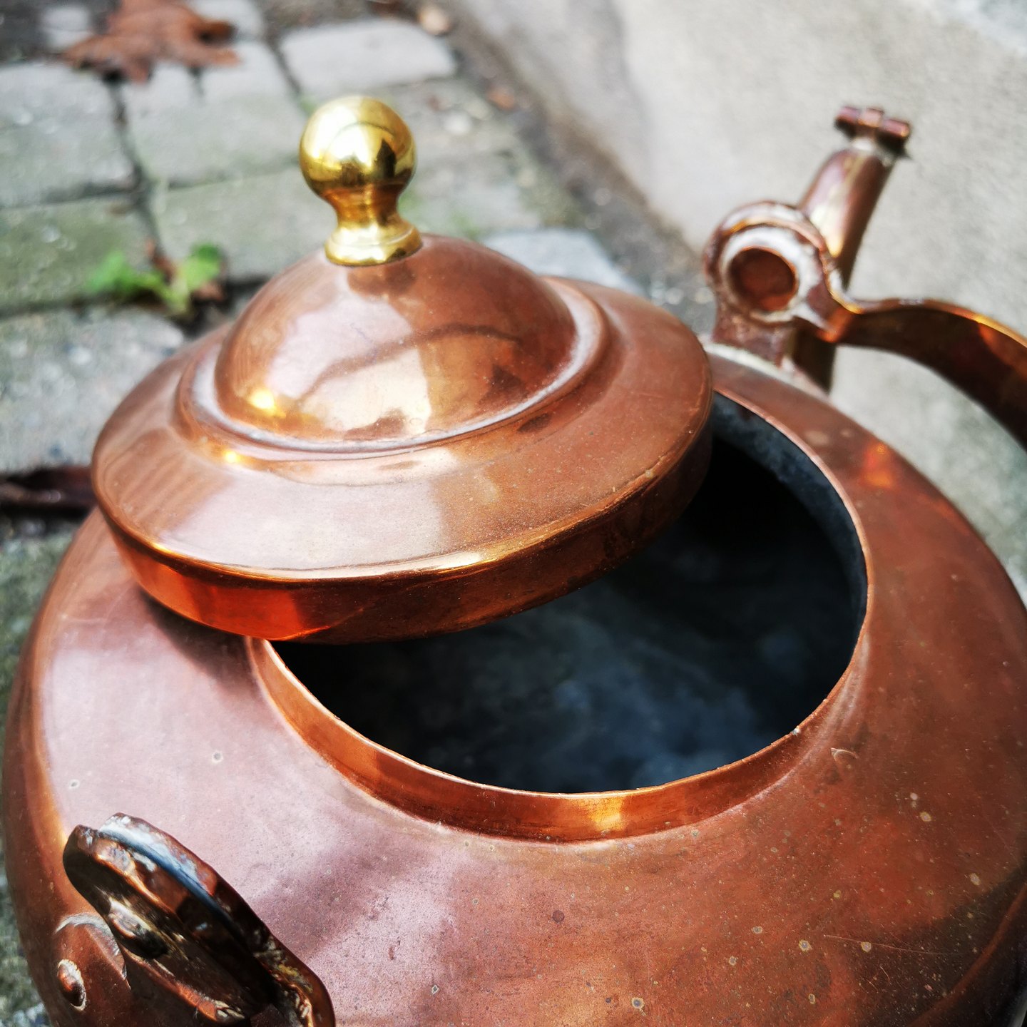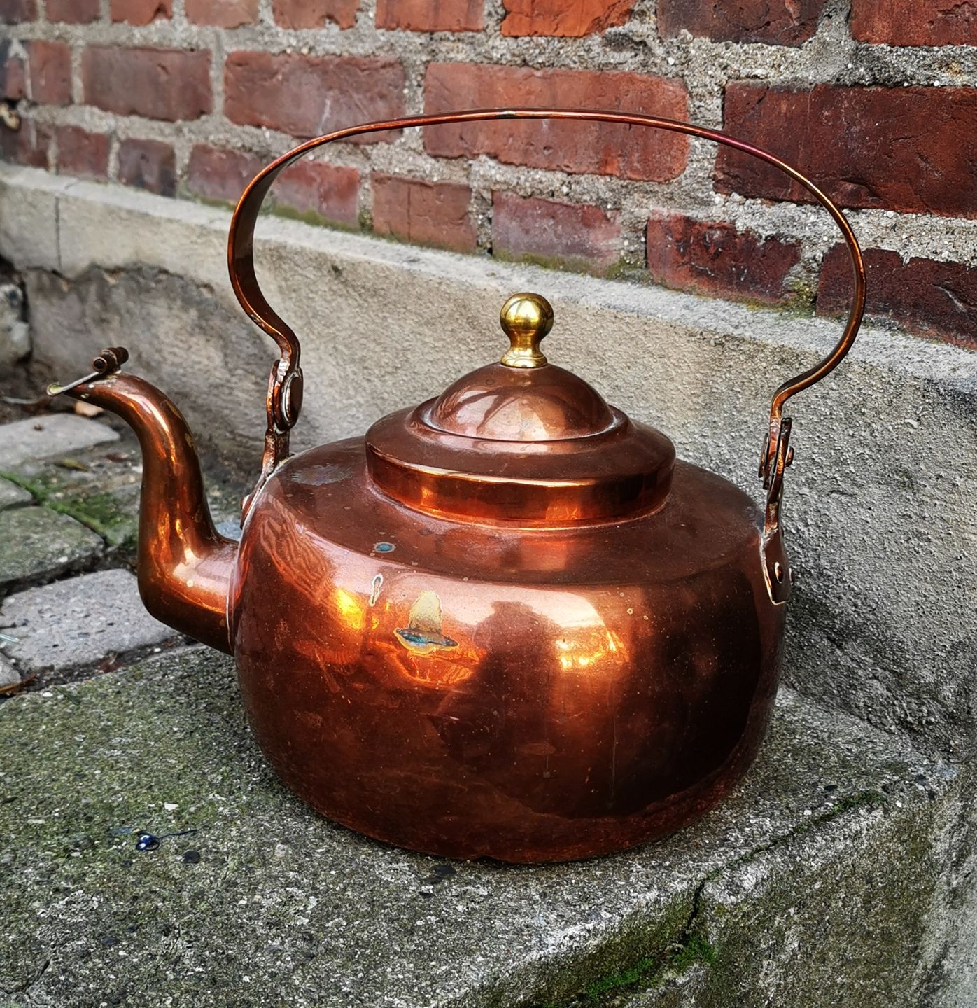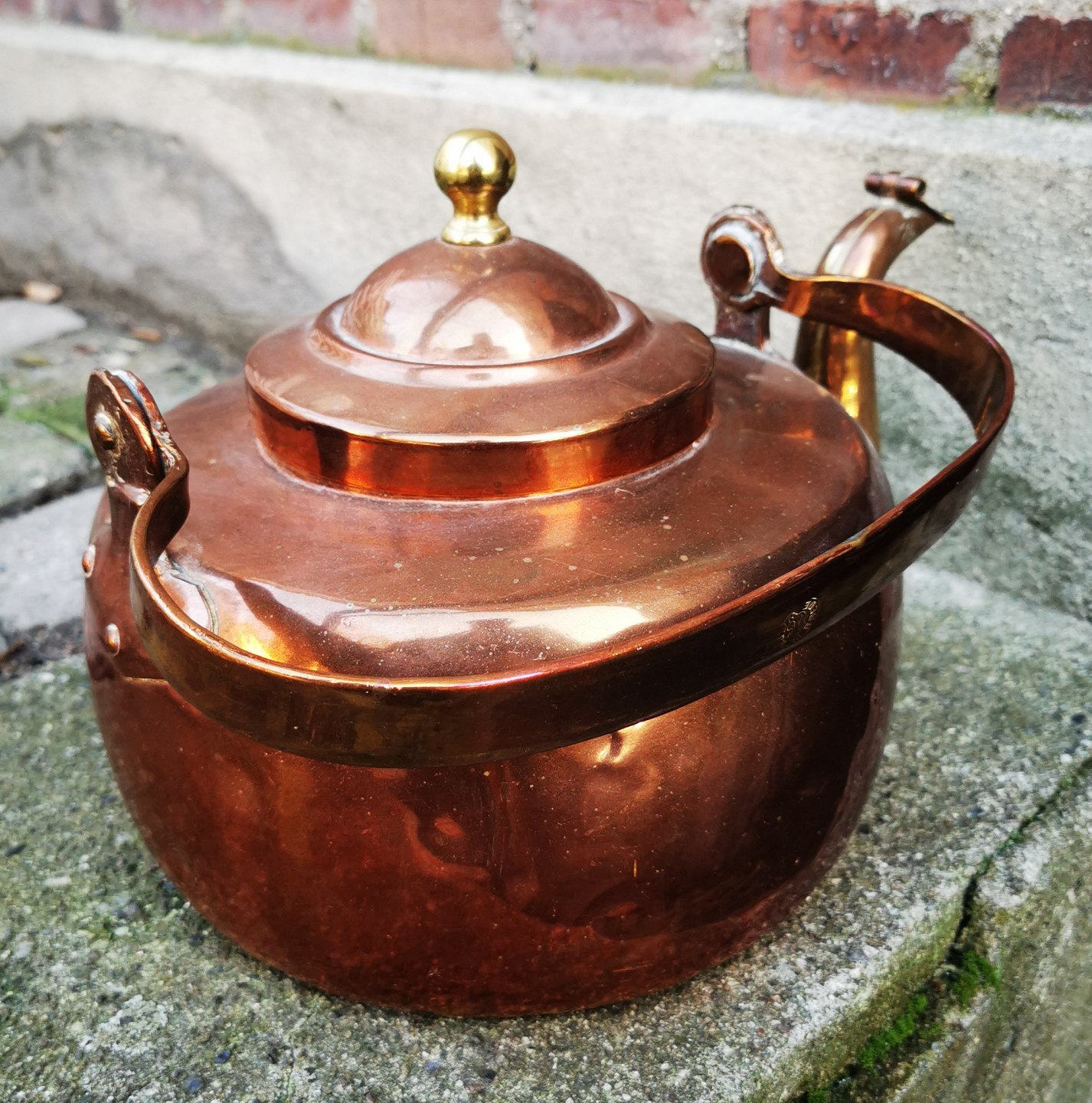 Kobberkeddel, 19. årh. Brede Værk 1839 - 1848. I god stand. Almindeligt aldersrelateret brugsslid. Ingen skader eller reparationer. Højde (fra bunden til toppen af lågknoppen) 21 cm. Længde 32 cm. Bundens diameter 20 cm. Stemplet på hanken: Brede Værk Christian VIII. Smukt stemplet på hanken.