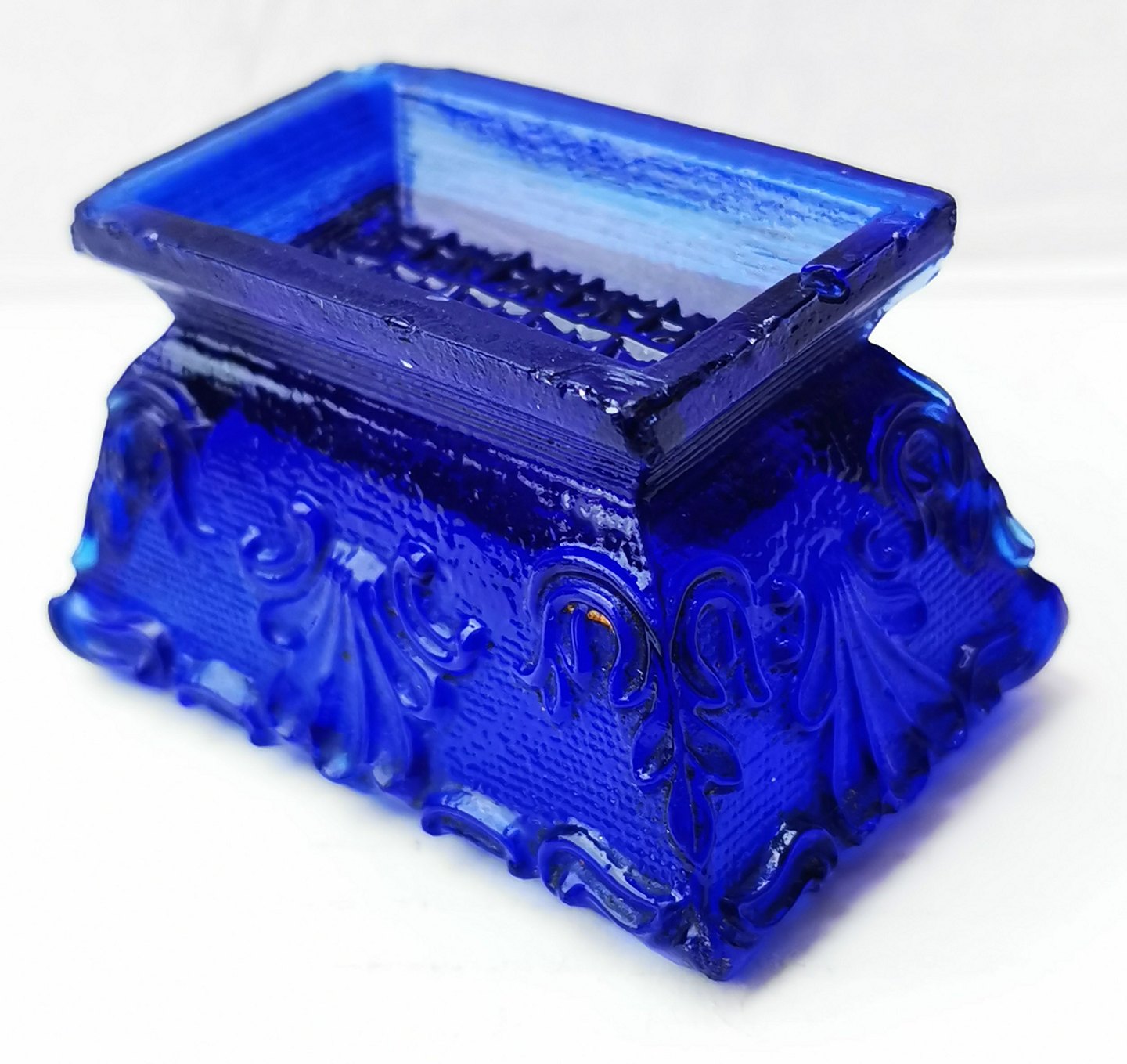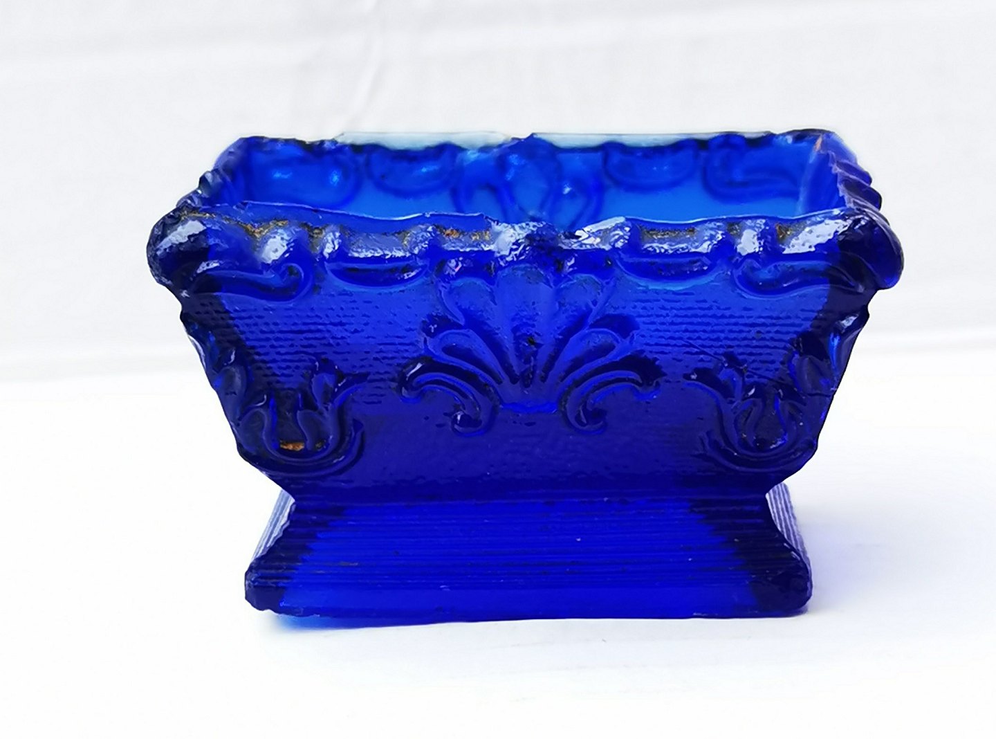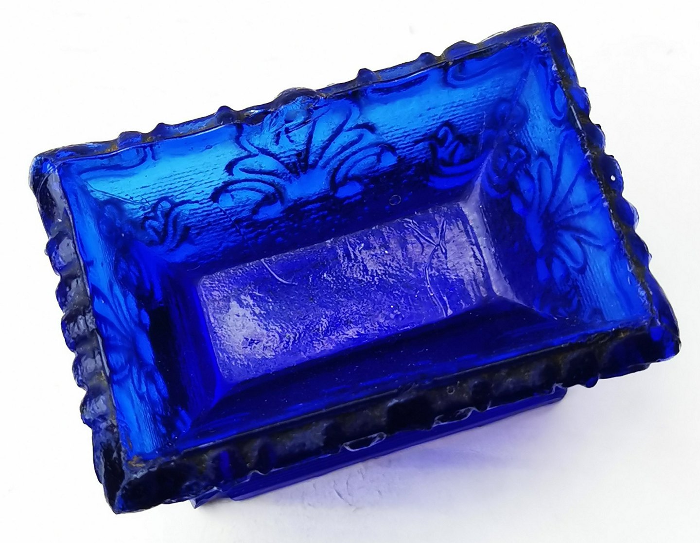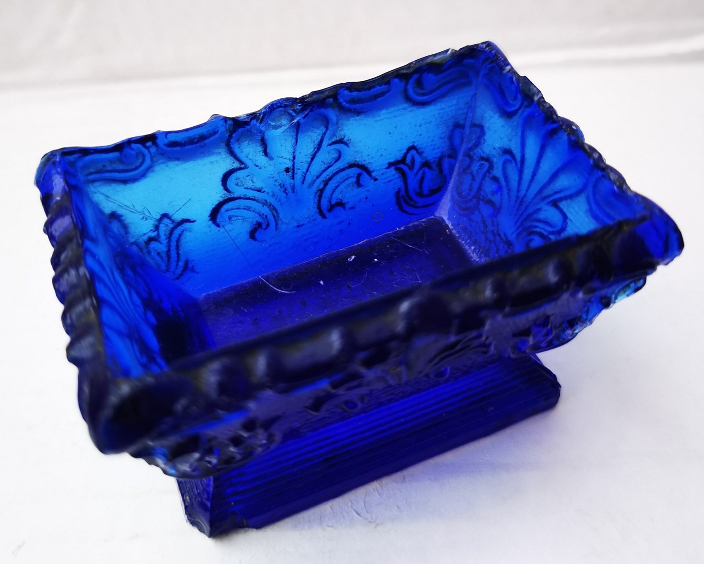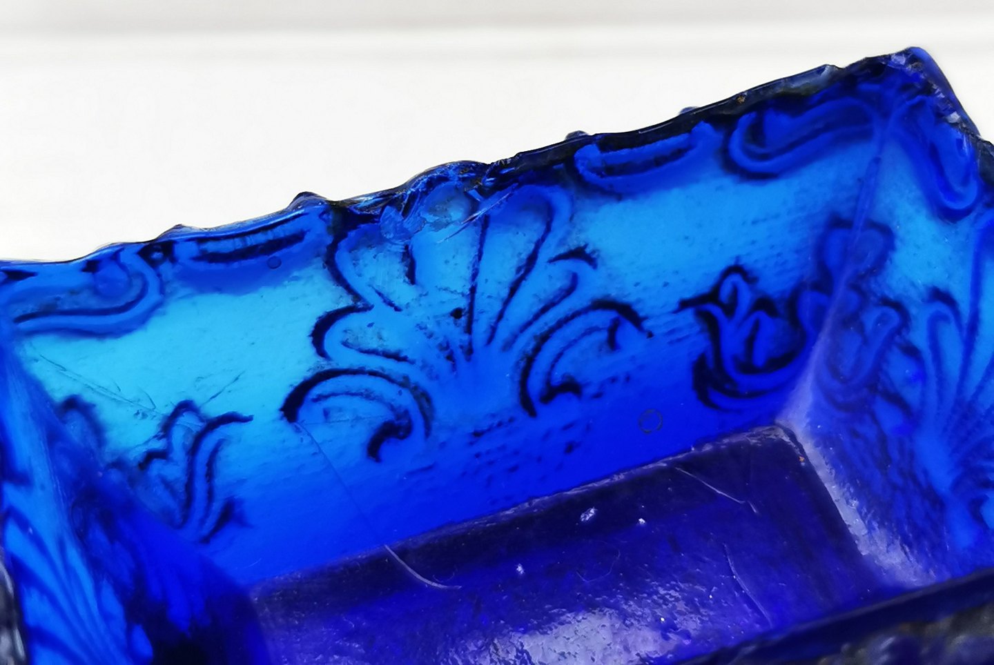 Blåt saltkar i blåt presset glas. Fremstillet på Holmegaard Glasværk i anden halvdel af 19. århundrede. Har et skår på den ene kants inderside samt et par mindre skår andre steder bl.a. på et hjørne (se fotos). Mål: H. 4 cm (1.57 inches). Toppen måler 4½ x 7 cm (1.77 x 2.75 inches)