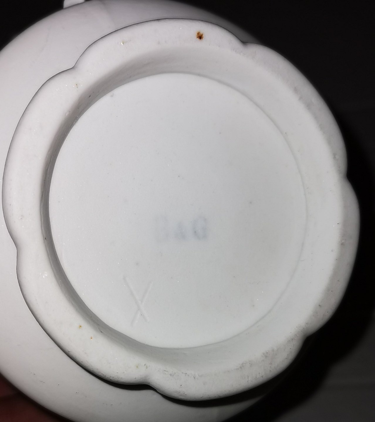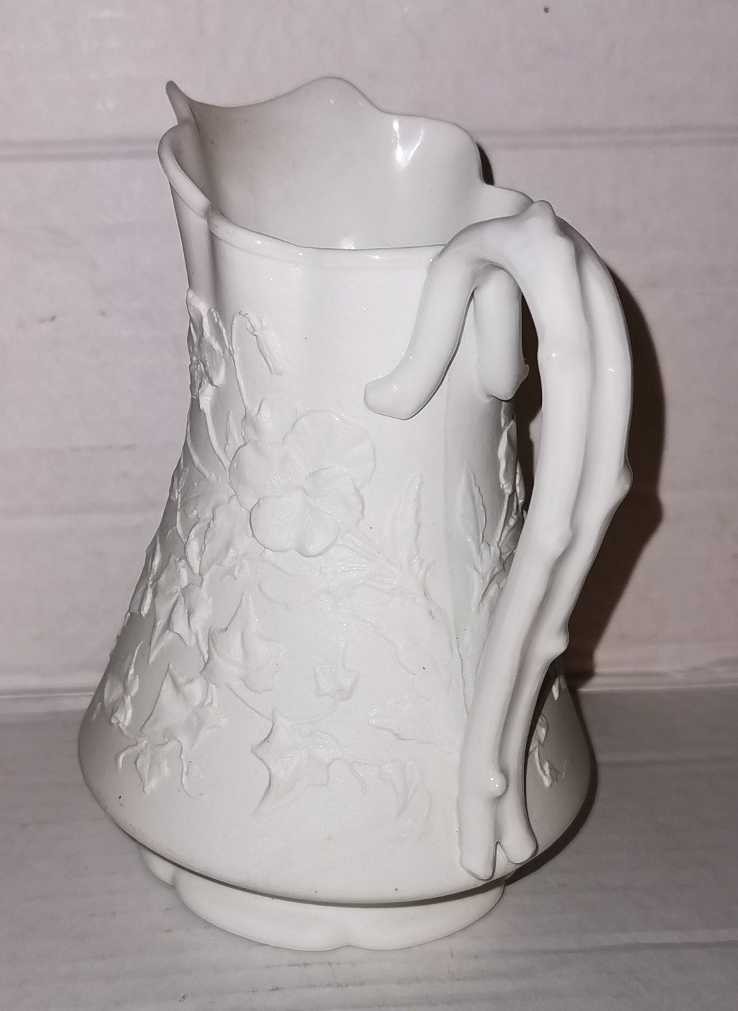 Kande i porcelæn (bisquit udvendigt, glaseret indvendigt) med blomsterdekorationer og bladværk på ydersiden. Fremstår i perfekt stand. Fremstillet i slutningen af 19. århundrede hos Bing & Grøndahl. Fabriksmærket med B&G på undersiden.