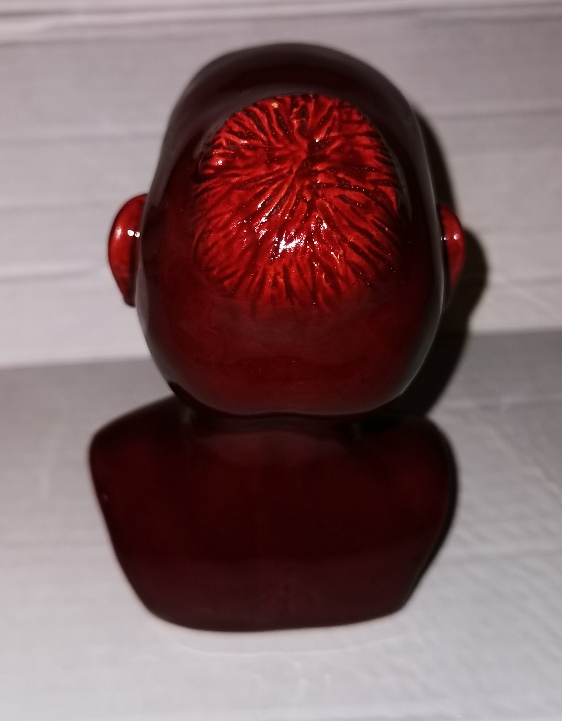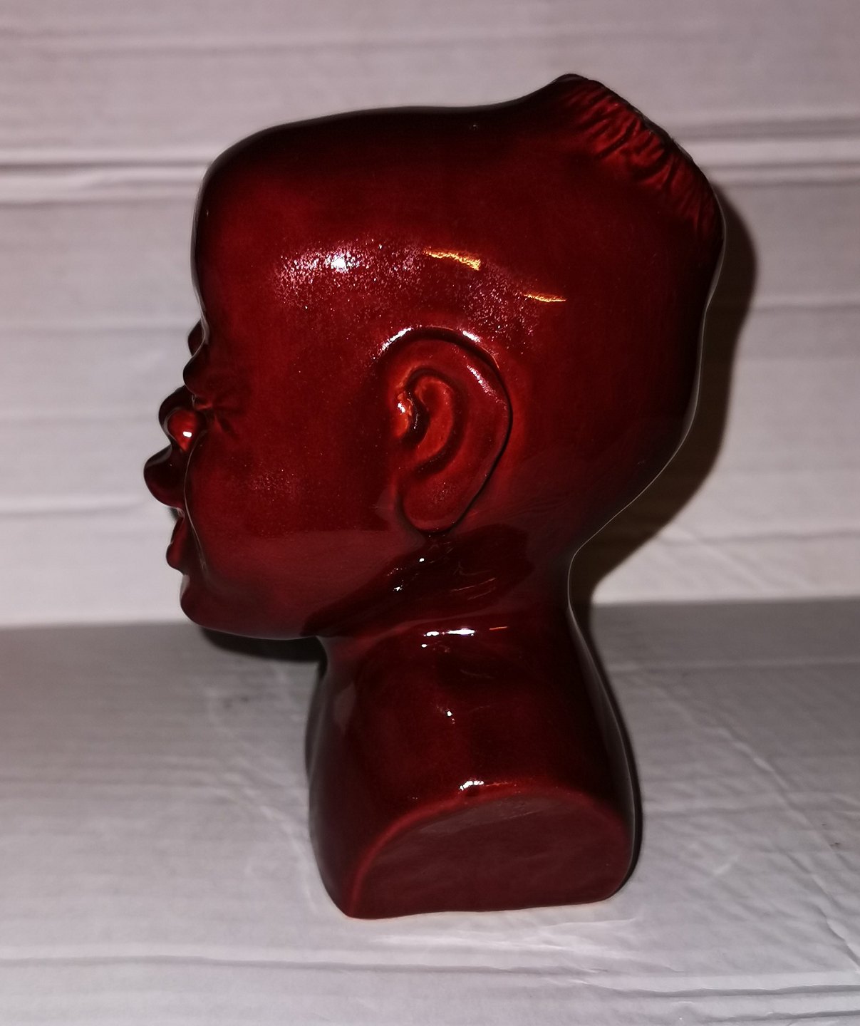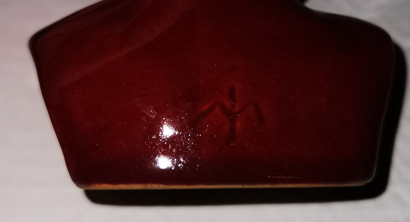 Buste i keramik af smilende afrikansk mand. Dækket af rød glasur. Signeret af ubekendt kunstner på bagsiden. Fabriksmærket på bunden. H. 14 cm
