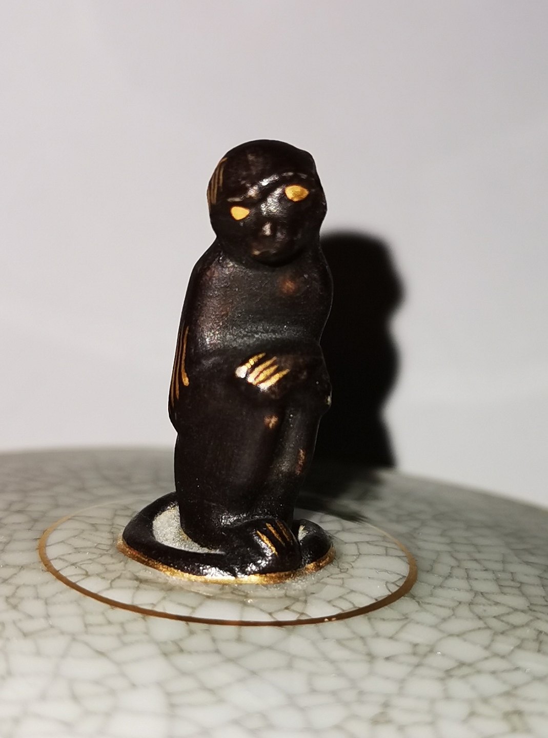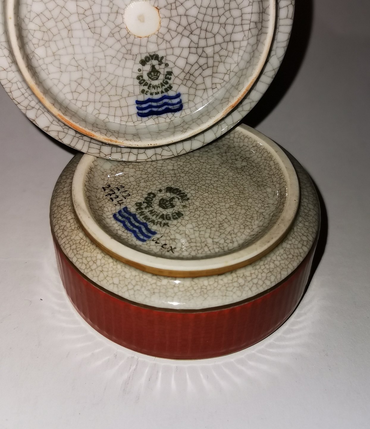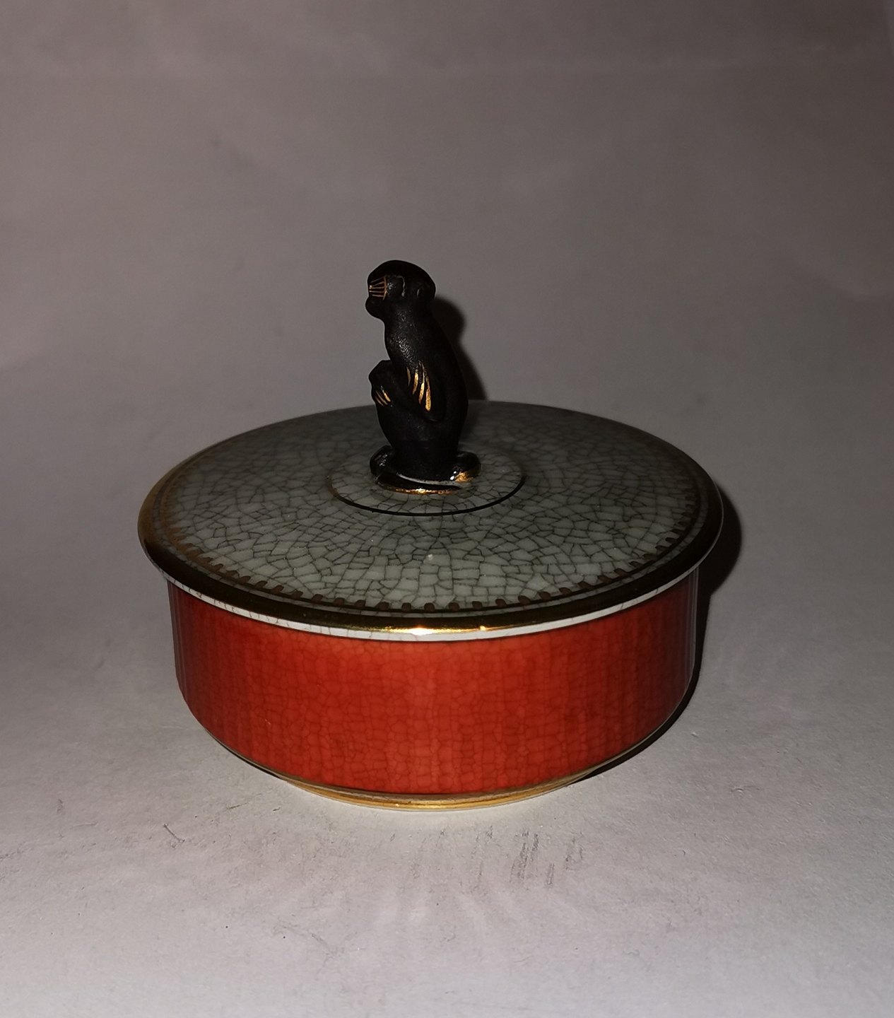 Small round bowl with lid from Royal Copenhagen. Crackled decoration in gray and red. At the top of the lid is seen a lid bud in the shape of a sitting monkey. In good condition without damage or repairs. 1st sorting. H. 7½ cm (2.95 inches).