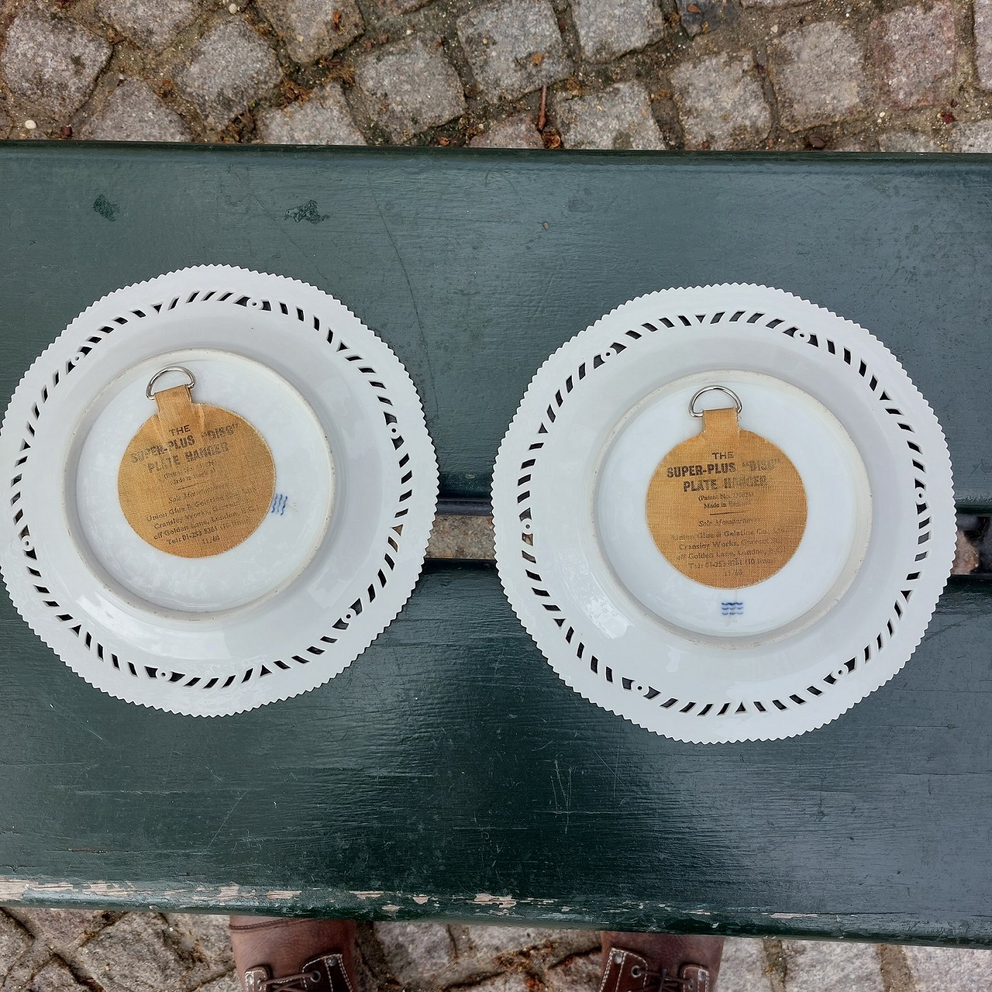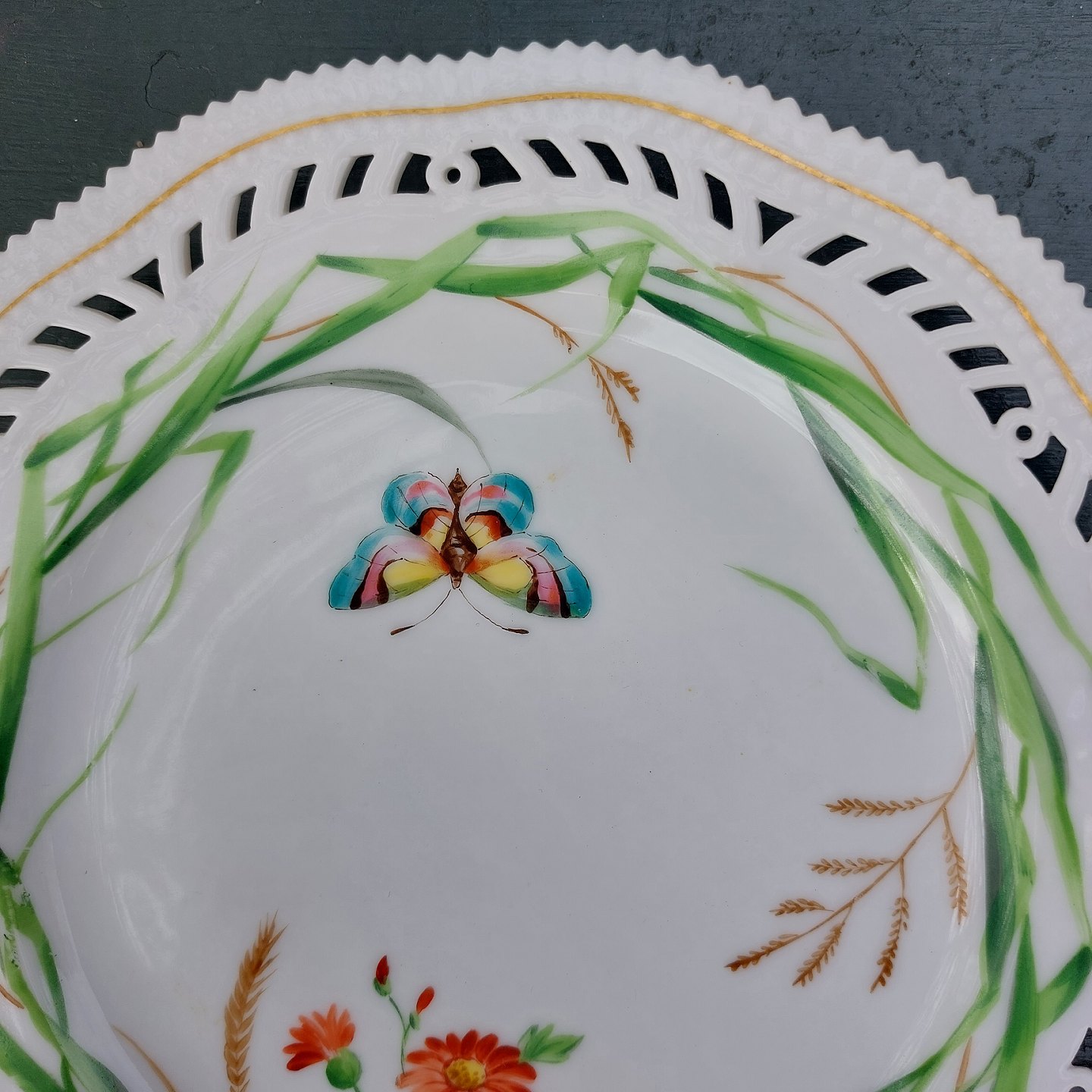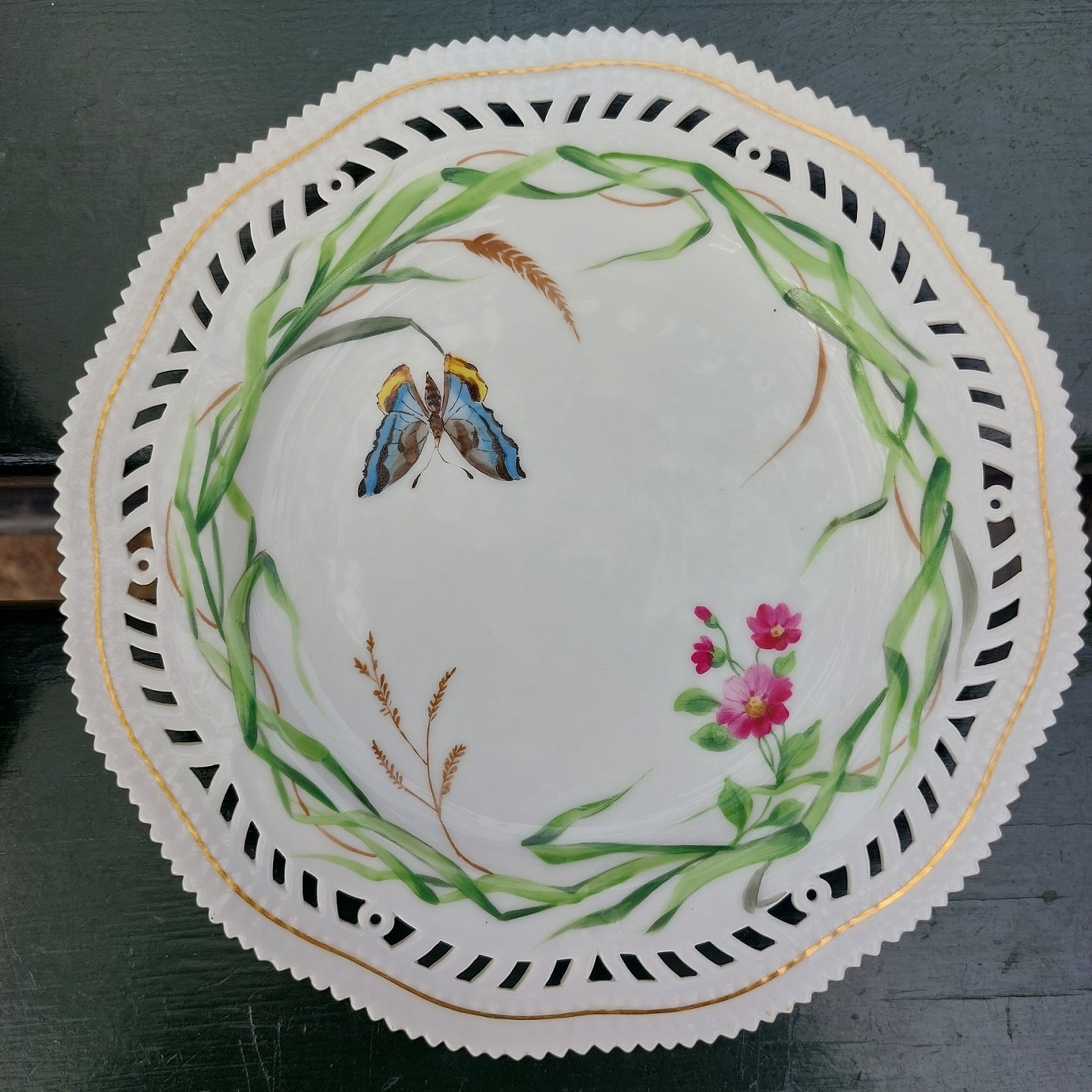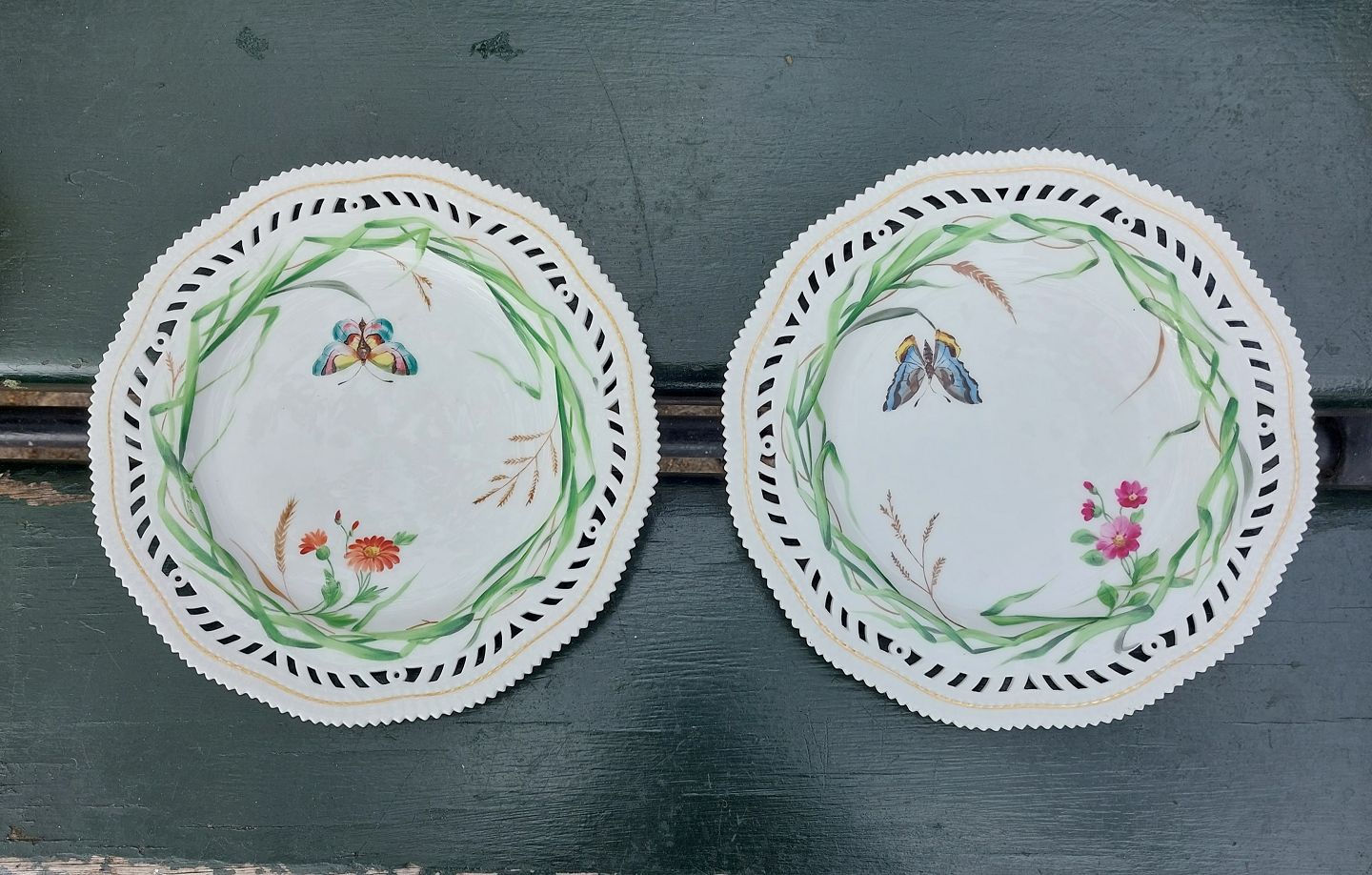 Par tallerkener I porcelæn med gennembrudt kant fra Royal Copenhagen fra slutningen af 19. Århundrede. Dekoreret med bladværk og sommerfugle. Fremstår I god stand uden skader eller reparationer. Anden sortering.Ø. 32 cm
