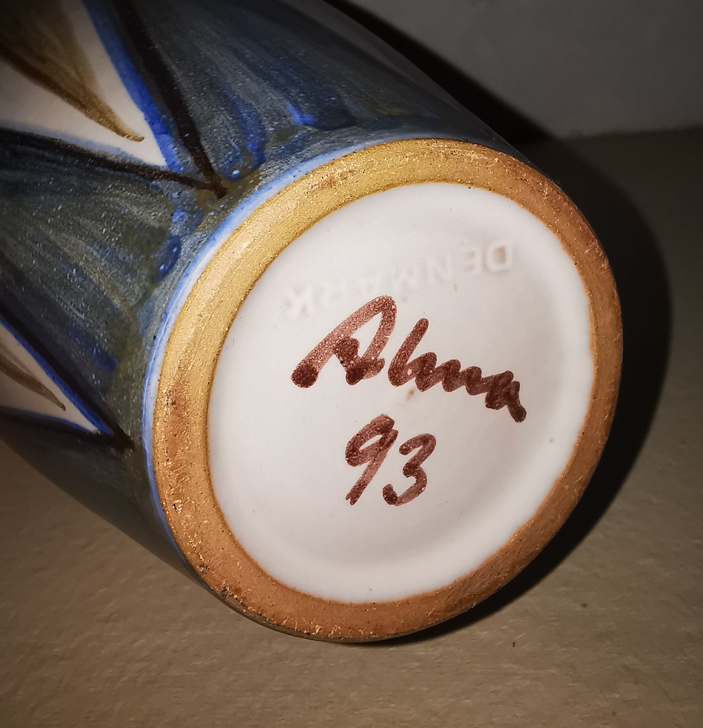 Olivformet vase i keramik fra Alma. Fremstår i perfekt stand. Ingen skader eller reparationer. Fabriksmærket på bunden med håndskrevet "Alma" DENMARK og modelnummer 93. H. 23½ cm.