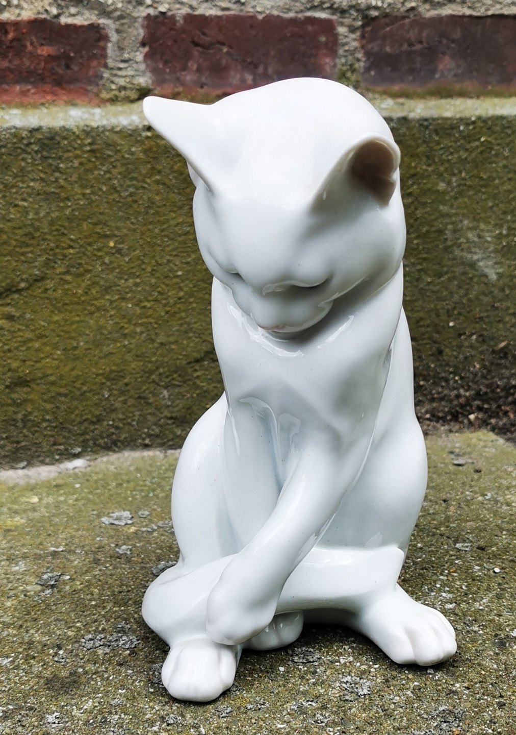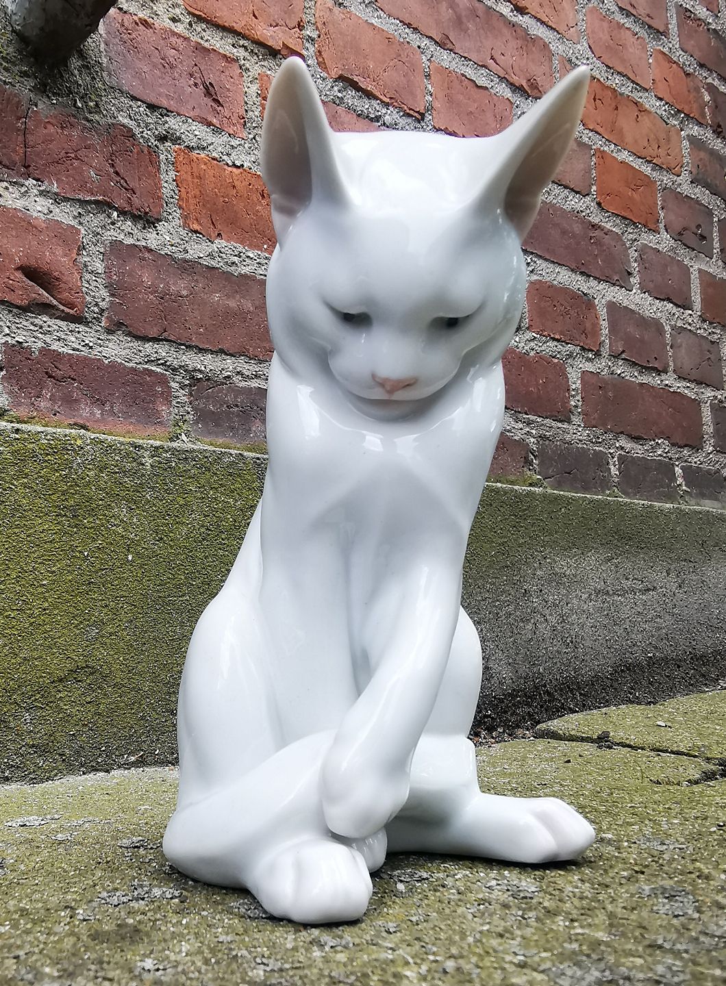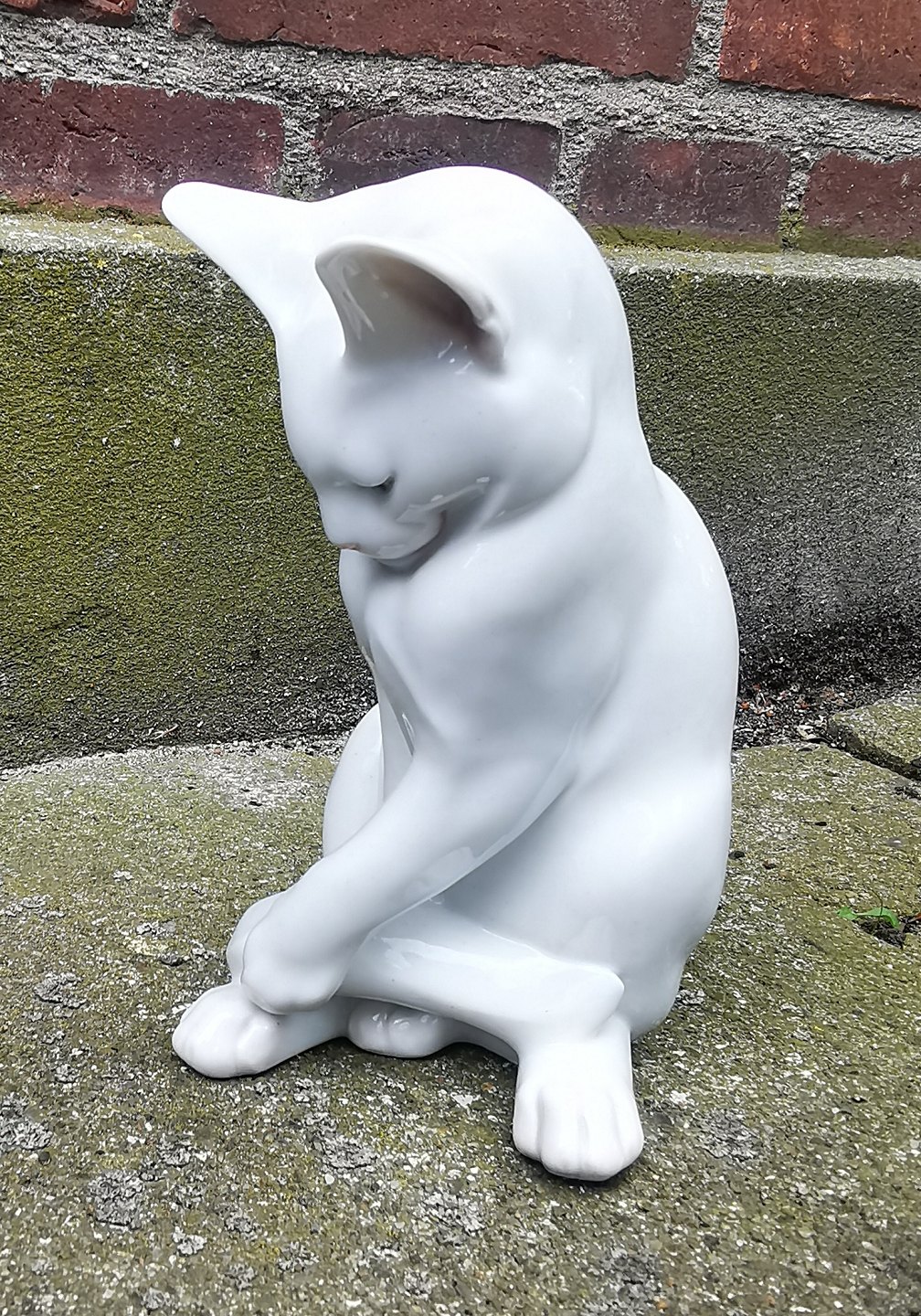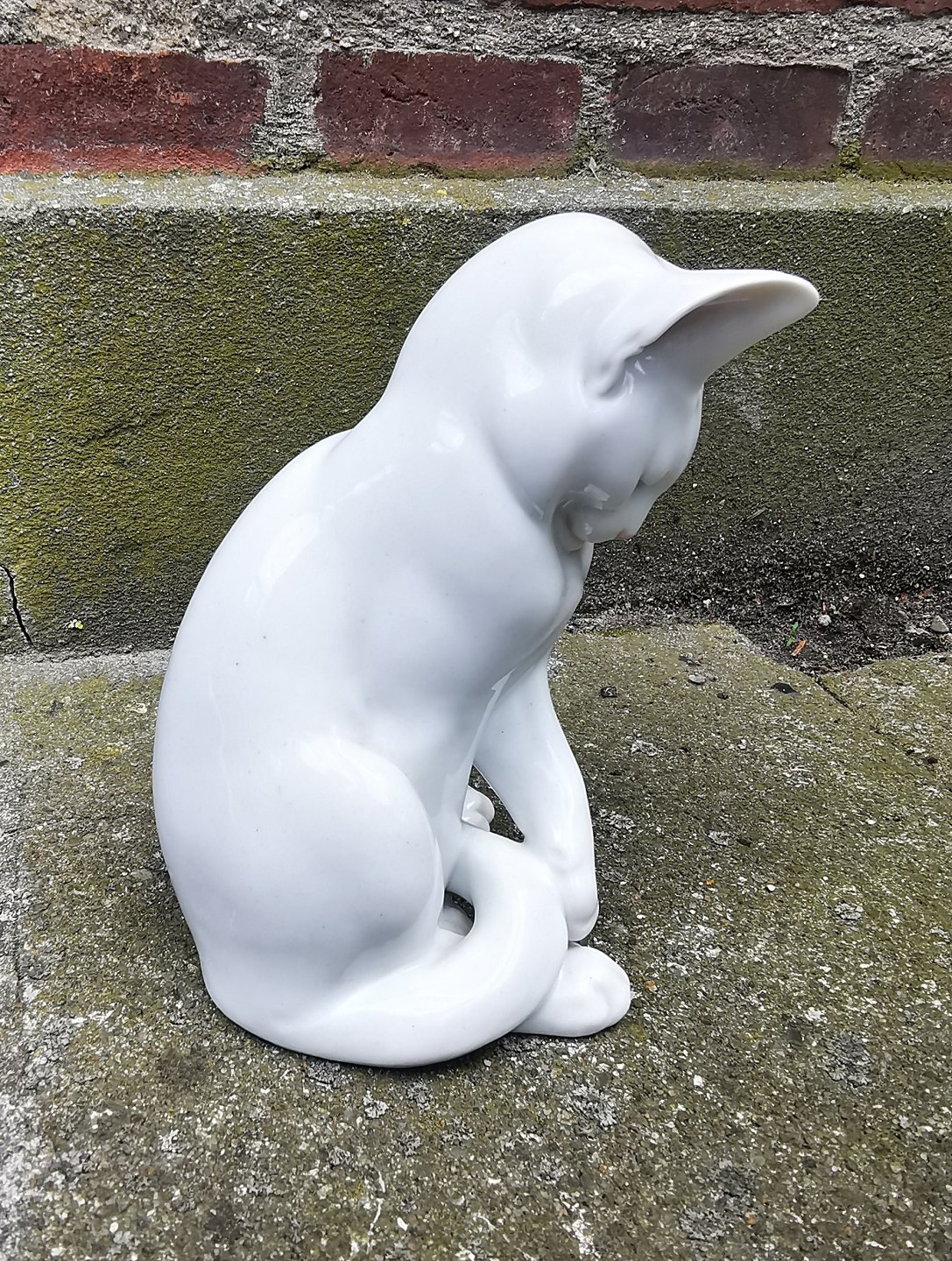 Figur af kat i porcelæn fra Royal Copenhagen i hvid glasur. Fremstillet på fabrikken mellem 1900-1923. Fremstår i perfekt stand uden skader eller reparationer. Modelnummer 307. Fabriksmærket på bunden. H. 17½ cm (6.88 tommer).