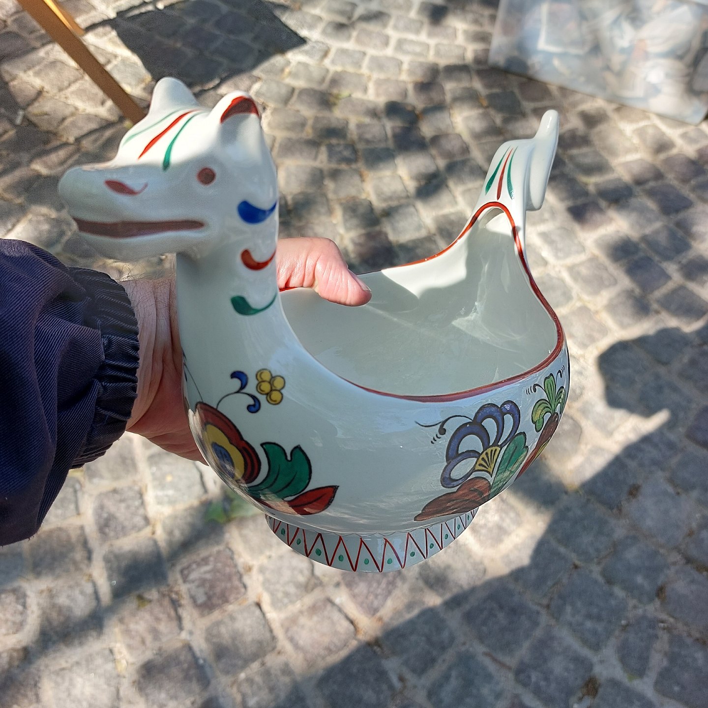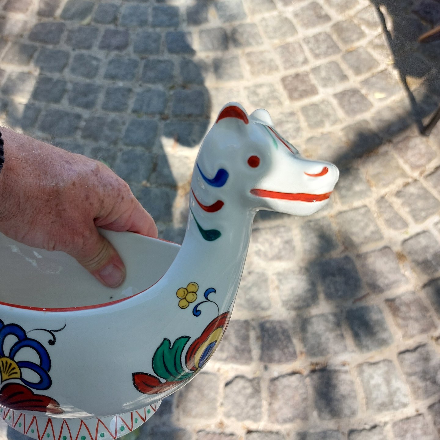 "Ølbolle" eller øl hestehoved drikkeskål fra Egersundfabrikken i Norge. Fremstillet omkring 1940. Hoved og hale som hanke. Bemalet ornamentik på siden. Fabriksmærket på bunden. Fremstår i god stand uden skader eller reparationer. Lignende skåle ses fra en anden norsk fabrik - Porsgrund. Mål: H. 19 cm (7.48 tommer) L. 31 cm (12.20 tommer)