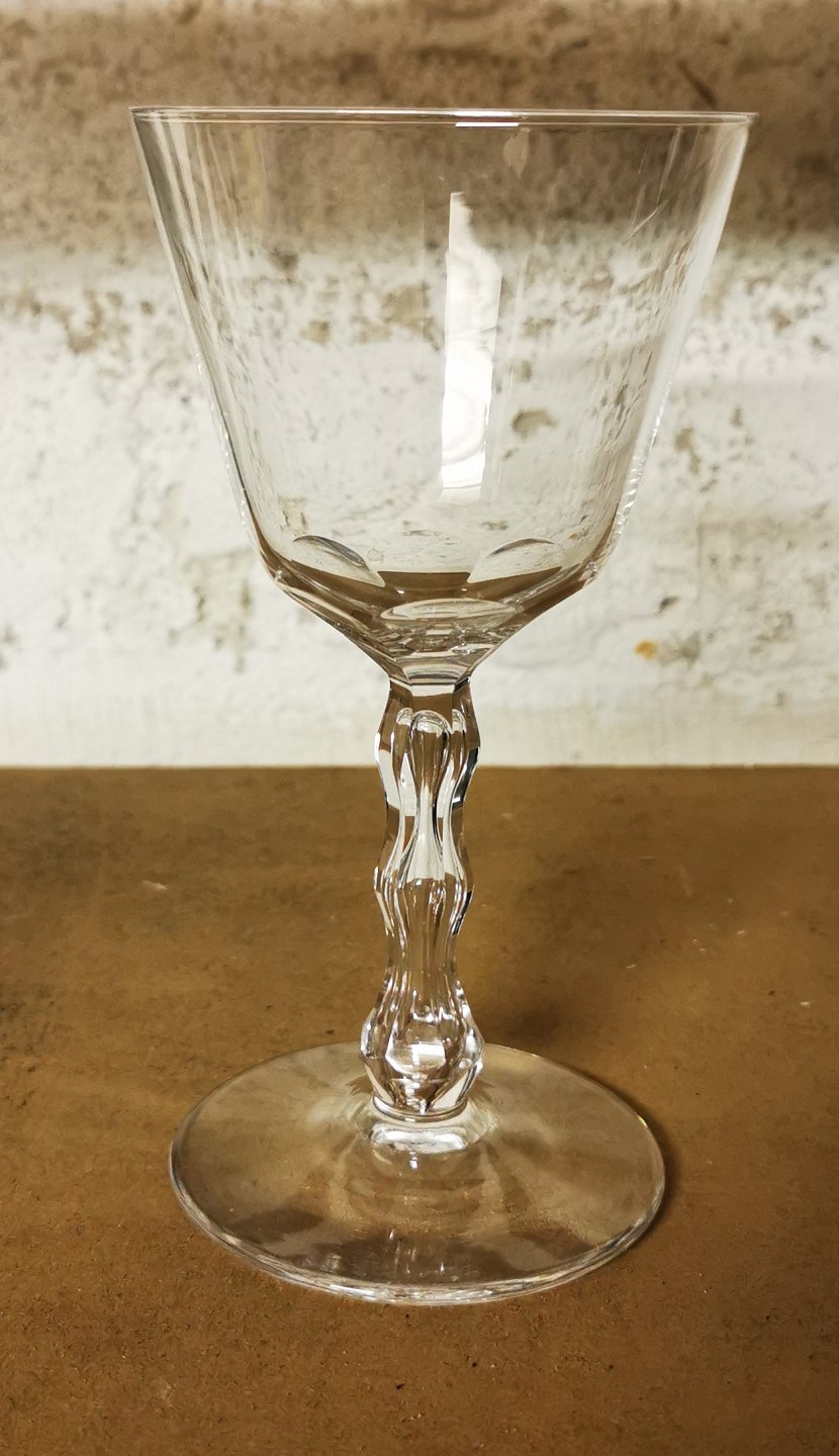Vinglas med delvist facetteret kumme samt hul stilk. Fremstår i god stand. H. 25,3 cm