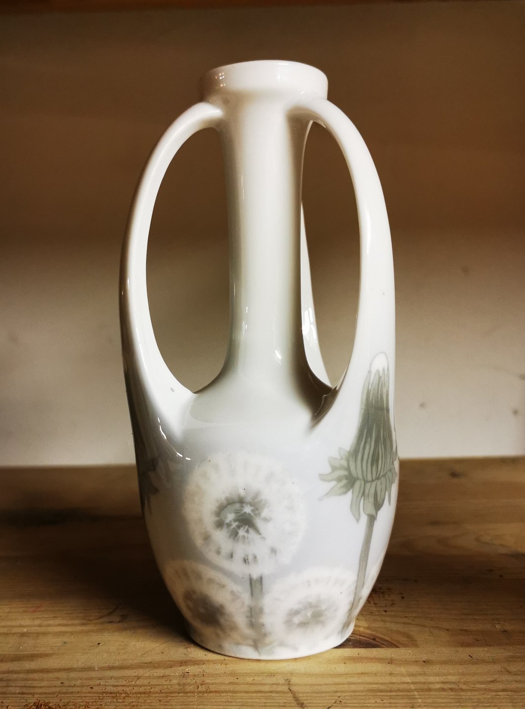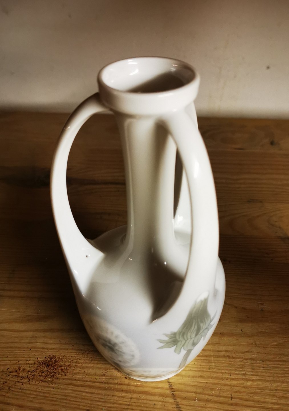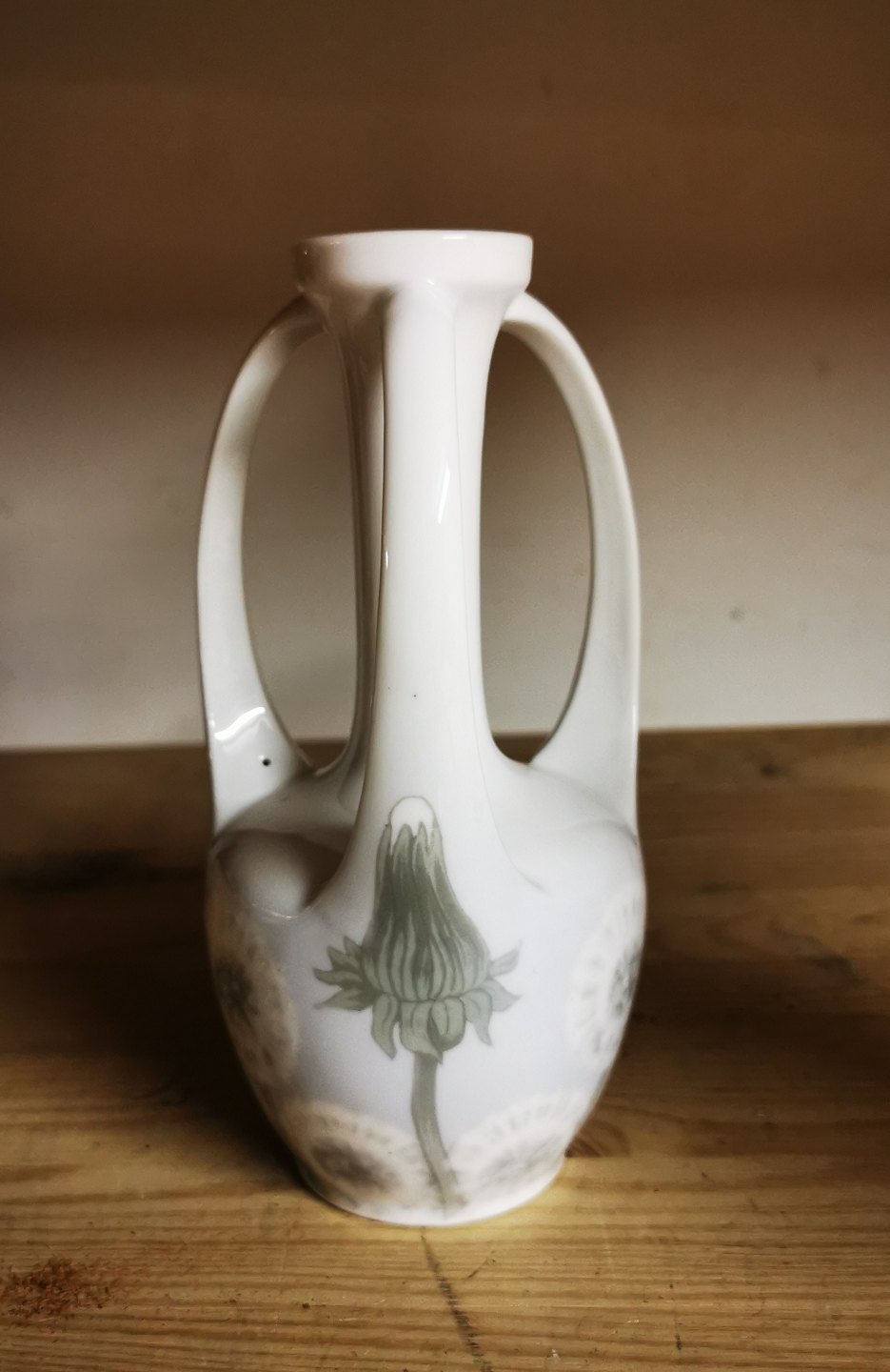Vase i porcelæn med tre hanke fra Royal Copenhagen 1900-1923. Dekoreret med mølkebøtter. Fremstår i perfekt stand. Ingen skader eller reparationer. Fabriksmærket på bunden. 1. Sortering. H. 18 cm