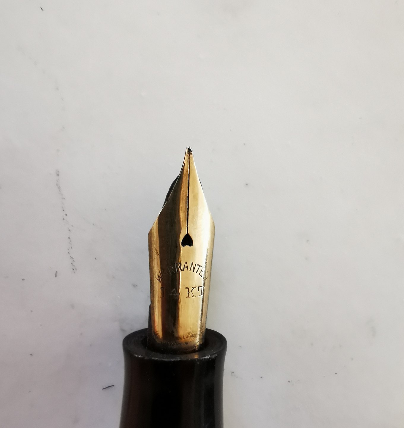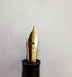 Big 12-sided green marbled fountain pen in Art Deco style. 14 karat gold tip. Manufactured in the 1930s. Has some traces of use on the edge of the hood (see photo). Otherwise no damage or repairs. Doesn't work though. A new rubber bag must be inserted before it is functional again. Measures: 13,5 cm long.