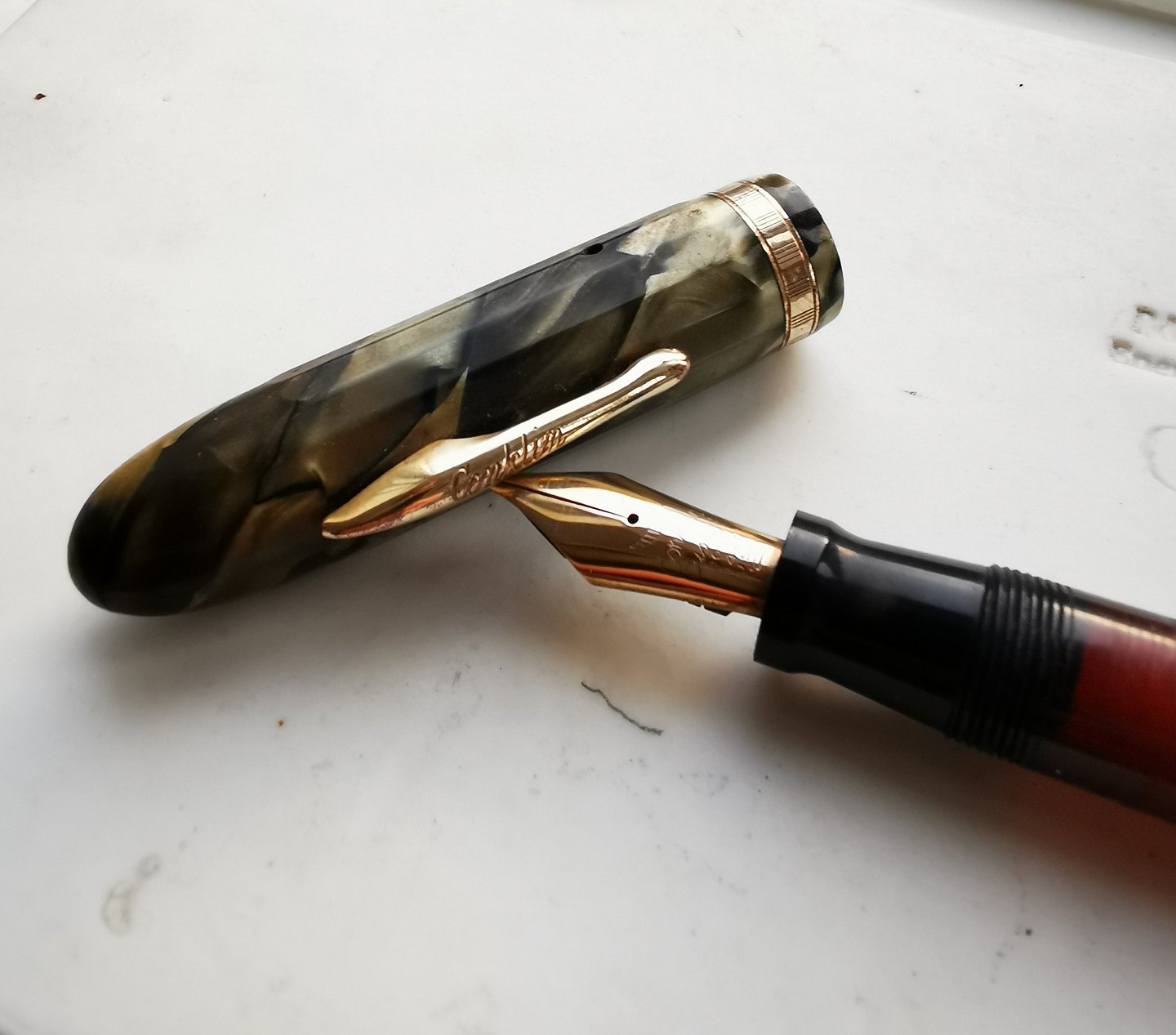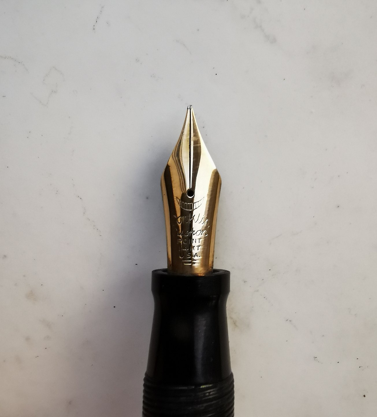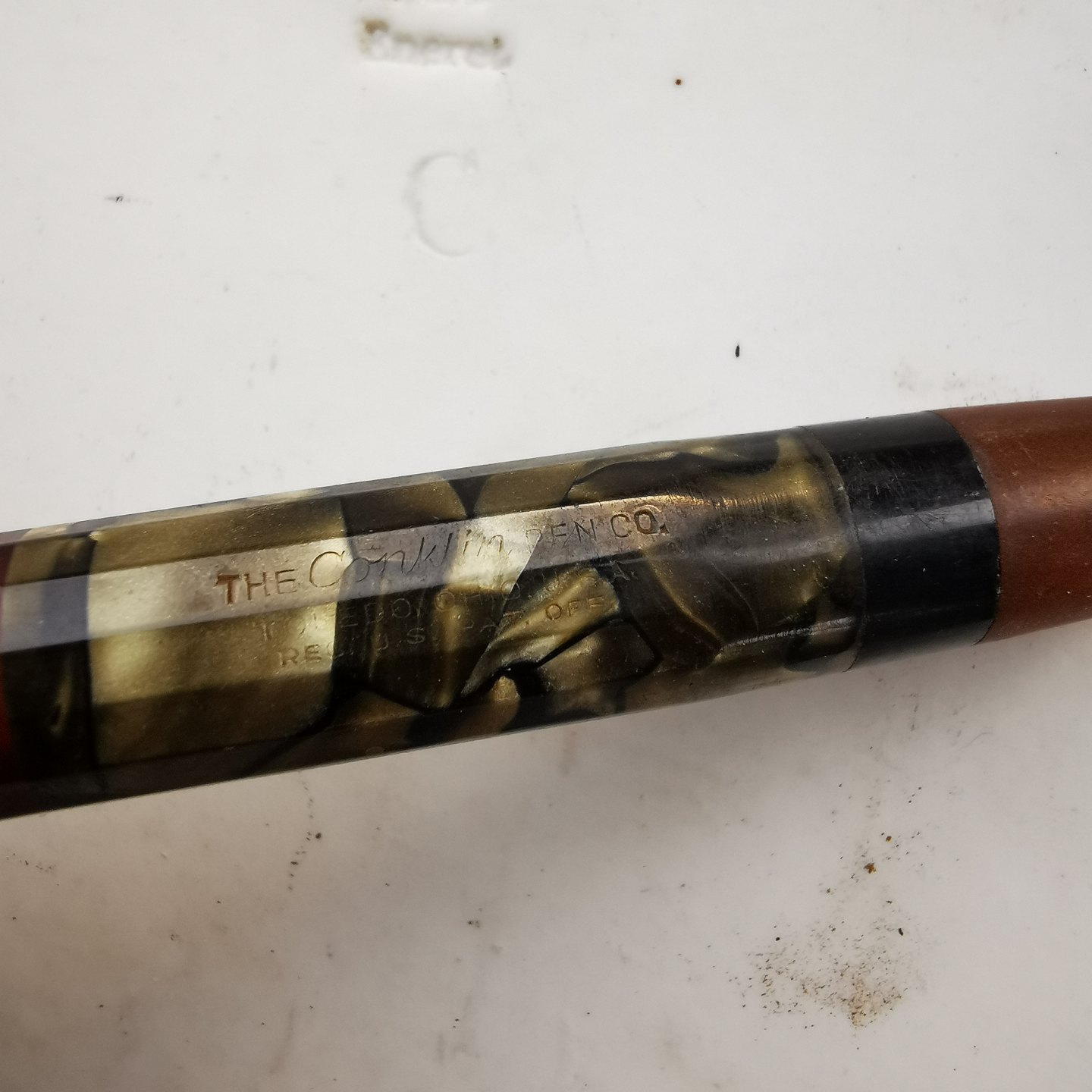 Grønmarmoreret fyldepen fra The Conklin Pen Co. i U.S.A. Både hætten og kroppen er 14-kantet. Usædvanlig lang model af en fyldepen 14½ cm lang (5.70 tommer). Fremstår i meget god stand. Påfyldningsmekanismen fungerer. Kører op og ned inde bag blækvinduet når bundskruen aktiveres ved at blive drejet. Ingen skader eller reparationer. på spidsen står der "Conklin Cushon, POINT 14KT U.S.A.