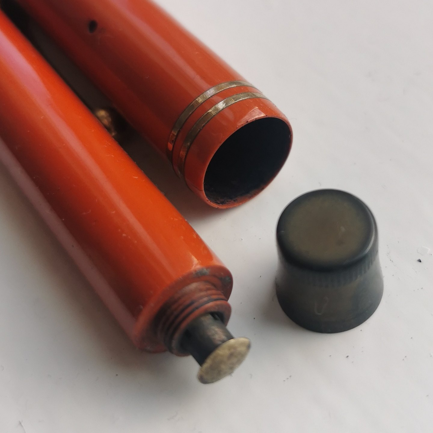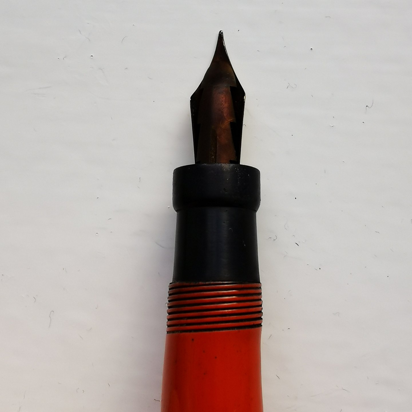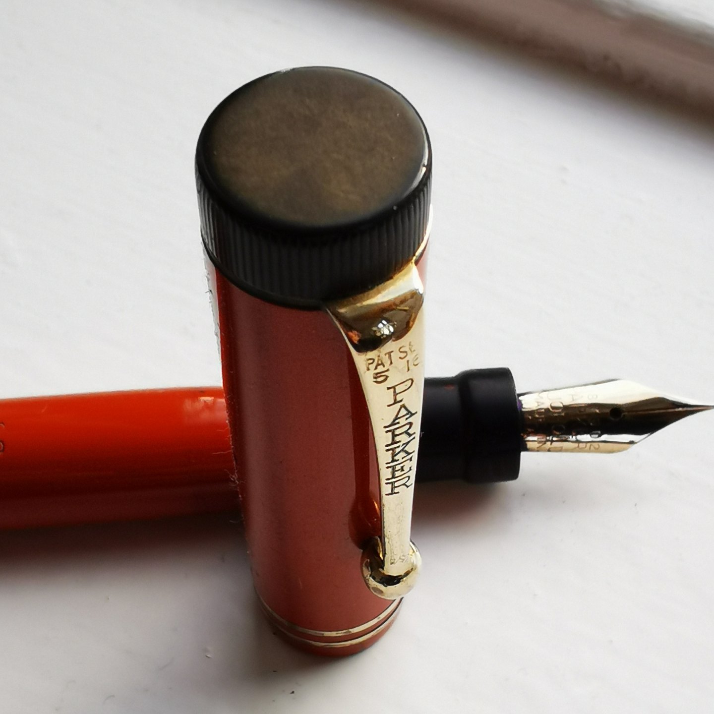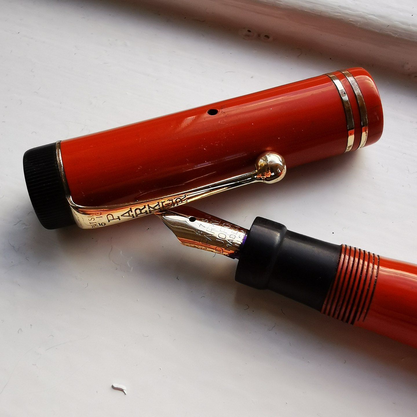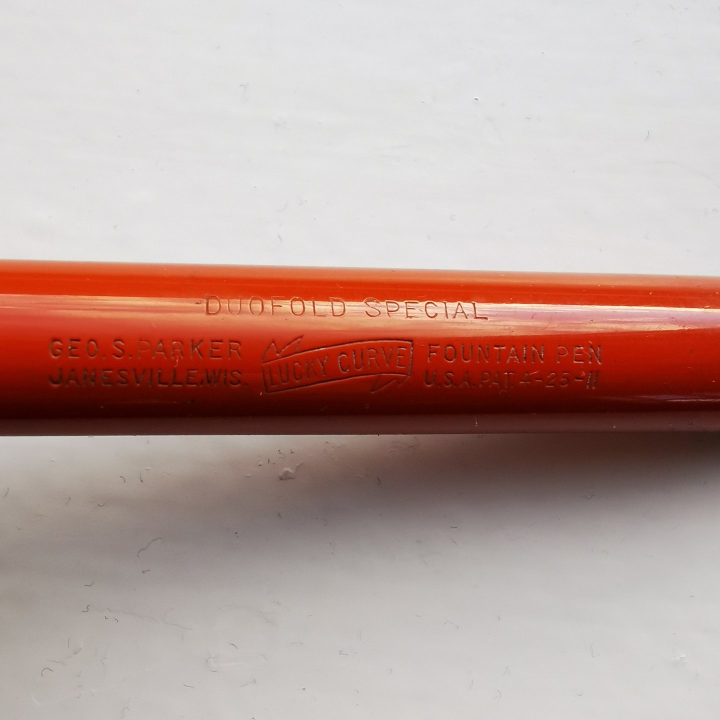 Koralrød Parker Duofold Special Lucky Curve fyldepen. I god stand. Ingen skader eller reparationer. Alle dele er originale. Fungerer ikke. Der skal indsættes en ny gummisæk før end der kan påfyldes blæk igen. Indsættelse af ny gummisæk koster ekstra kr. 200,00. Fyldepennen er 13,5.cm lang