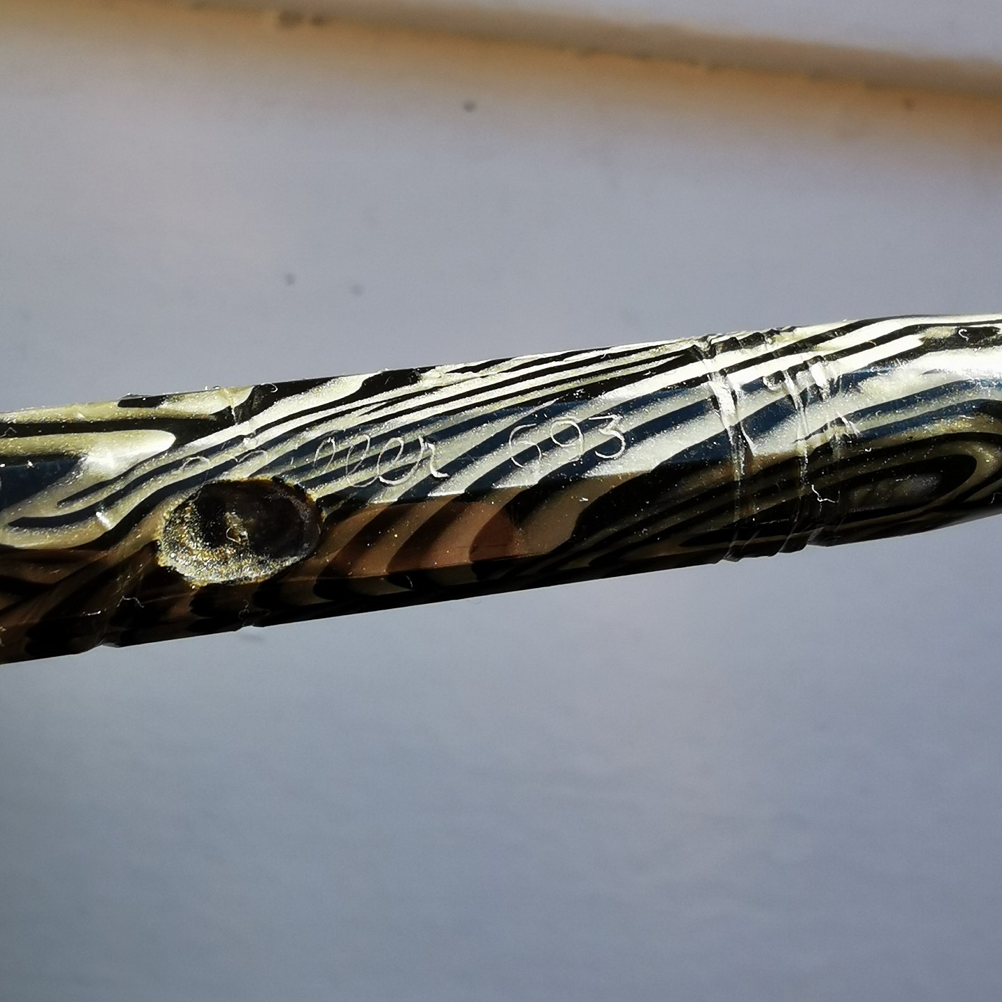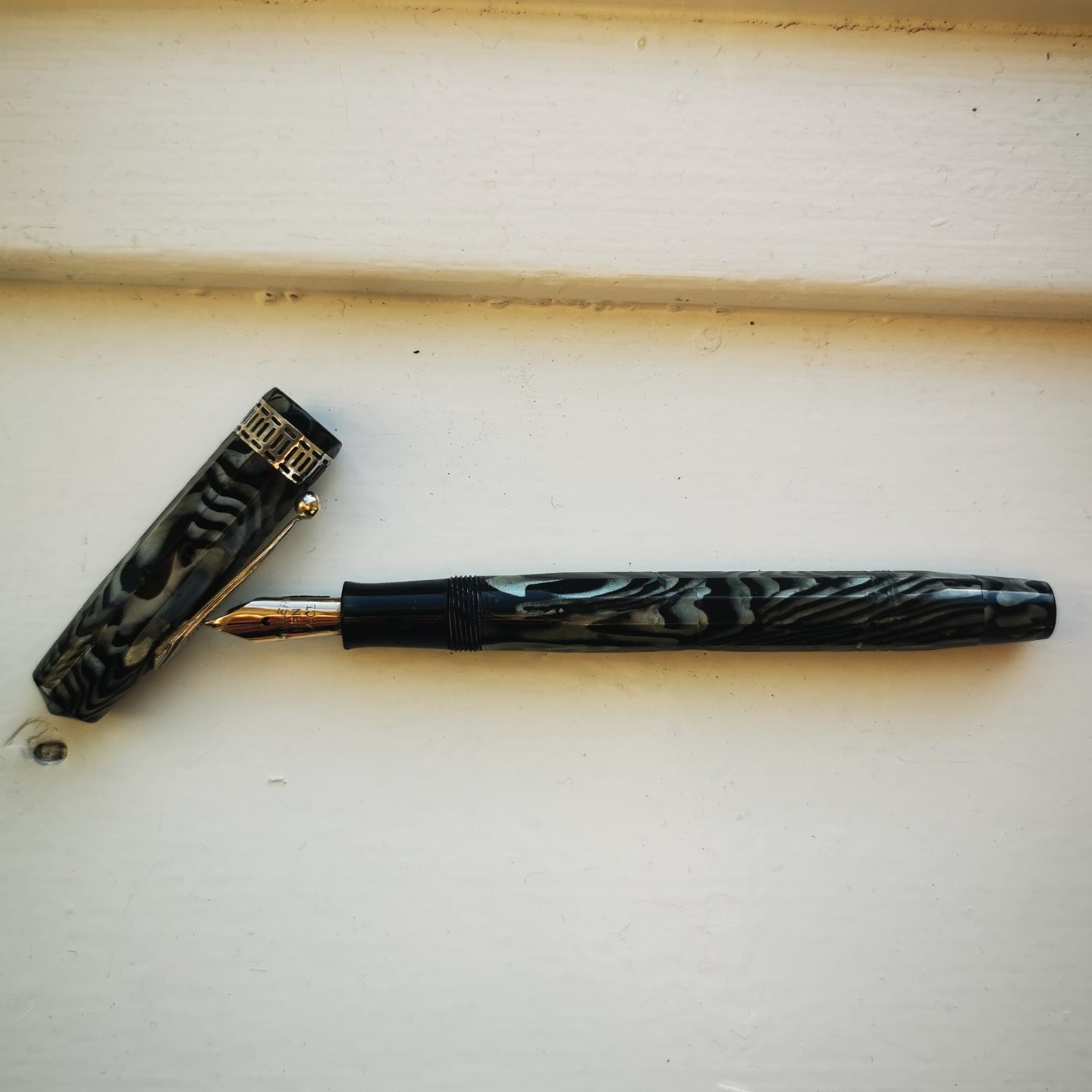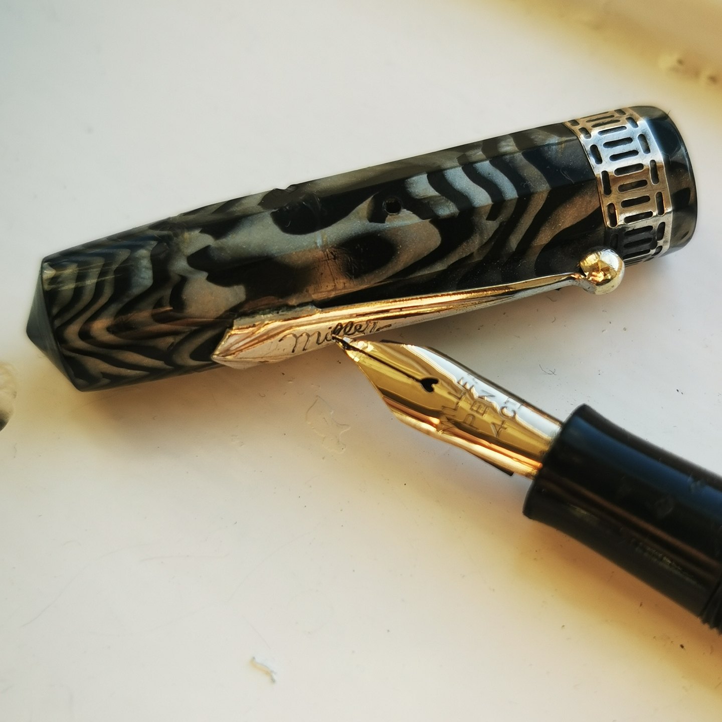 Kantet marmoreret Miller fyldepen. Alle dele originale. Har overflade skader på kroppen (se fotos). Der skal indsættes ny gummisæk før end den kan komme til at skrive igen. L. 12,5 cm.