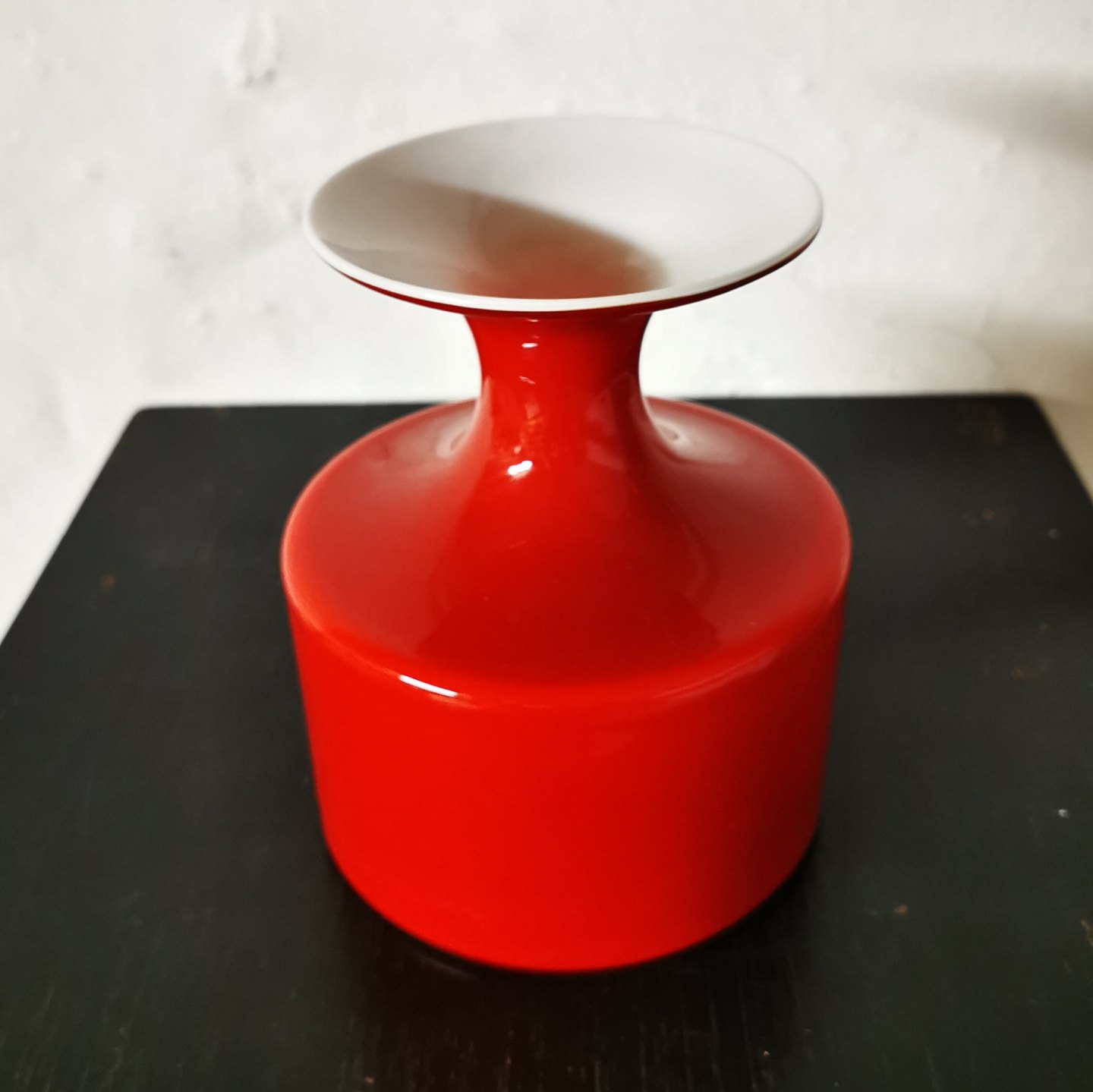 Stor model: Rød og hvid Carnaby vase fra Holmegaard Glasværk. I god stand uden skader eller reparationer. H. 18 cm. Bundens diameter 14 cm