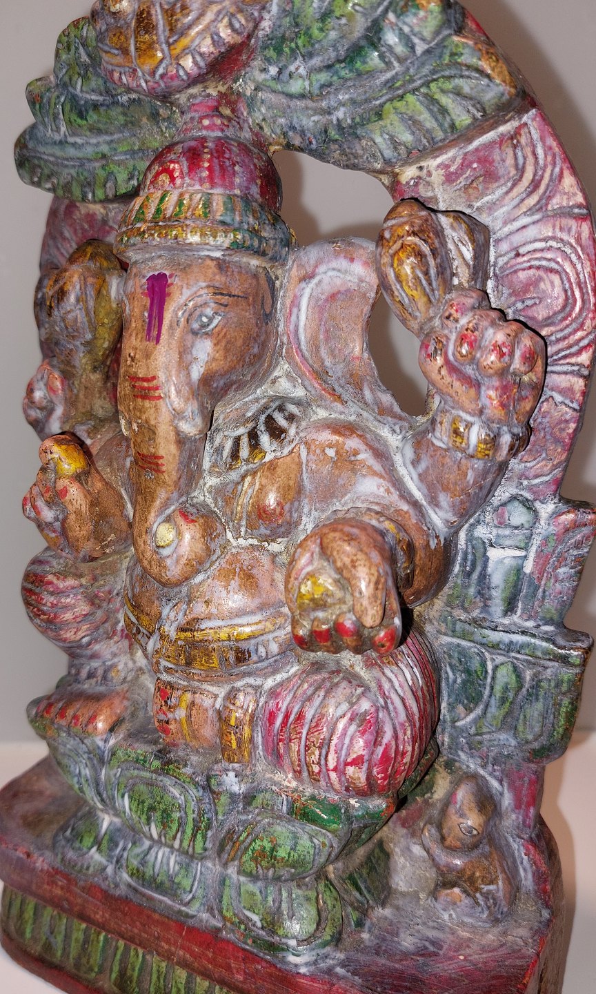 Bemalet figur skåret i træ forestillende den indiske elefantgud Ganesh. Fremstår I god stand. Mål: H. 24,5 cm L. 15,5 cm D. 6,5.cm