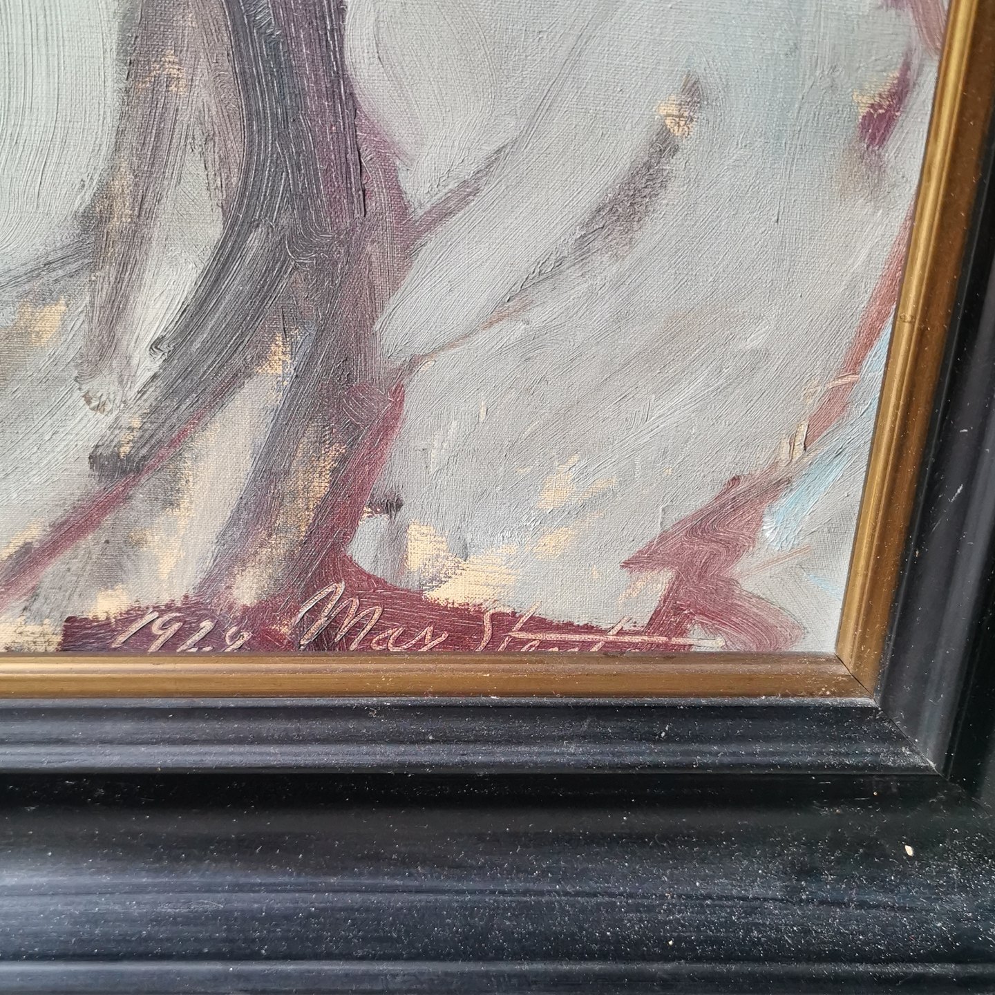 Olie på lærred: Portræt af smilende grønlandsk kvinde i anorak. Malet af Max Stentzer (1882-1968) i 1928. Både ramme og lærred fremstår i god stand uden skader eller reparationer. Mål incl. ramme: 72 x 92 cm.