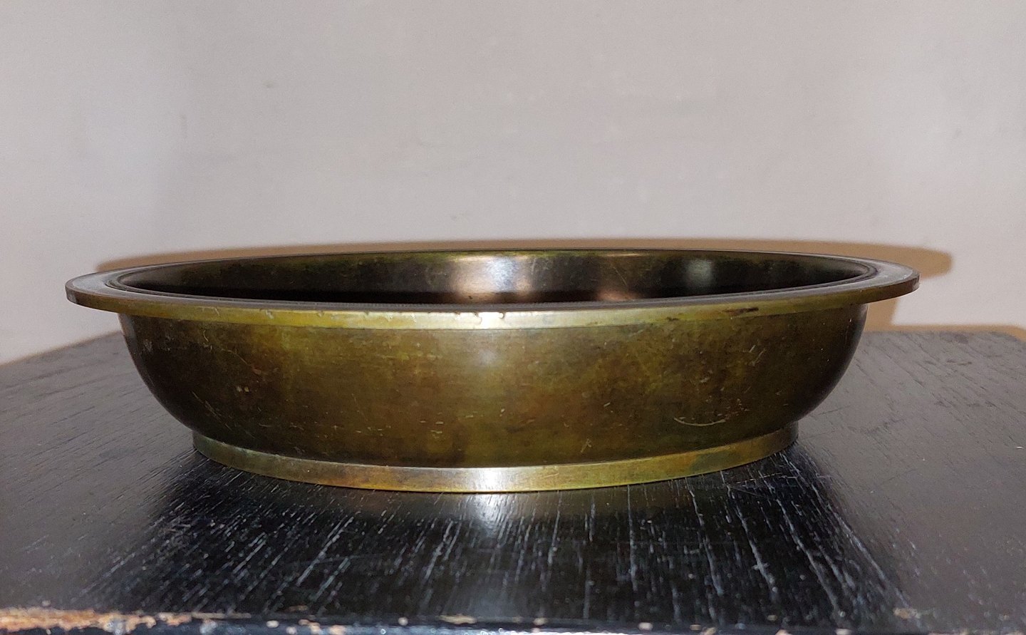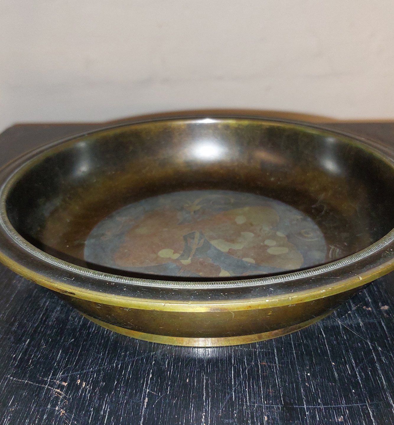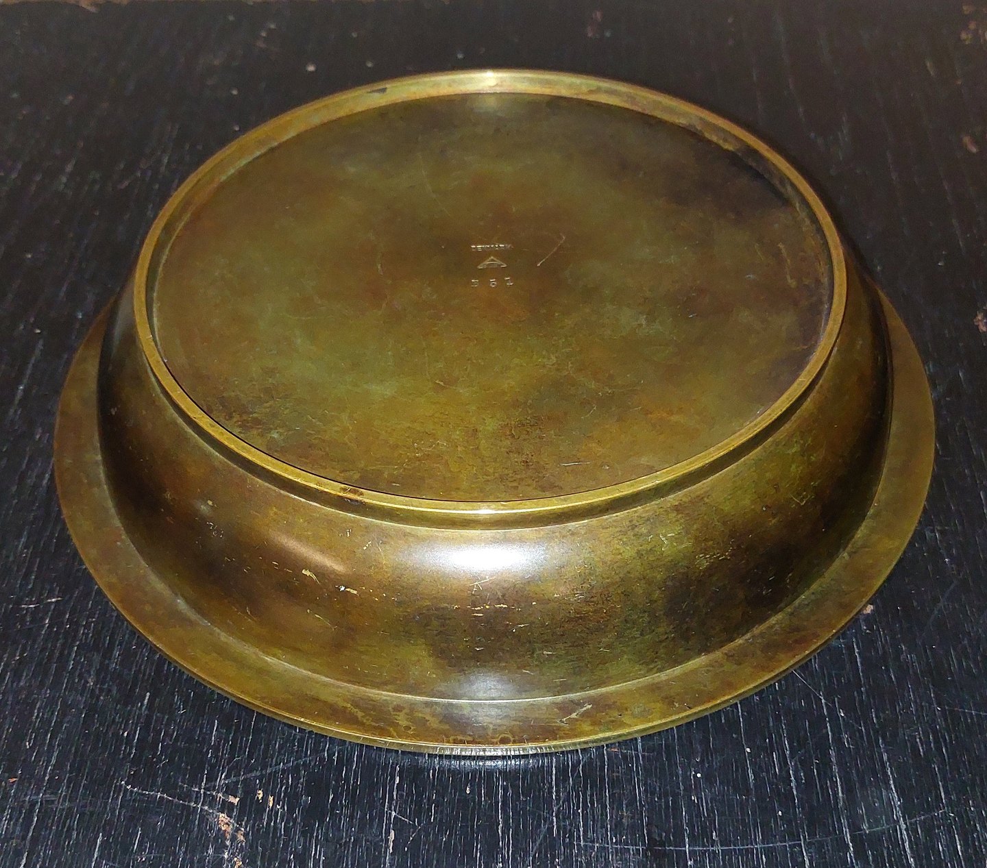 Broncr fad med dekoration af fisk fra Just Andersen broncestøberi. Fremstillet efter 1930. Fremstår I god stand med almindelige brugsspor. Ingen skader eller reparationer. Fabriksmærket på bunden. Mål: H. 4.5 cm Ø. 22 cm