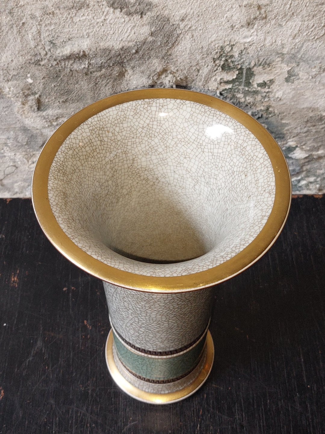 Cylindrisk vase med trompetformet åbning fra Royal Copenhagen. Dekoreret med grå og grøn krakeleret glasur. Fremstår I perfekt stand uden skader eller reparationer. Fabriksmærket på bunden. 1. Sortering. H. 24 cm.