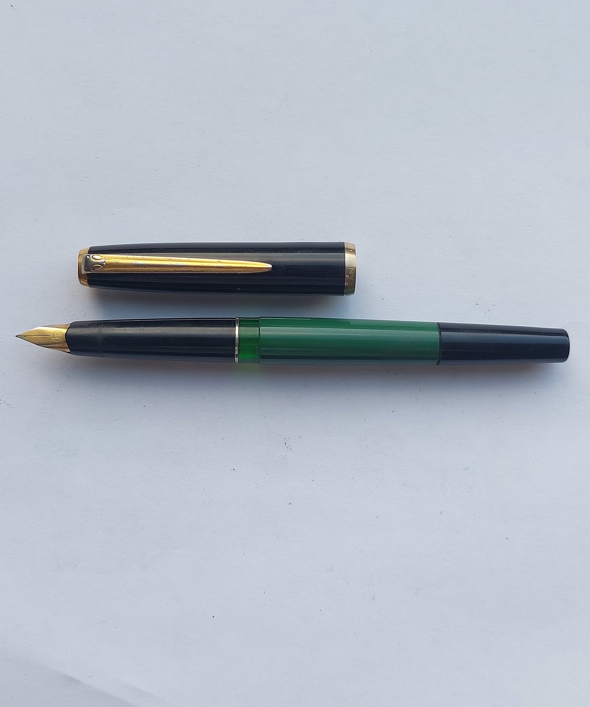 Green Pelikan fountain pen with black cap. Piston filler filling system. Works fine and therefore ready to be used. A little wear on the clip otherwise nothing to notice.