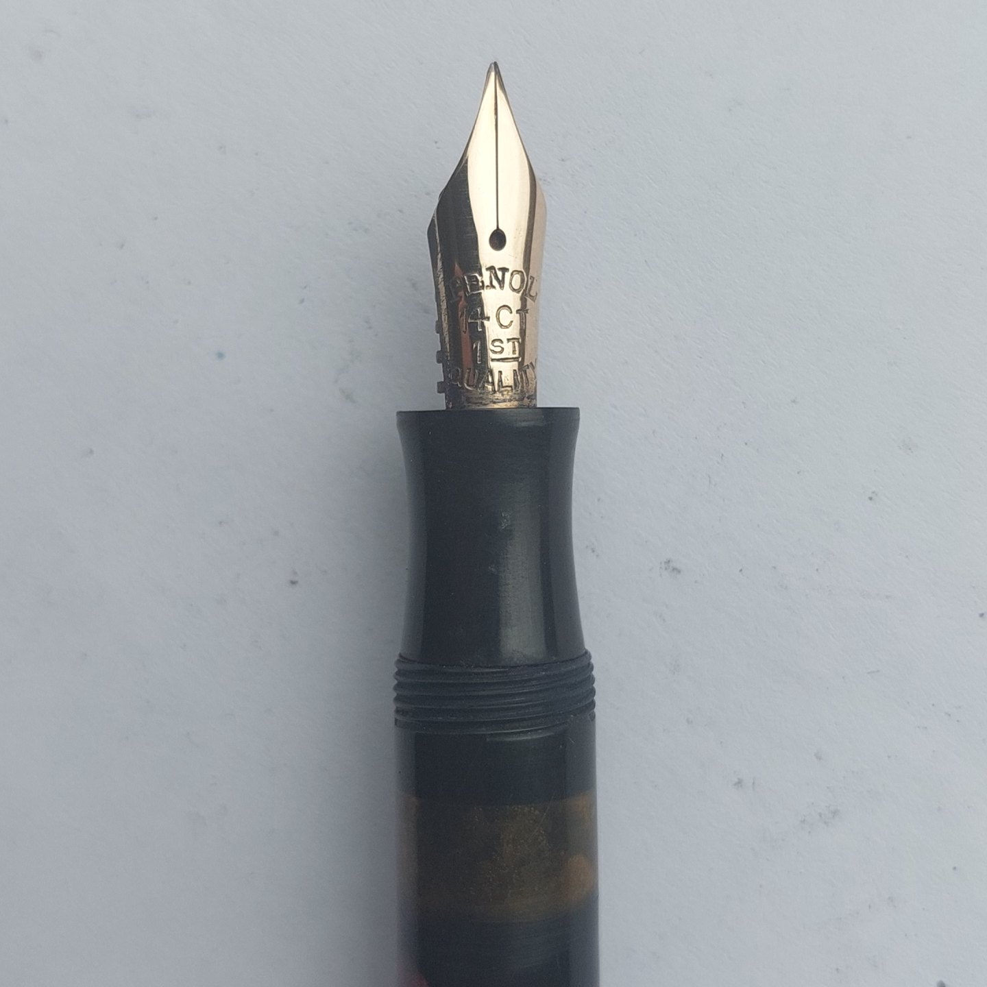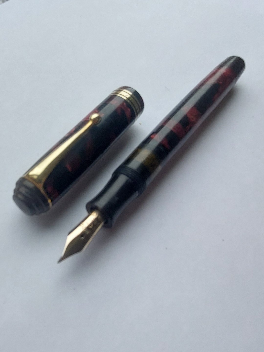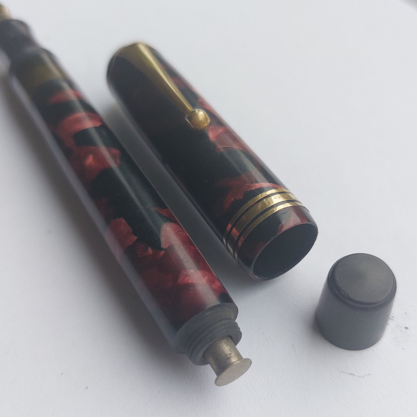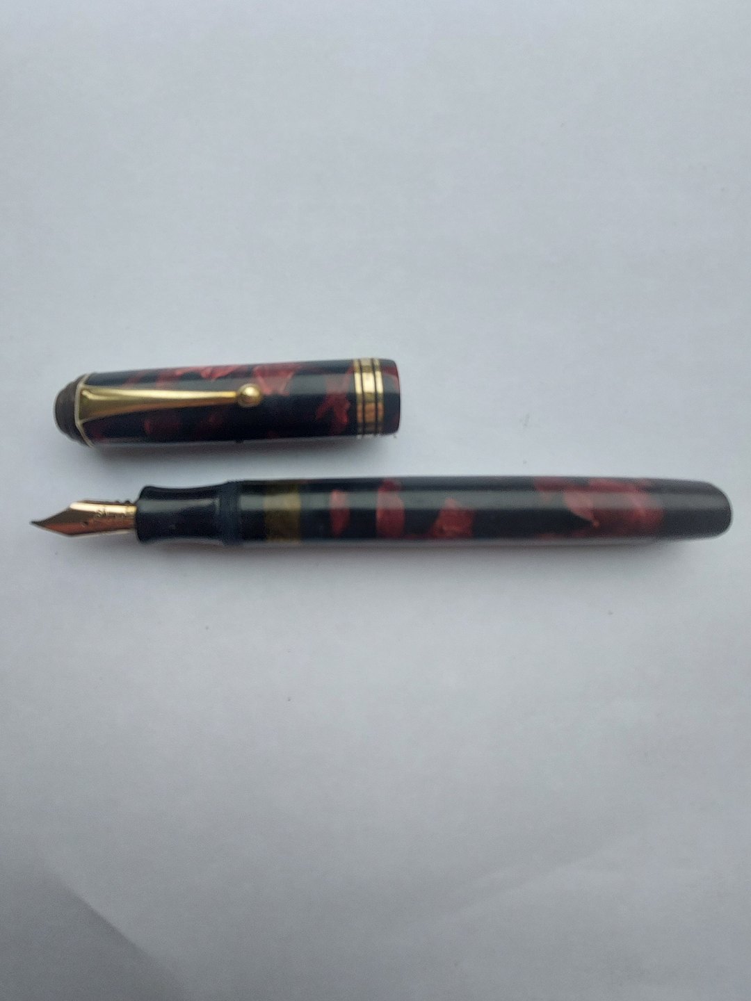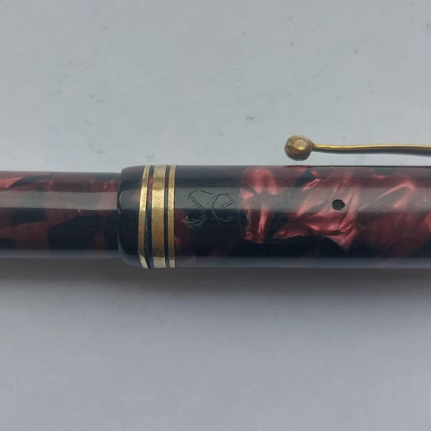 Penol fountain pen with red and black marbled surface. "Push button" ink filler. At the top of the cap is "Pyamide top" There is no factory logo, model number or model anywhere on the fountain pen. Factory name alone on the original 14 carat Penol gold nib. Engraved by hand "SC" on the cap. Otherwise in good condition. Does not work. A new rubber sac must be inserted before the fountain pen can hold ink and thus be functional. Inserting a new rubber sac costs an extra DKK 200