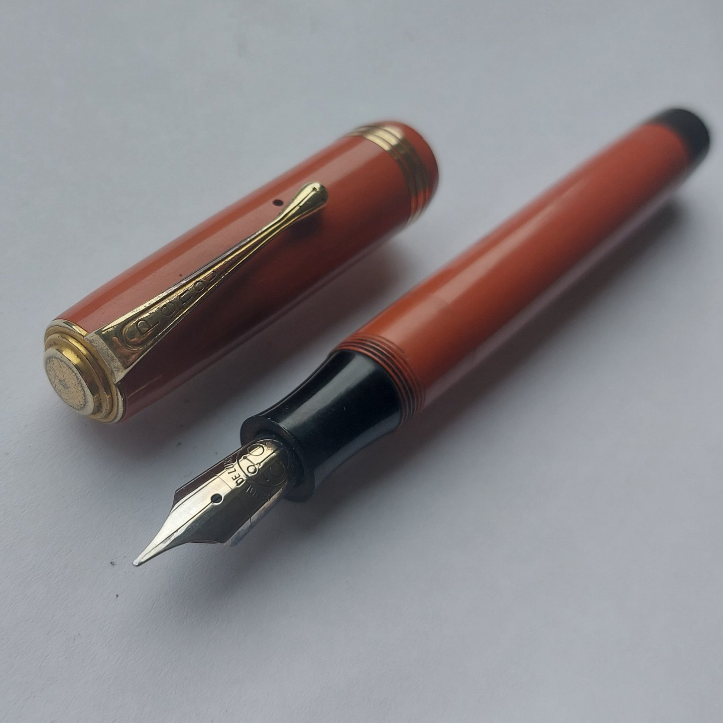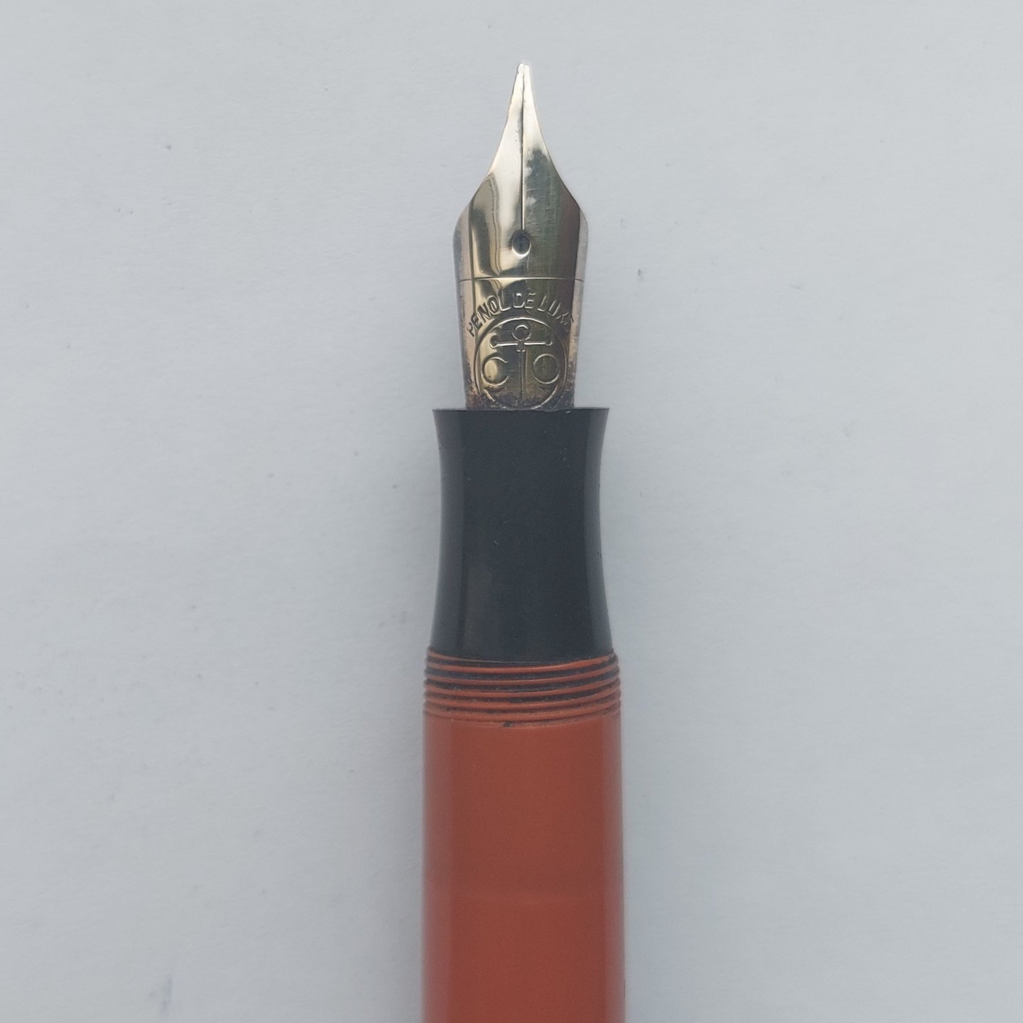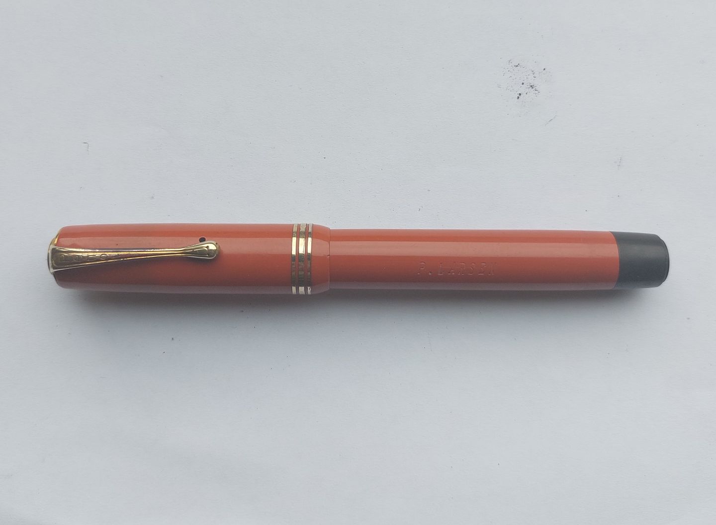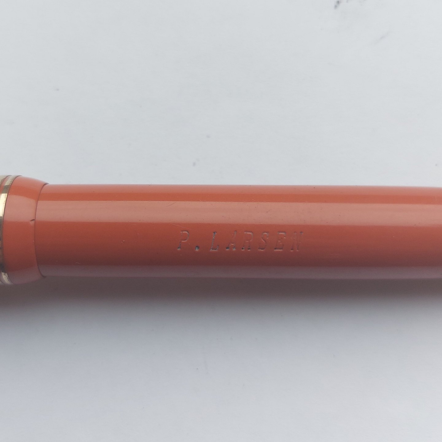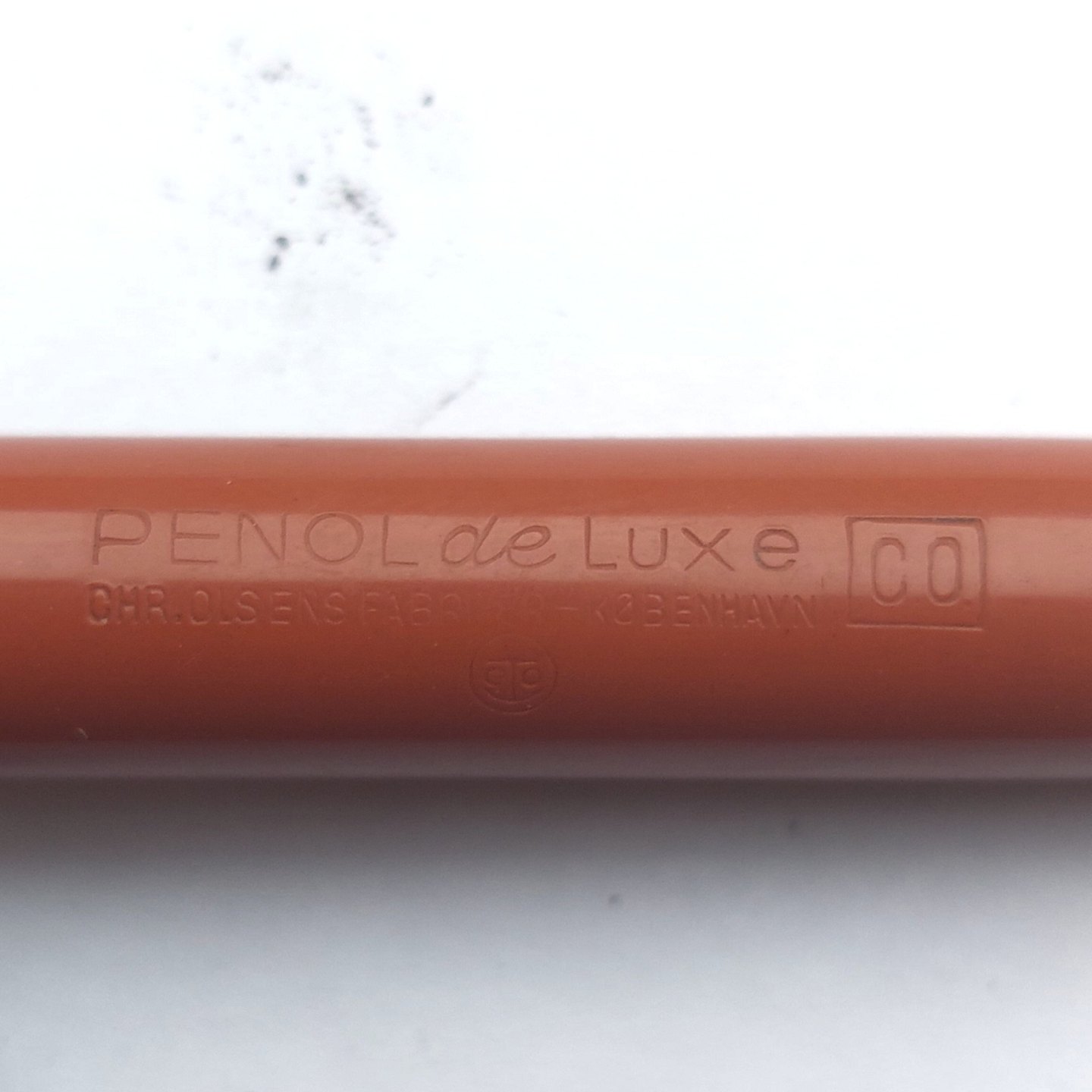 Koralrød Penol de Luxe fyldepen fremstillet I Danmark i 1940'erne. Push button blæk påfylder. Der er indgraveret navn på siden af pennen