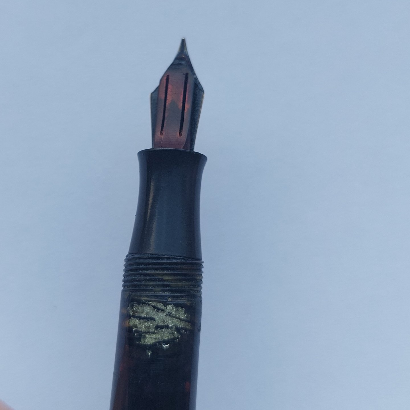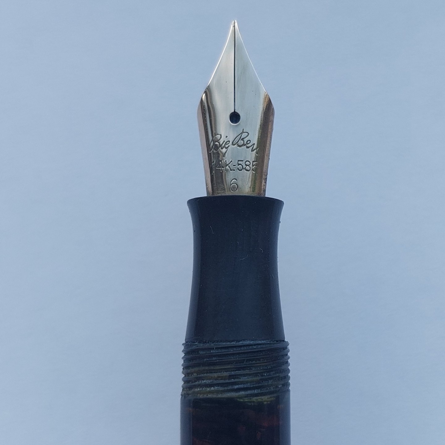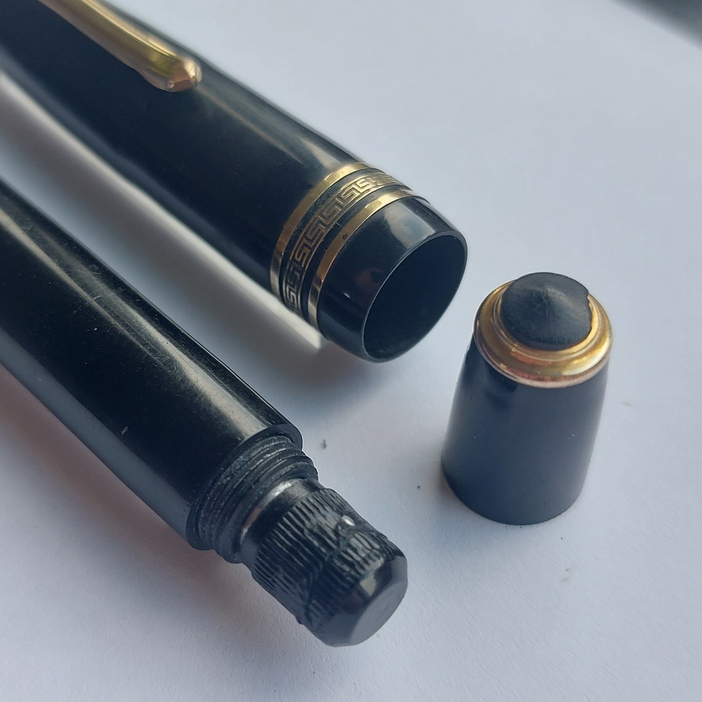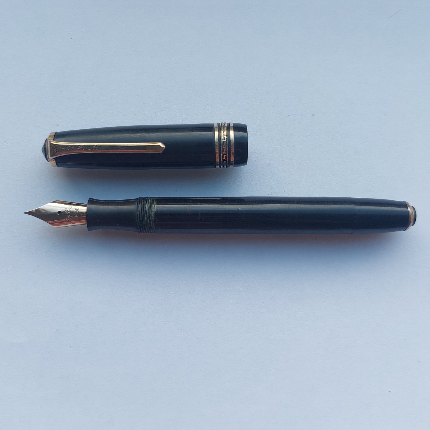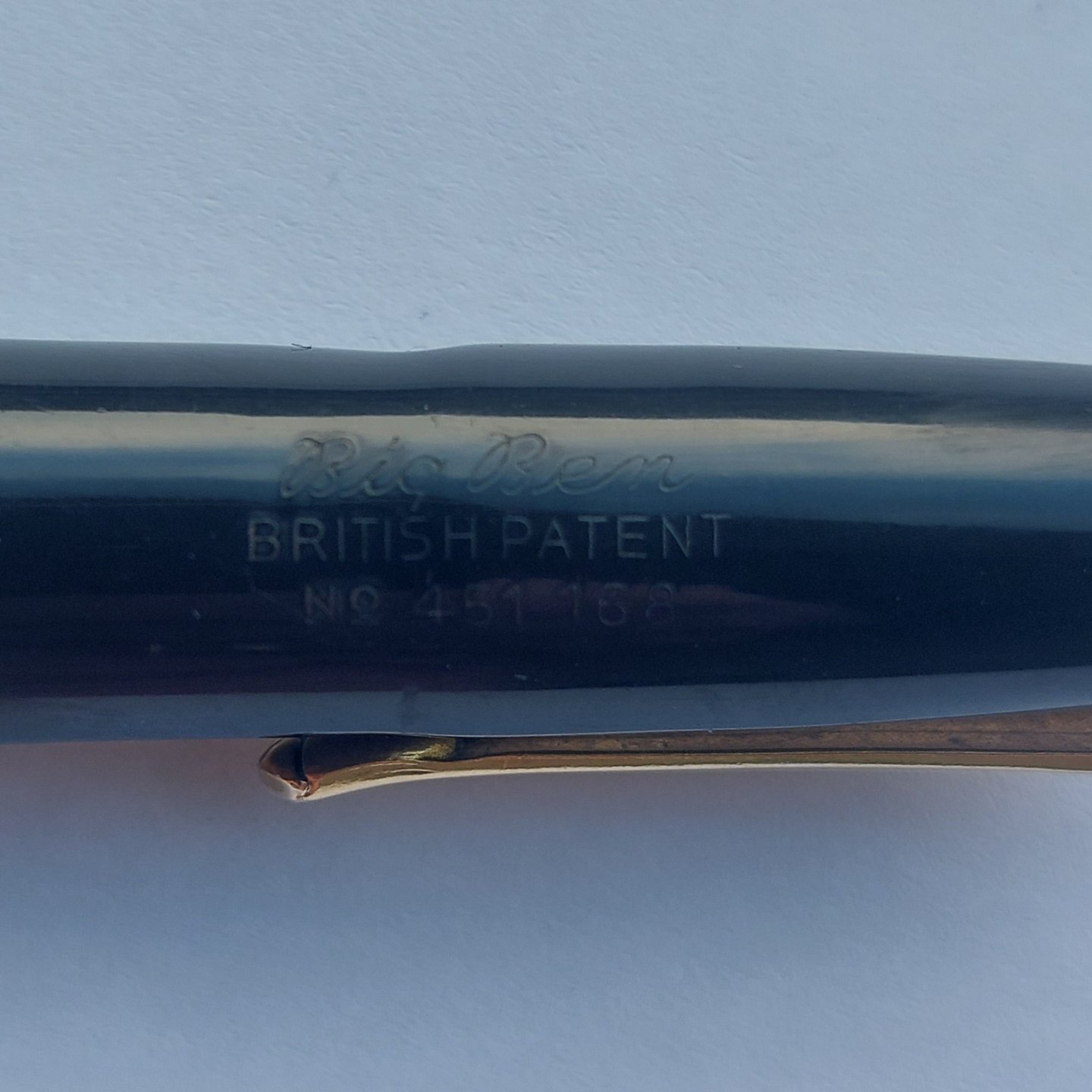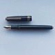Sort Big Ben fyldepen fra ca. 1950. Piston blæk påfylder. Er blevet testet. Holder blæk og således klar til at blive brugt. Hætten, med a la greque bort dekoration, er lidt bølget, men sidder fint på pennen. Hætten indgraveret BIG BEN British Product No. 451 168. Mål: L. 13.5 cm
