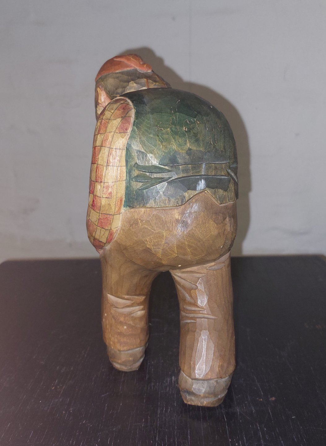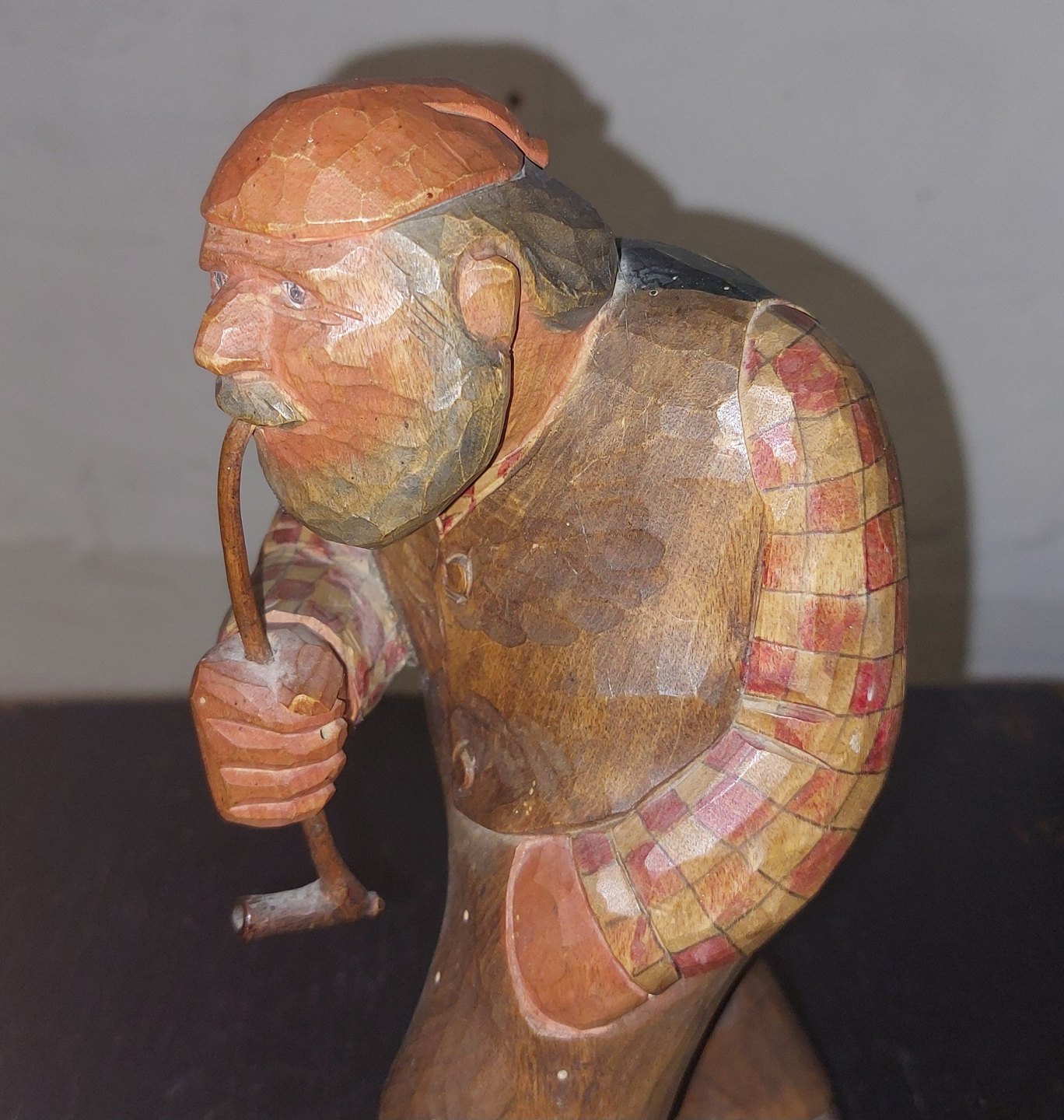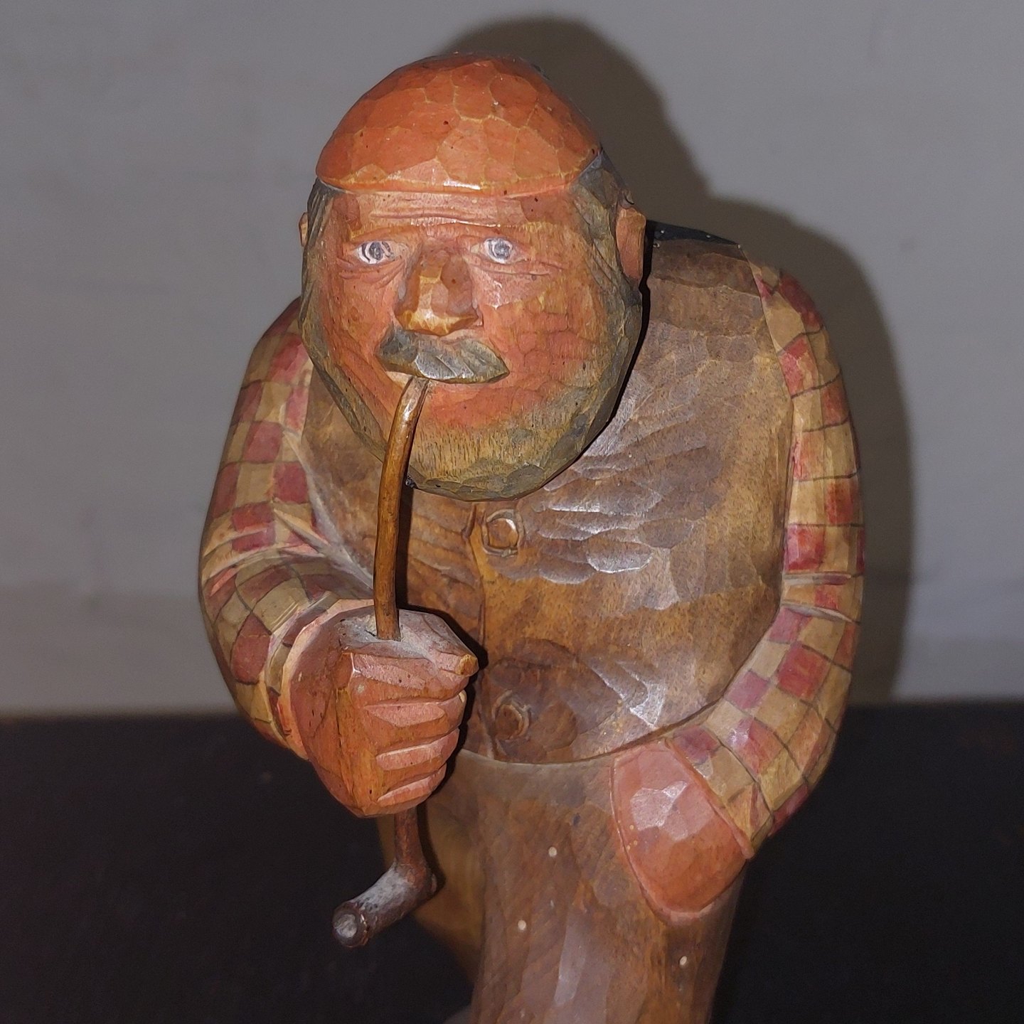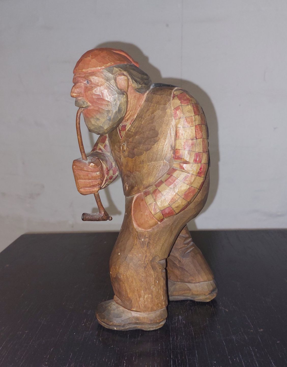 Håndskåret figur af mand der ryger på lang pibe. Iført ternet skjorte, vest samt rød hue på hovedet. Med højre hånd holder han på langpiben. I fin stand uden skader eller reparationer. Formodes fremstillet I Sverige. H. 21,5 cm