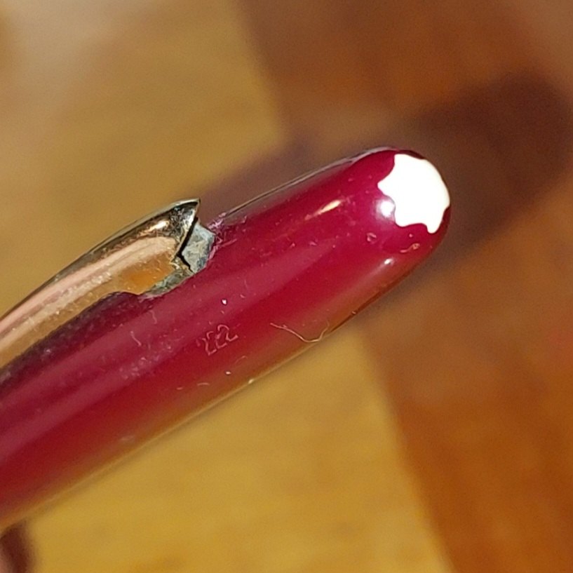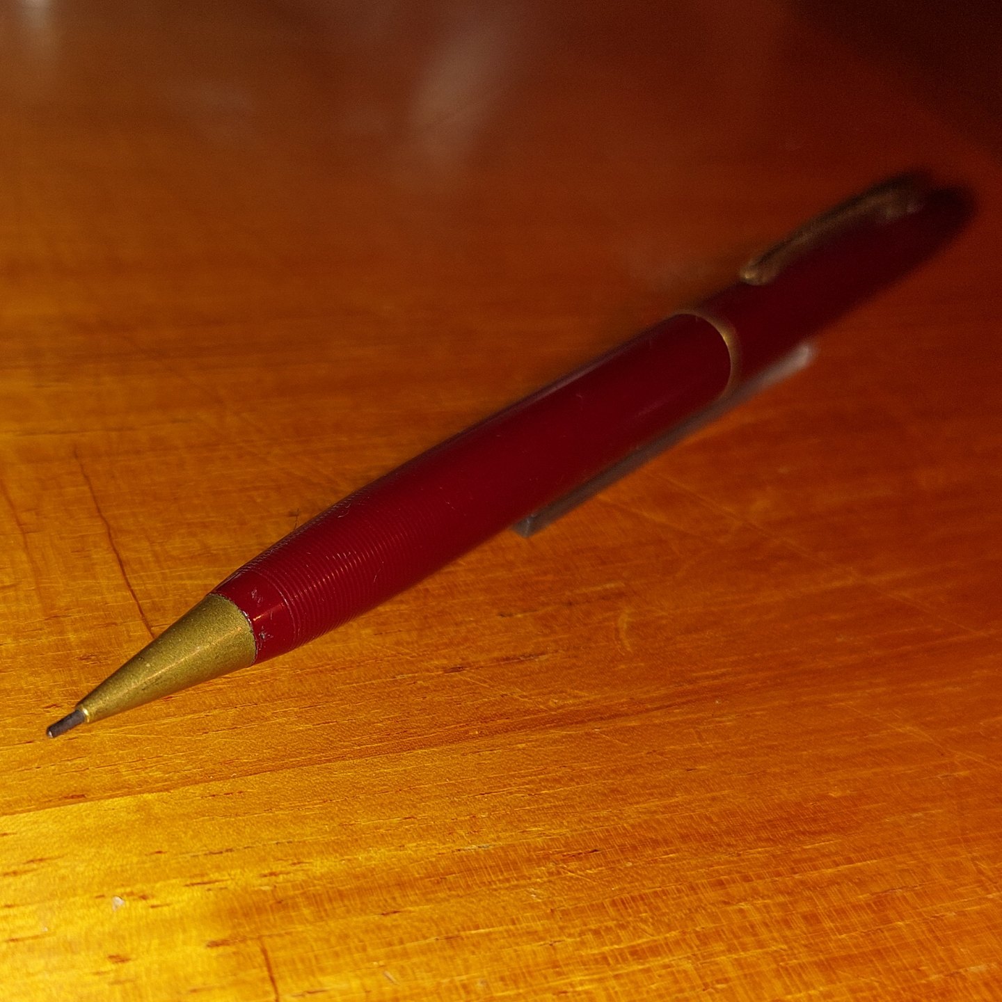 Long slim burgundy Montblanc No. 222 screw pencil. Model number engraved (see photo). Also engraved MONTBLANC above the belly belt. In good working condition.