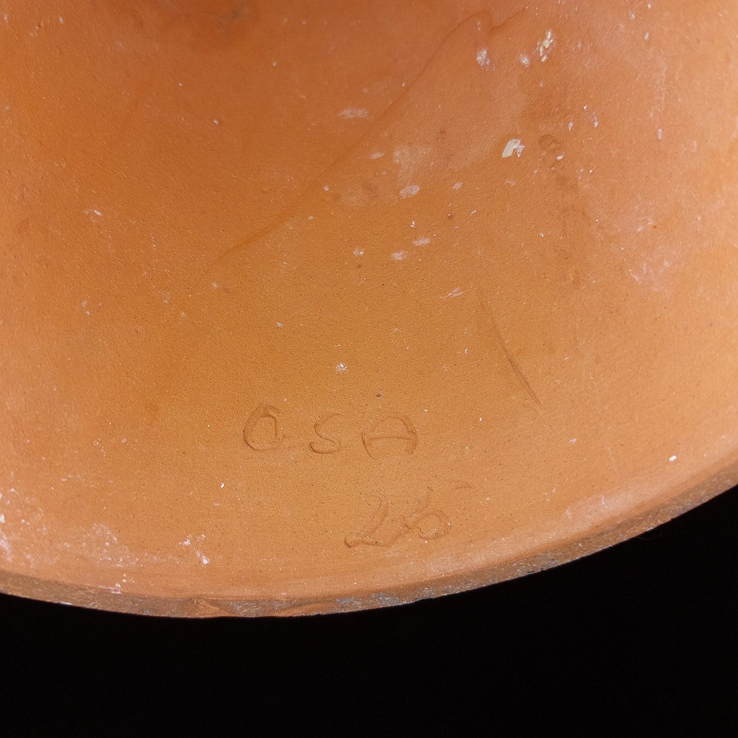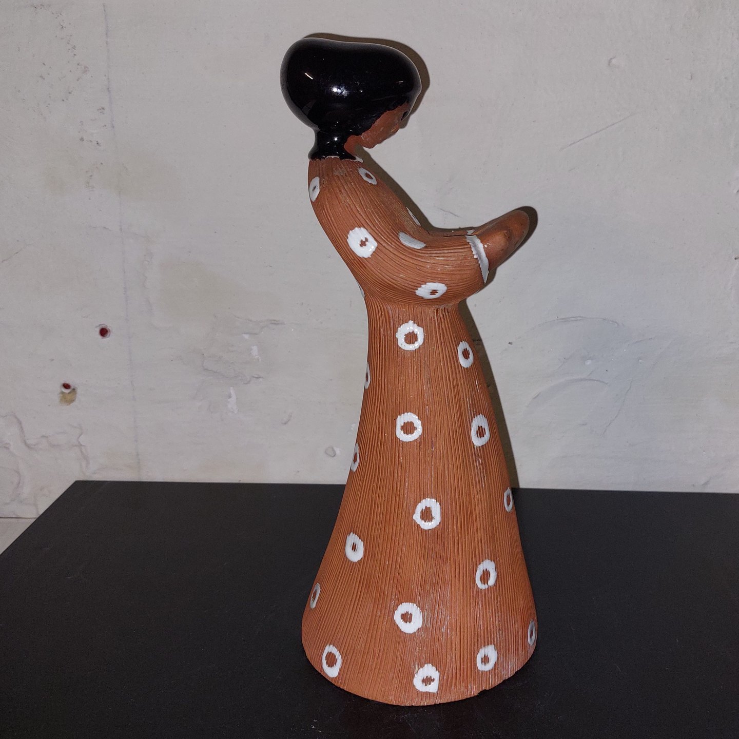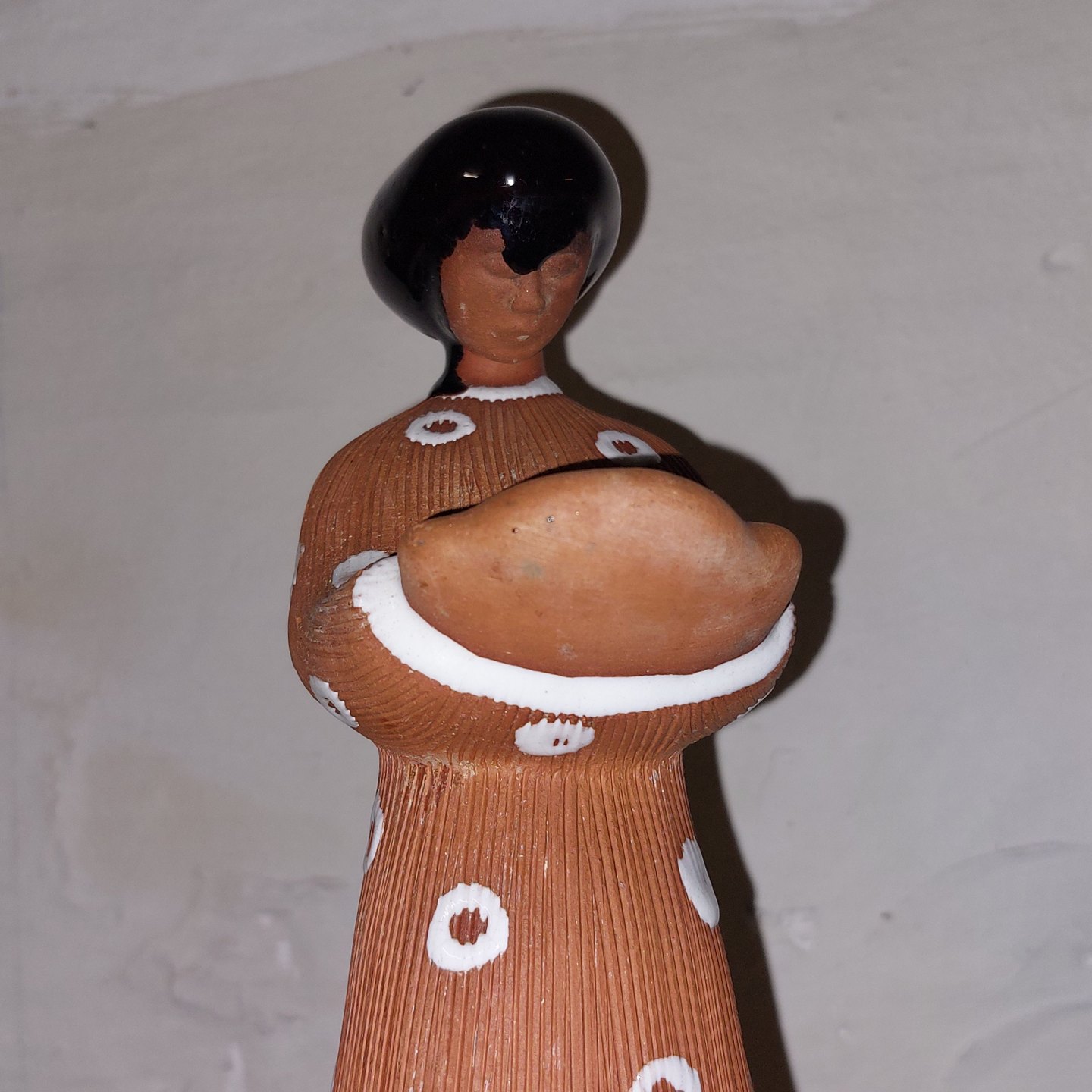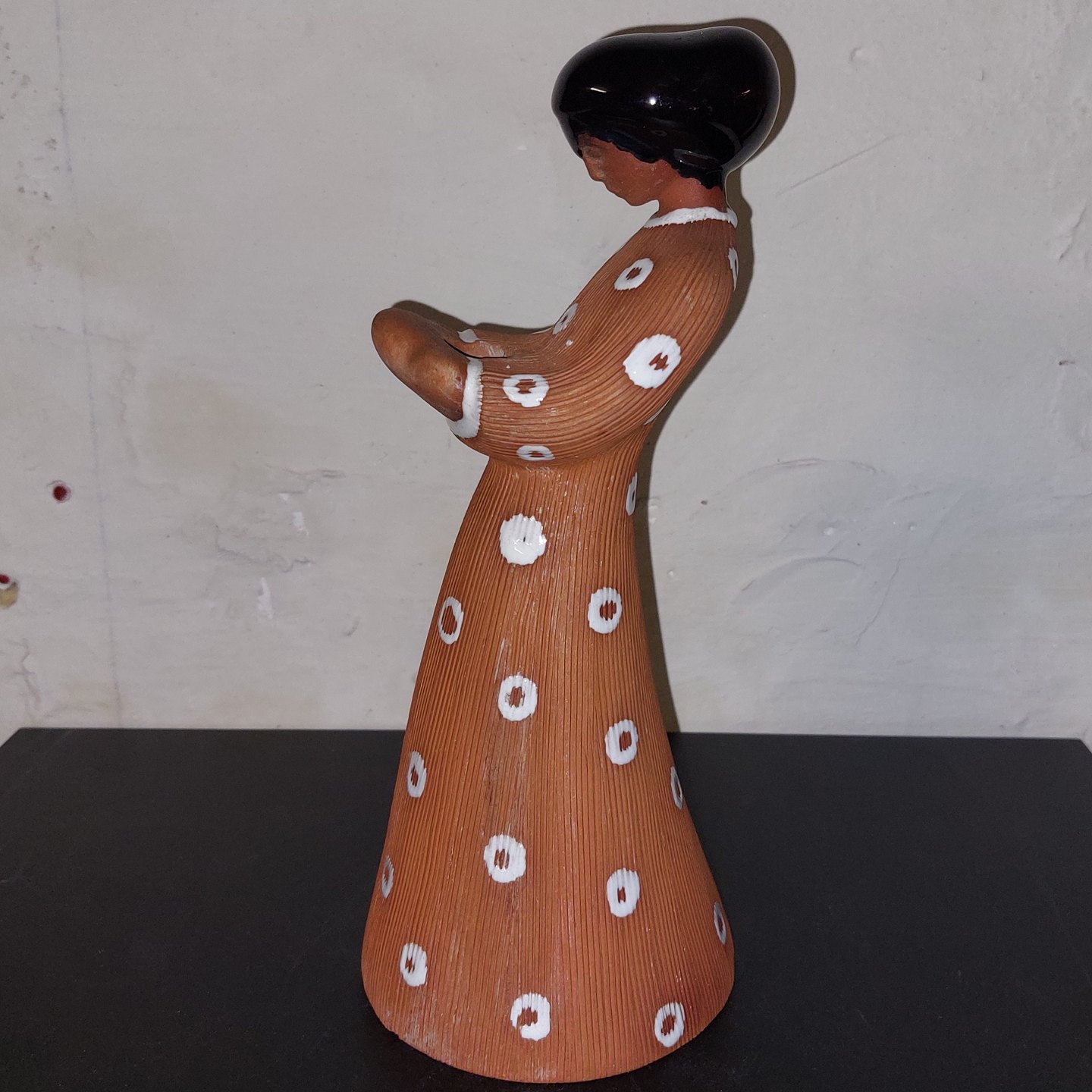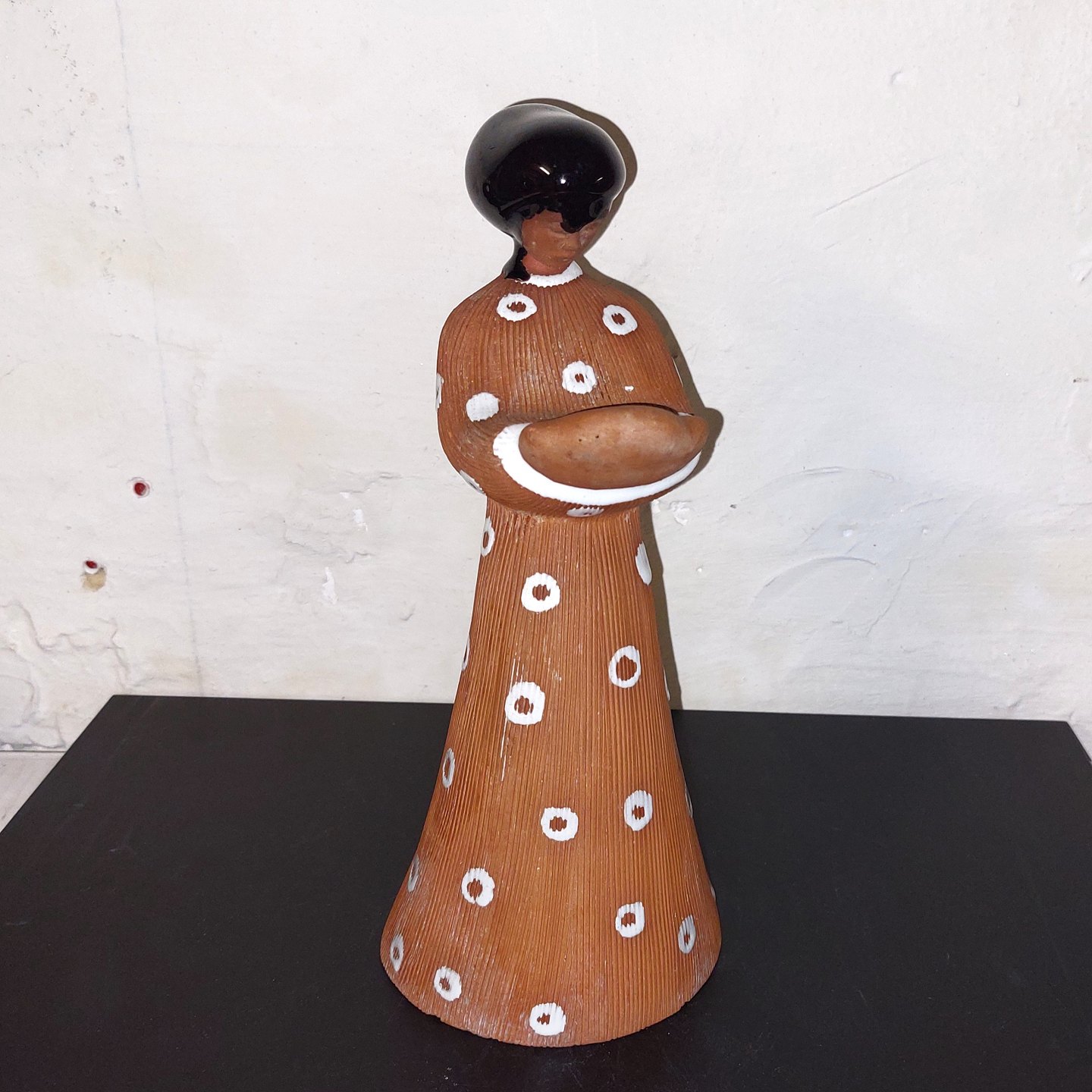 Figur I keramik af kvinde, der fungerer som lysestage. Delvist glaseret i hvid og sort. Fremstillet hos OSA, der var et arbejdsfællesskab, der havde sin begyndelse med tre kunsthåndværkere. Aase Feilberg, Chr. Frederiksen og Gutte Eriksen. Efterfølgende har andre kunstnere arbejdet i dette fællesskab. Figuren er i god stand og uden skader eller reparationer. Fabriksmærket på bundens inderside. H. 27 cm