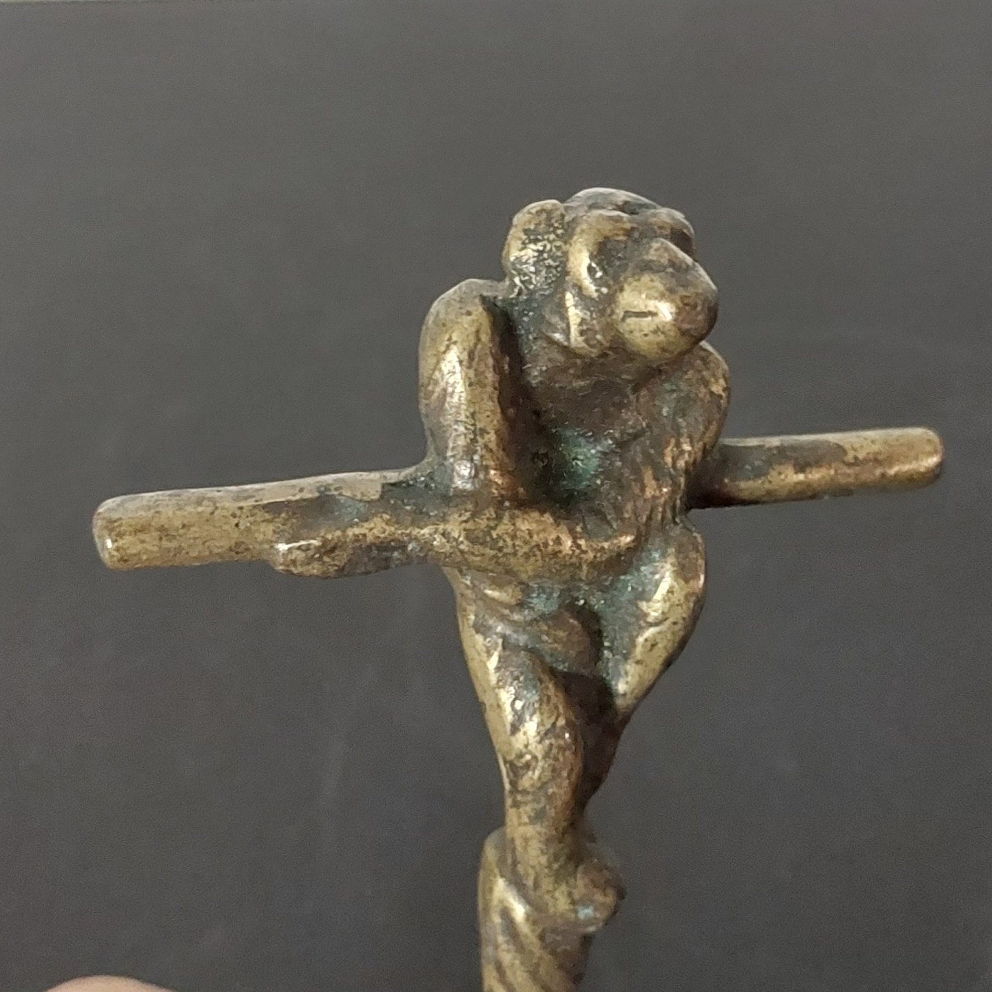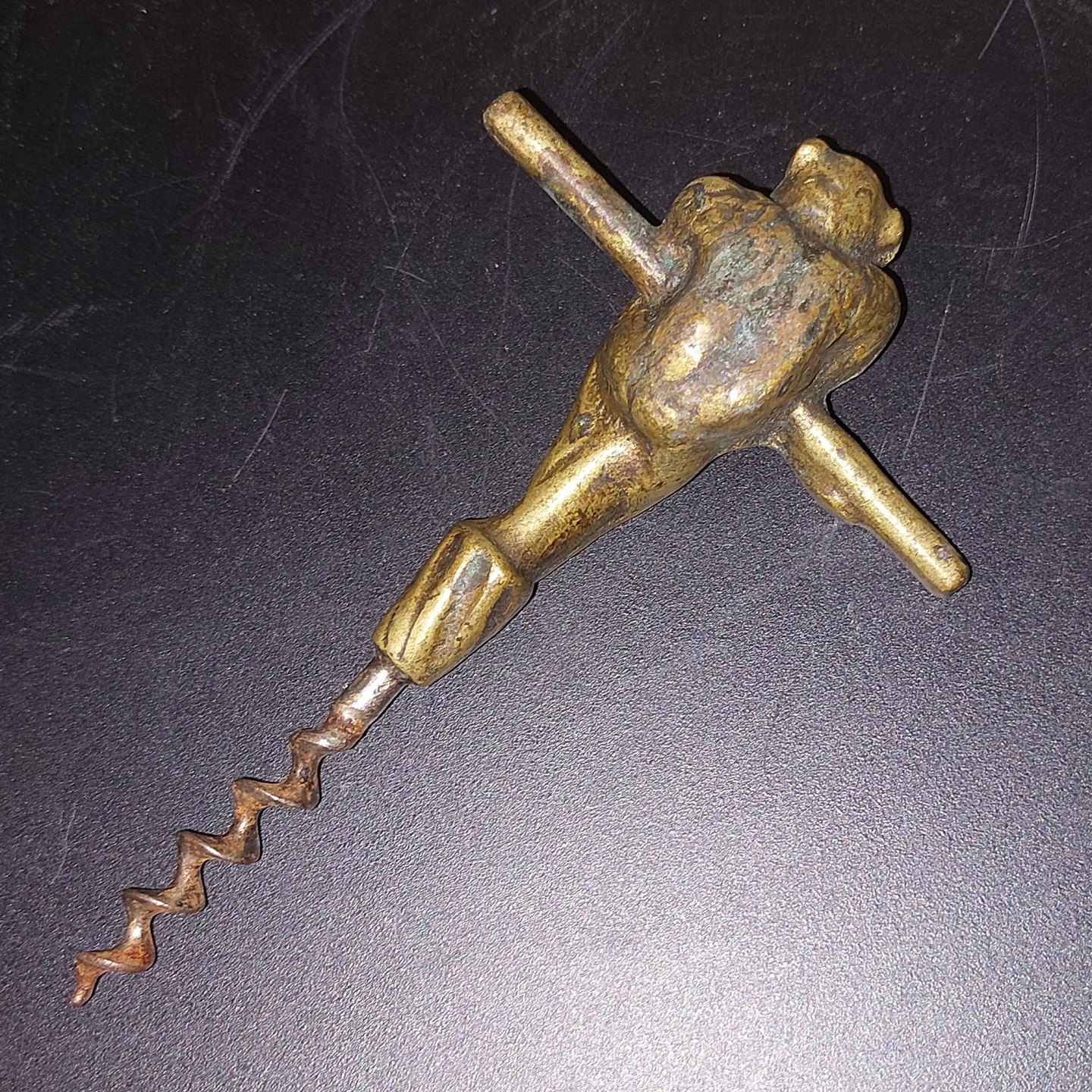 Dansk proptrækker I form af siddende eller hængende abe. Støbt i bronze omkring 1930. Skruen lidt rusten. Ellers klar til at blive brugt.