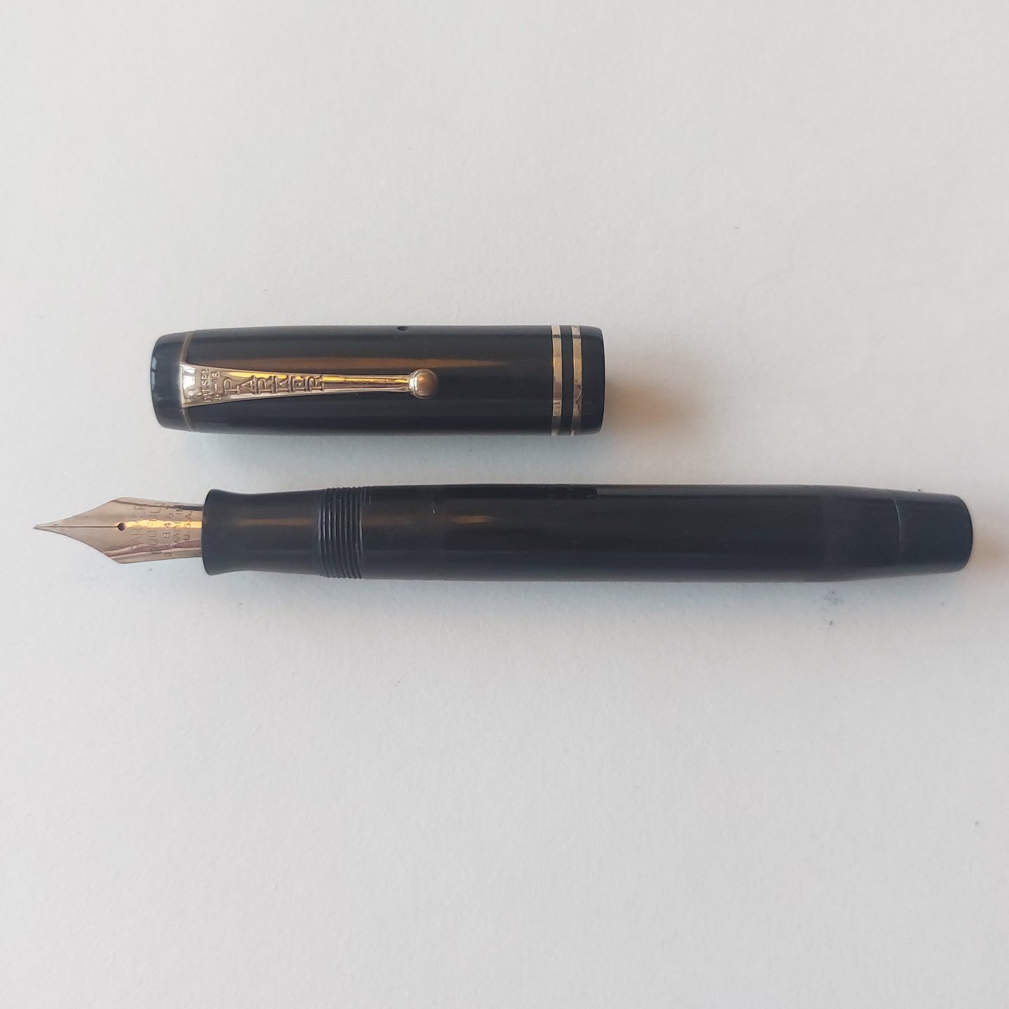 Sort Parker Duofold fyldepen fra 1940'erne. Fremstår I god stand uden skader eller reparationer. Alle dele originale Parker inclusiv en stor Parker Duofold 14 karat guldspids. Der skal indsættes ny gummisæk før end den fungerer igen. Ny gummisæk kan indsættes for et tillæg på kr..200,-