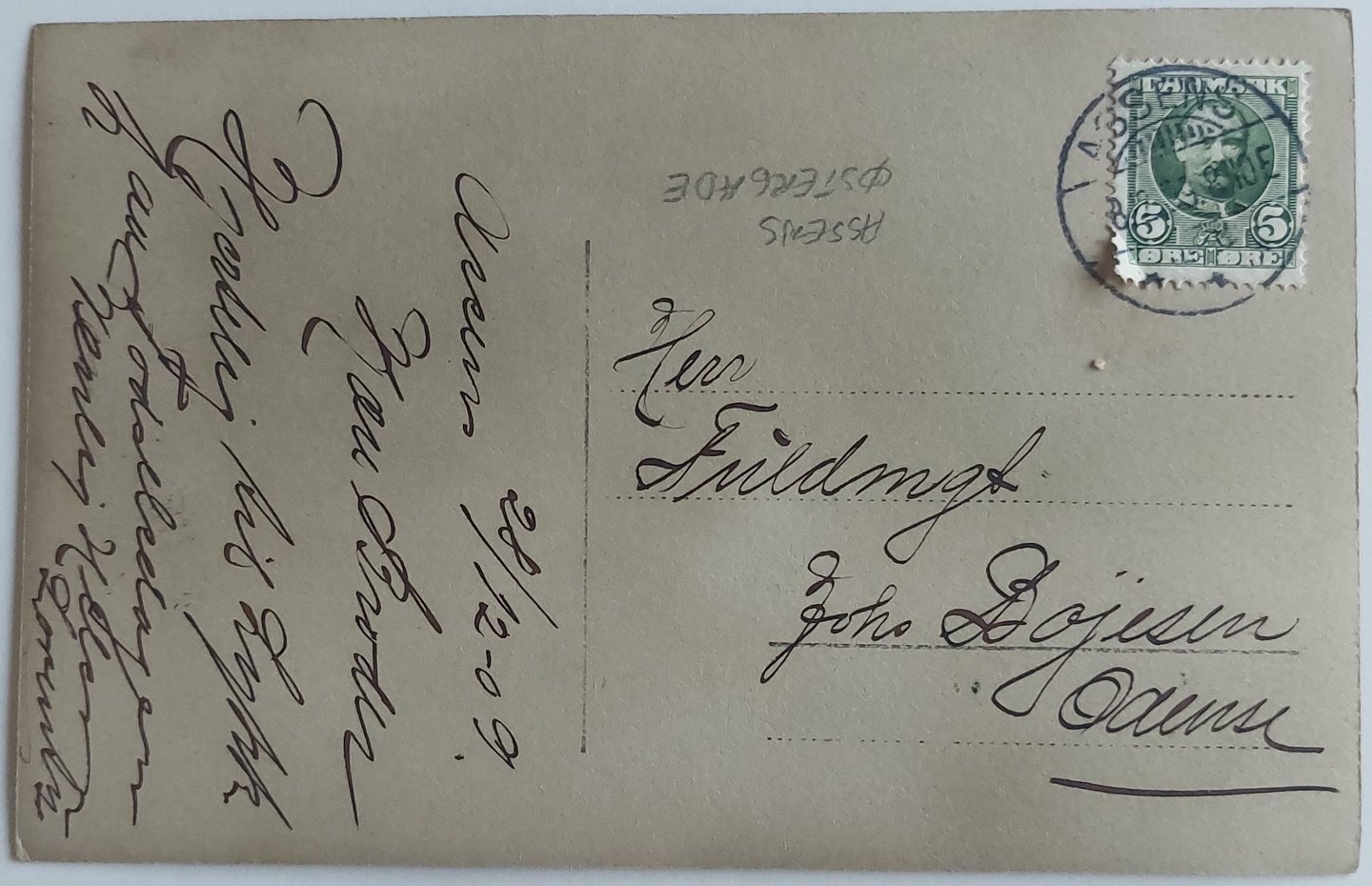 Postkort: Butiksfacade Beklædning. Annulleret ASSENS I 1909. I god stand.