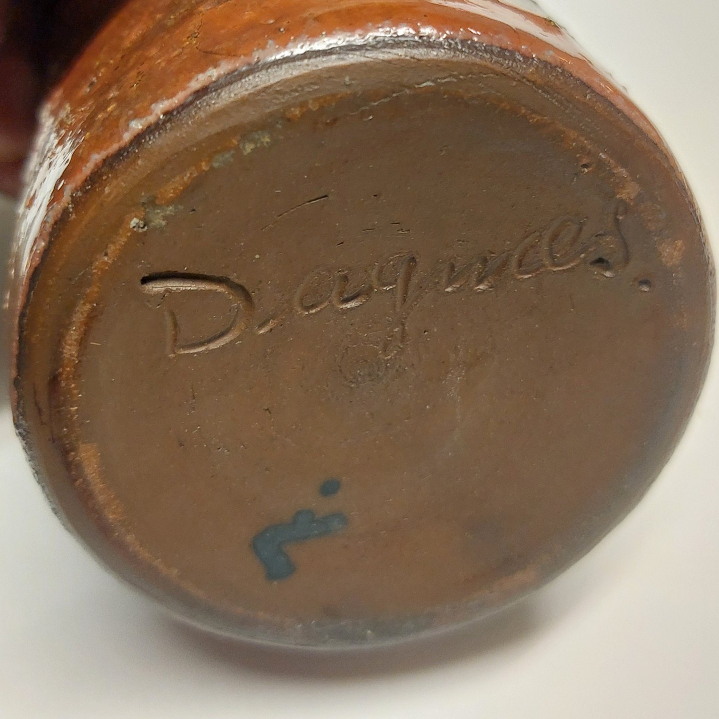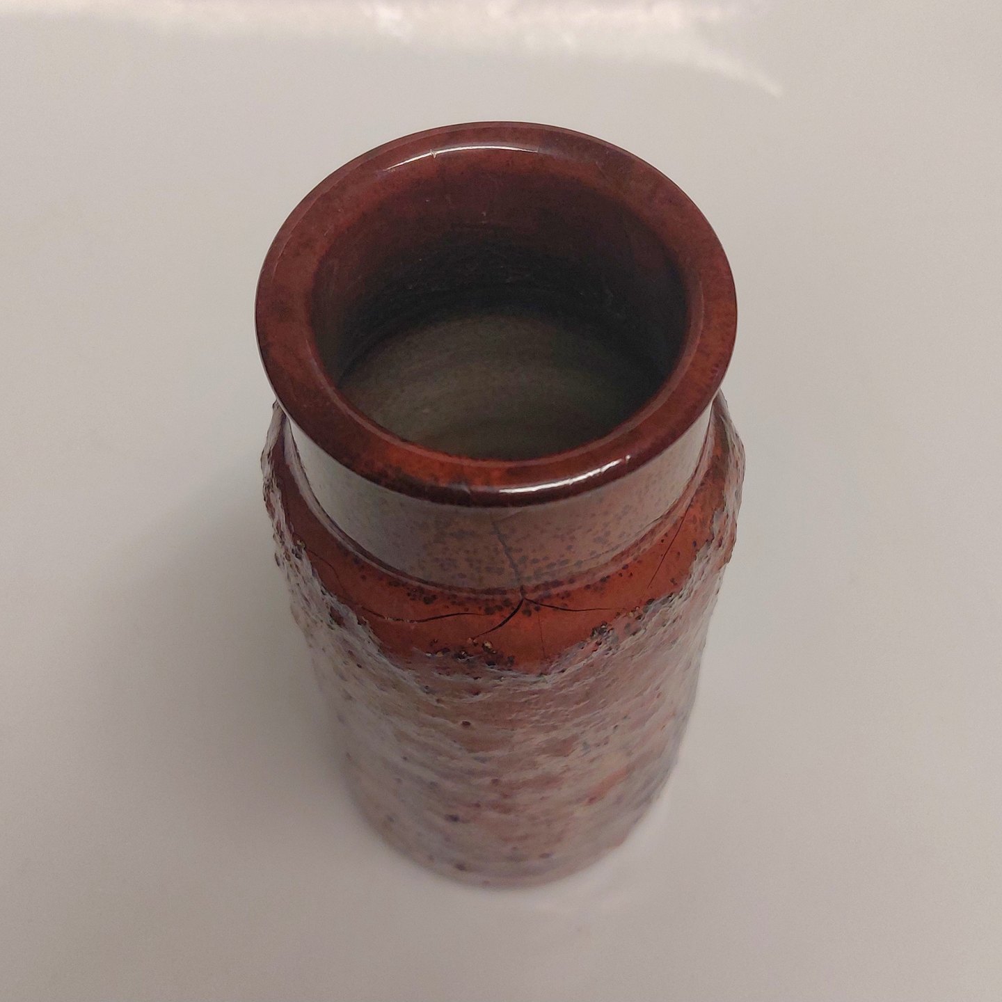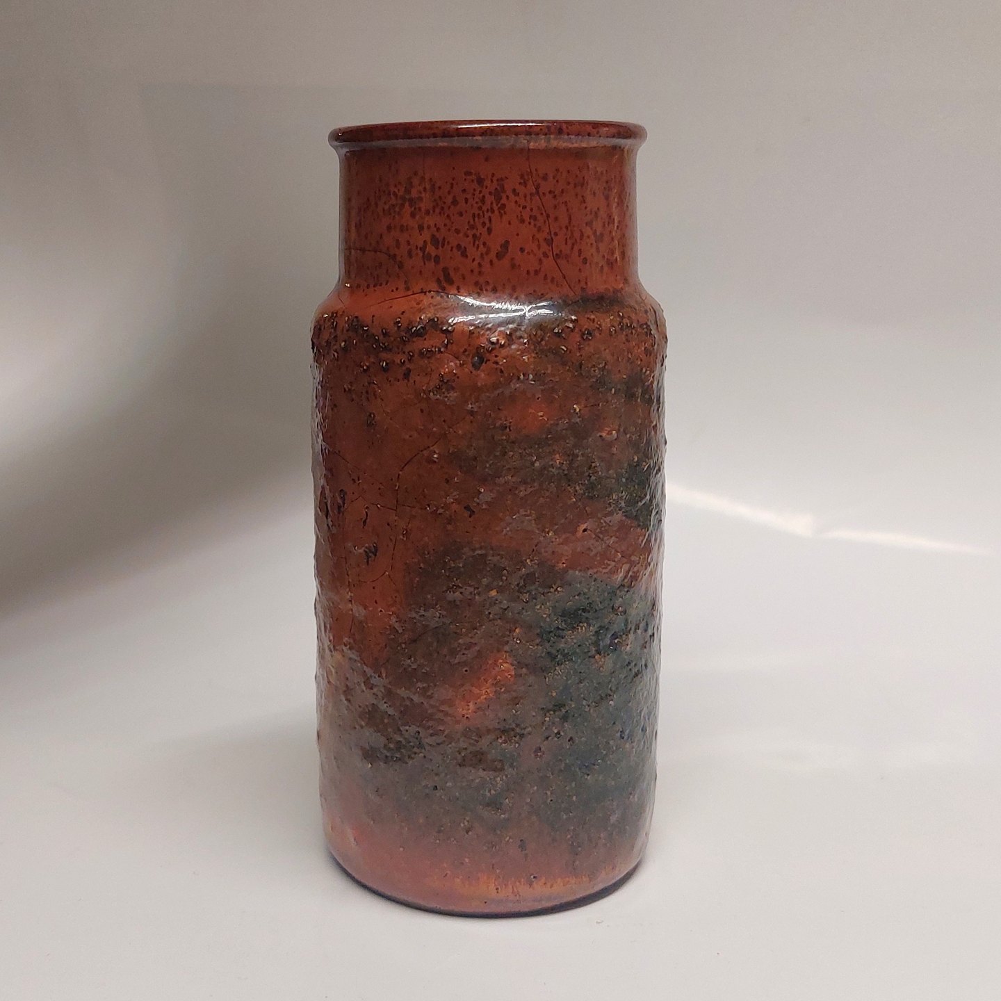 Nærmest cylindrisk vase I keramik fra Dagnæs keramikværksted. Delvist, under skuldrene, dækket af en tyk lava glasur. Fremstår I god stand uden skader eller reparationer. Fabriksmærket på bunden med indridset Dagnæs. H. 15 cm