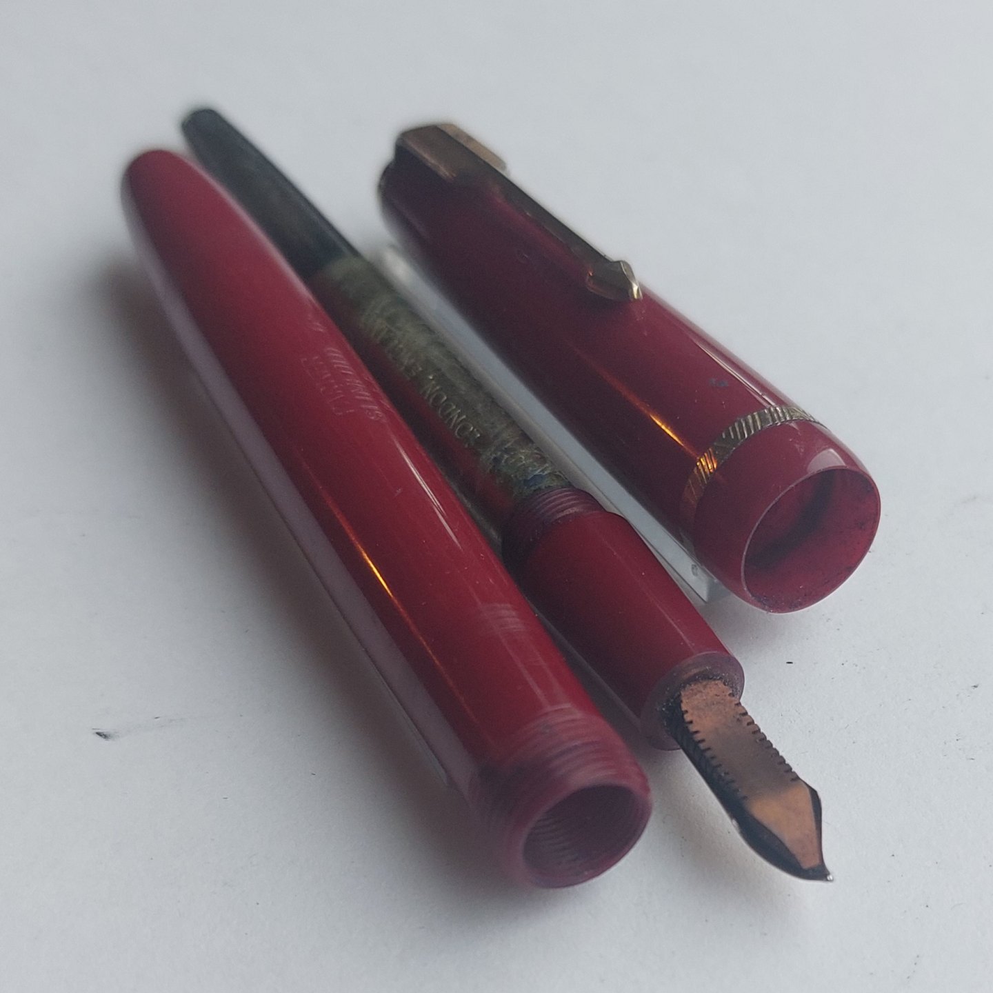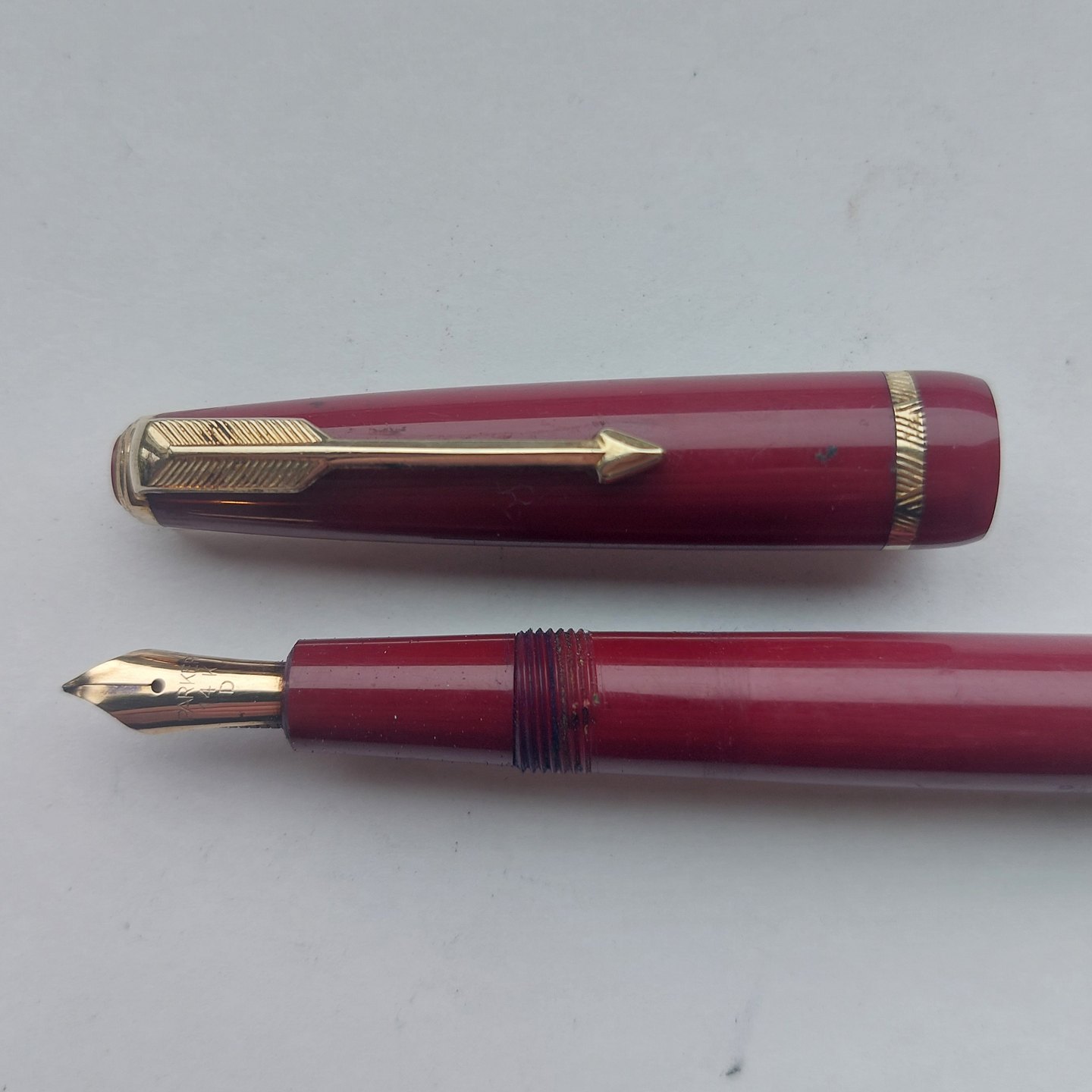 Slank bordeaux Parker Slimfold 6..M.I.D. (Made In Denmark) fyldepen. Fremstillet omkring 1960. Fremstår I god funktionsduelig stand uden skader eller reparationer. Alle dele originale Parker dele. L. 12,7 cm.