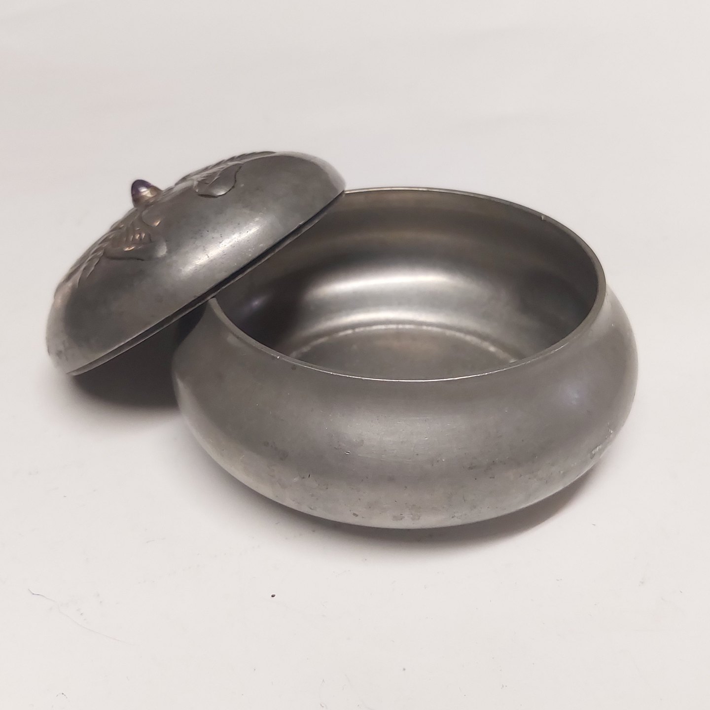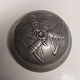 Mogens Ballin's Eftf.: Lågskål I tin med dekoration af bier på låget fra Hans Peter Hertz værksted, hvor man opfandt nye emner, men også fortsatte.med at producere effekter fra Ballin-perioden i Skønvirkestil.Mindre bule på siden. Mål: H. 8 cm inclusiv lilla sten. Underskoven diameter på midten måler 11,5.cm.
