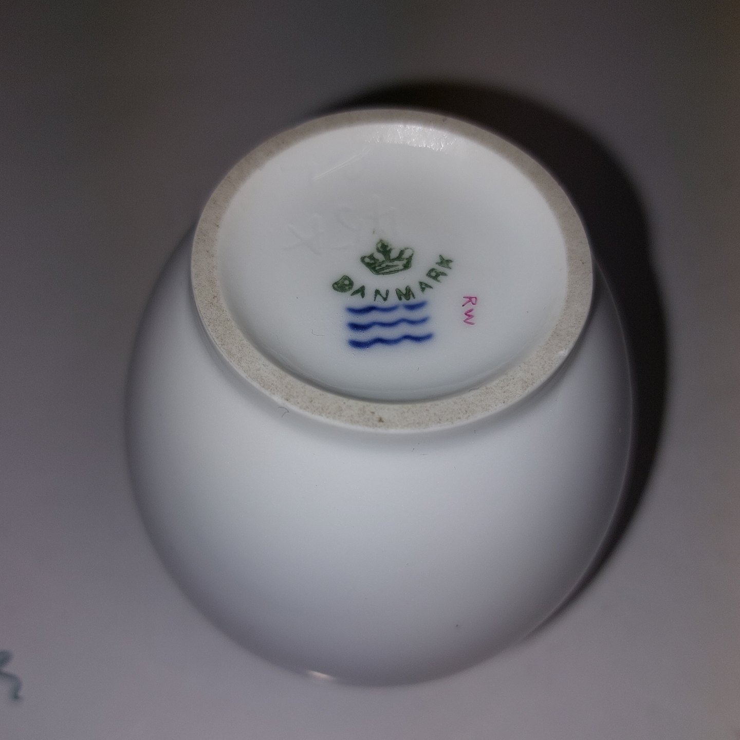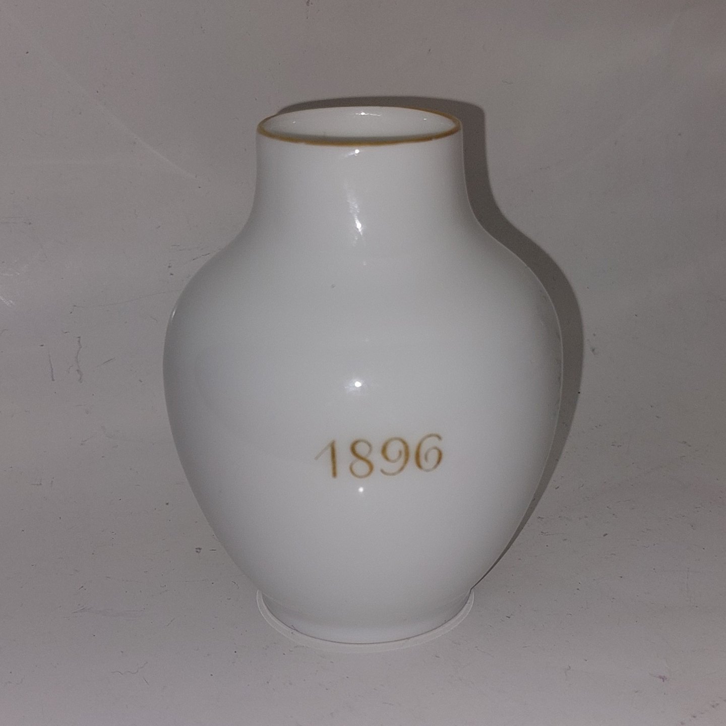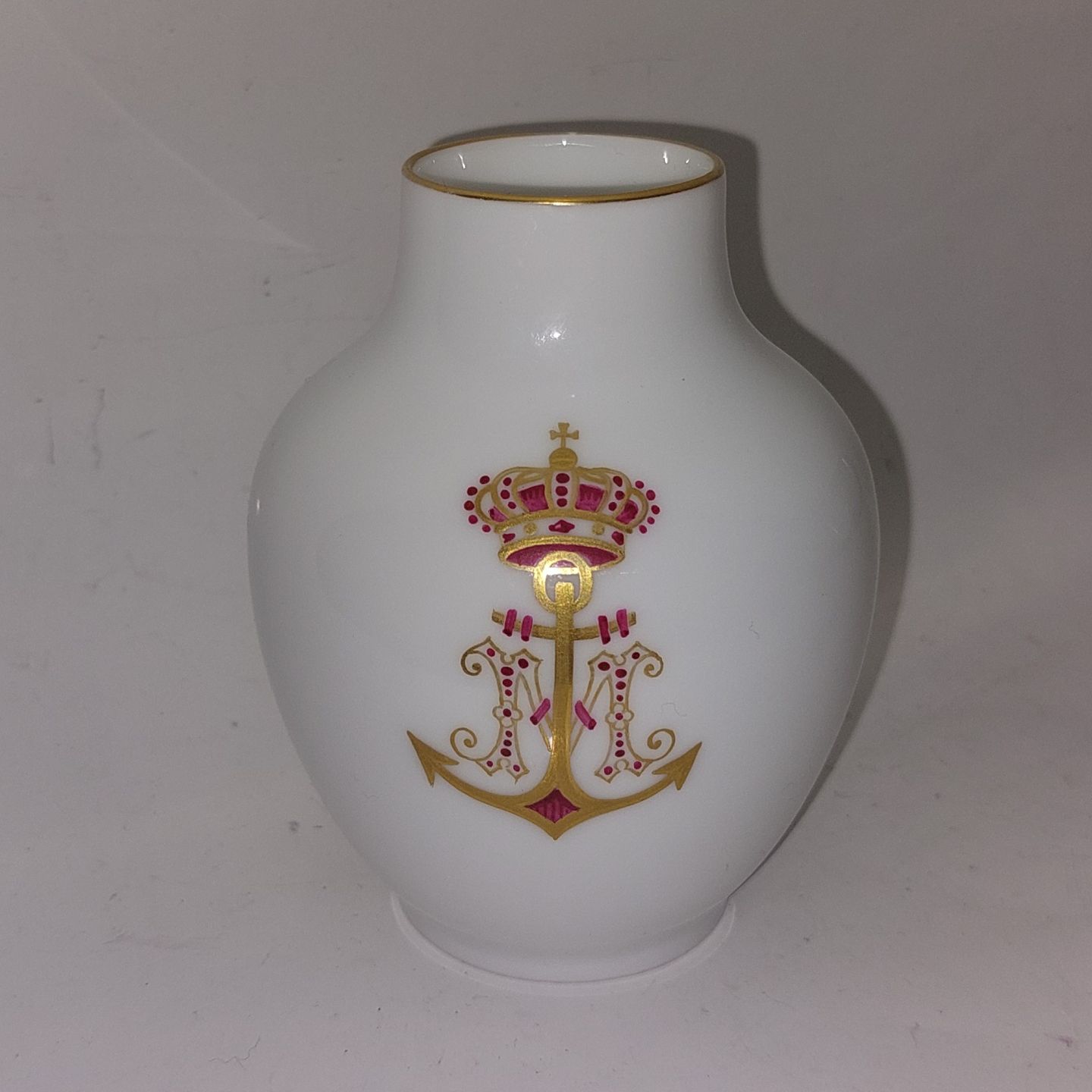 Skønvirkeperioden: Kuvertvase fra Royal Copenhagen med Prinsesse Marie (1865-1909) monogram M samt Anker i overglasur med årstallet 1896 på bagsiden. I god stand uden skader eller reparationer. Fabriksmærket på bunden. H. 10,5 cm