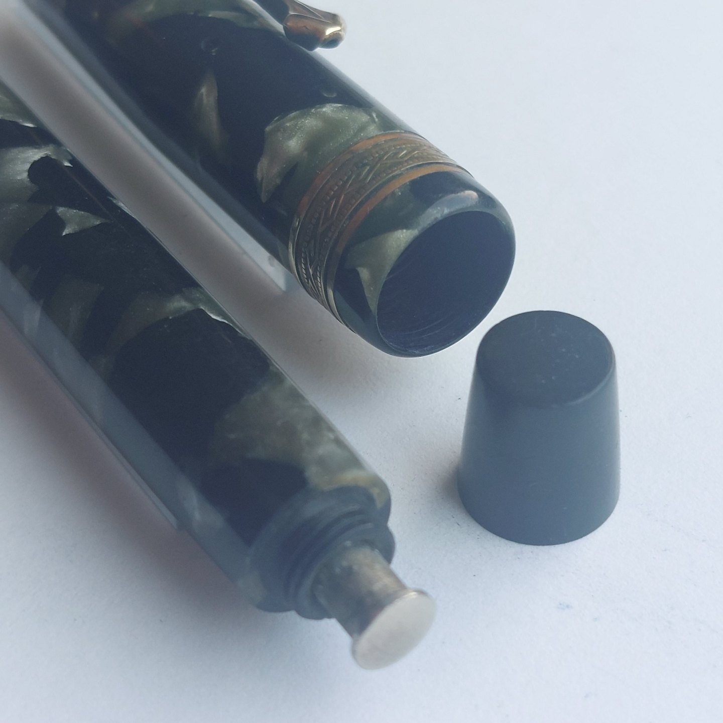 Grøn marmoreret Penol de Luxe (0) fyldepen. Push button blækpåfylder. Virker ikke. Der skal indsættes ny gummisæk før end den igen kan optage blæk og skrive igen. Alle dele originale Penol dele. Der kan indsættes ny gummisæk for kr. 250,-fyldepennen er 11,8 cm lang.