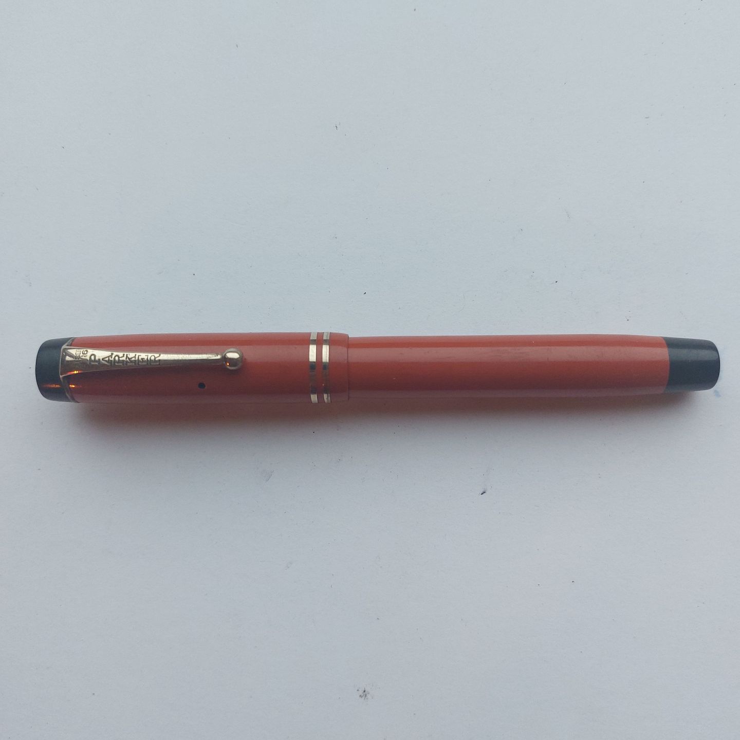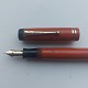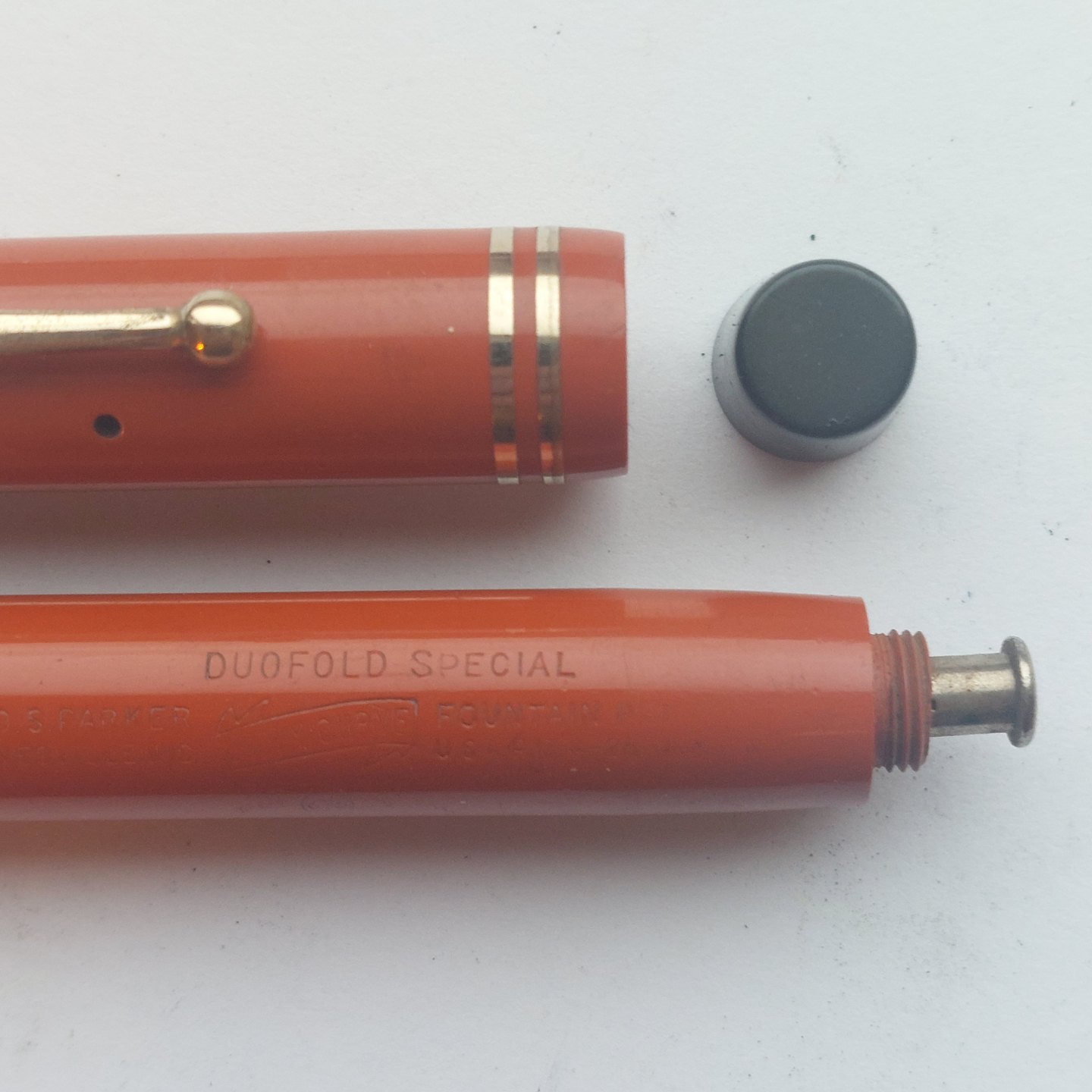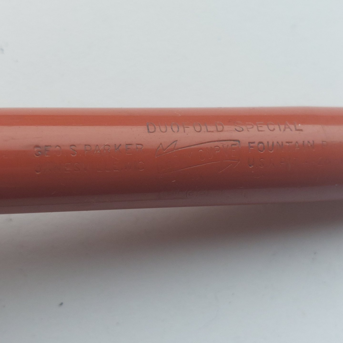 Koralrød Parker Duofold Special Lucky Curve Fyldepen. Push button blækpåfylder. Fremstår I god stand. Der skal indsættes ny gummisæk før end den kan optage blæk og skrive igen. Alle dele originale Parker inclusiv en 14 karat Parker Duofold guldspids. L. 12,7 cm.