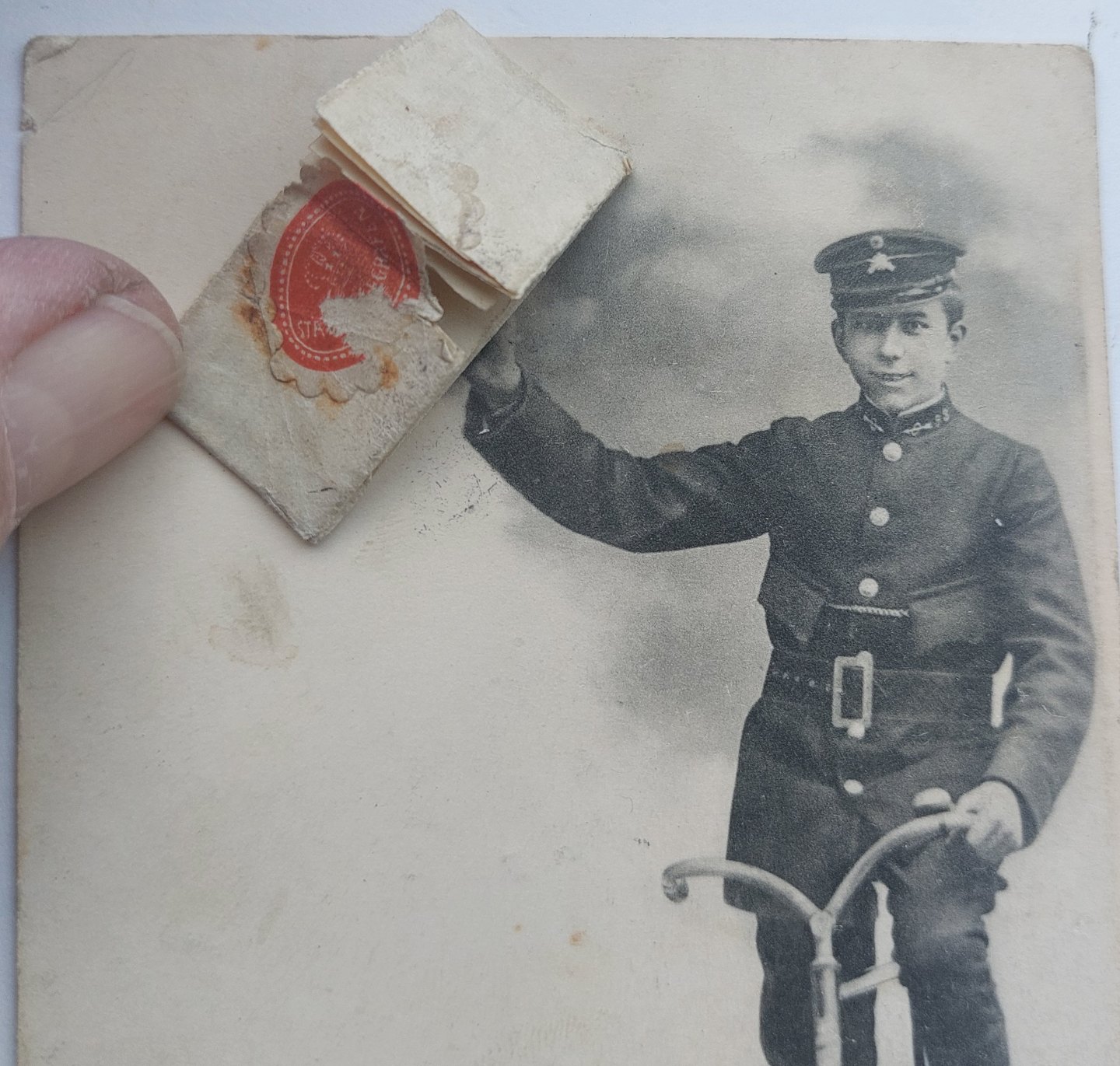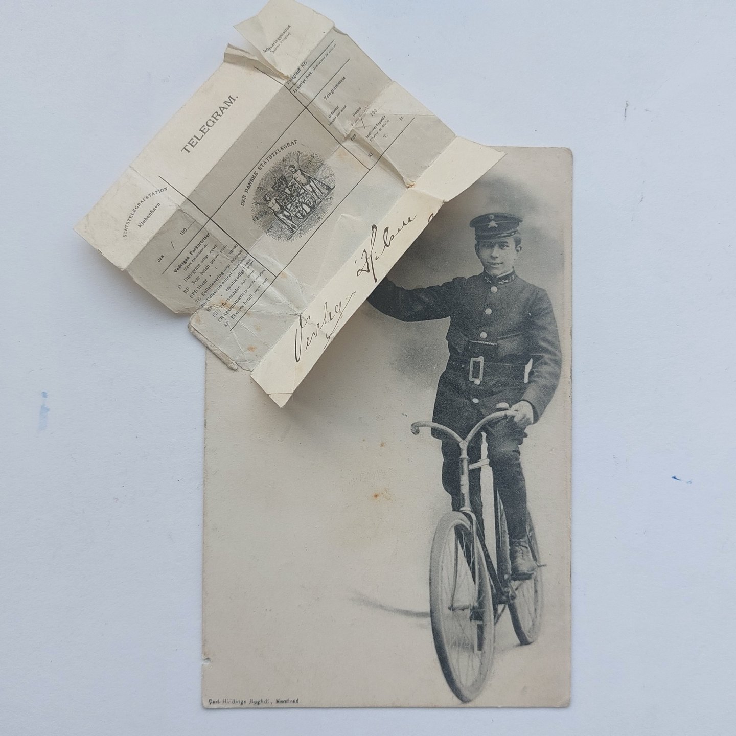 Postkort: Bud i uniform på cykel med telegram. Annulleret NÆSTVED i 1904. Mindre "hul" i nederste venstre hjørne. Lidt overflade brugsspor.Usædvanligt postkort. Stenders Forlag